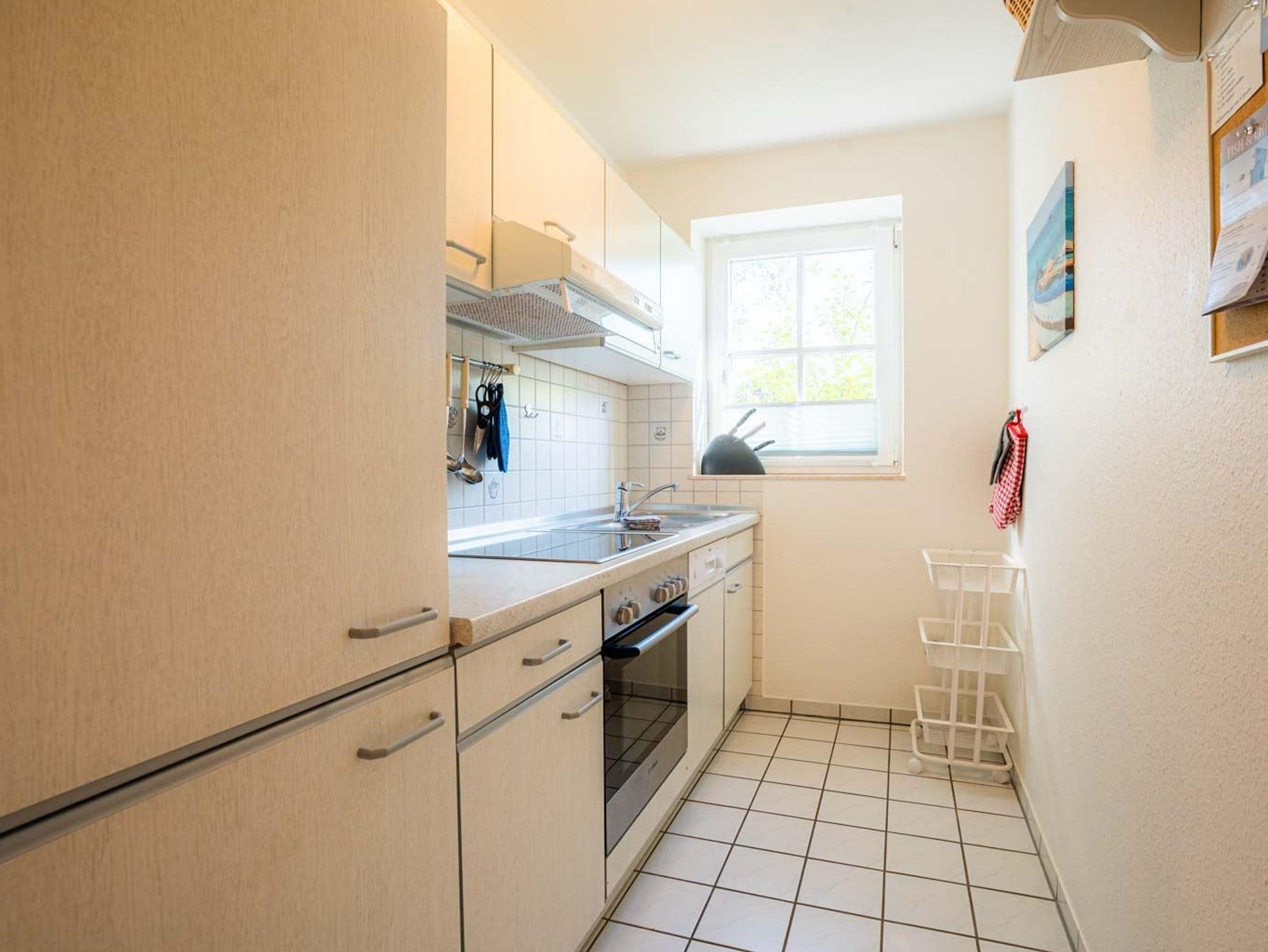 Separate Küche mit Backofen, Geschirrspüler und Kühlschrank mit Gefrierfach.