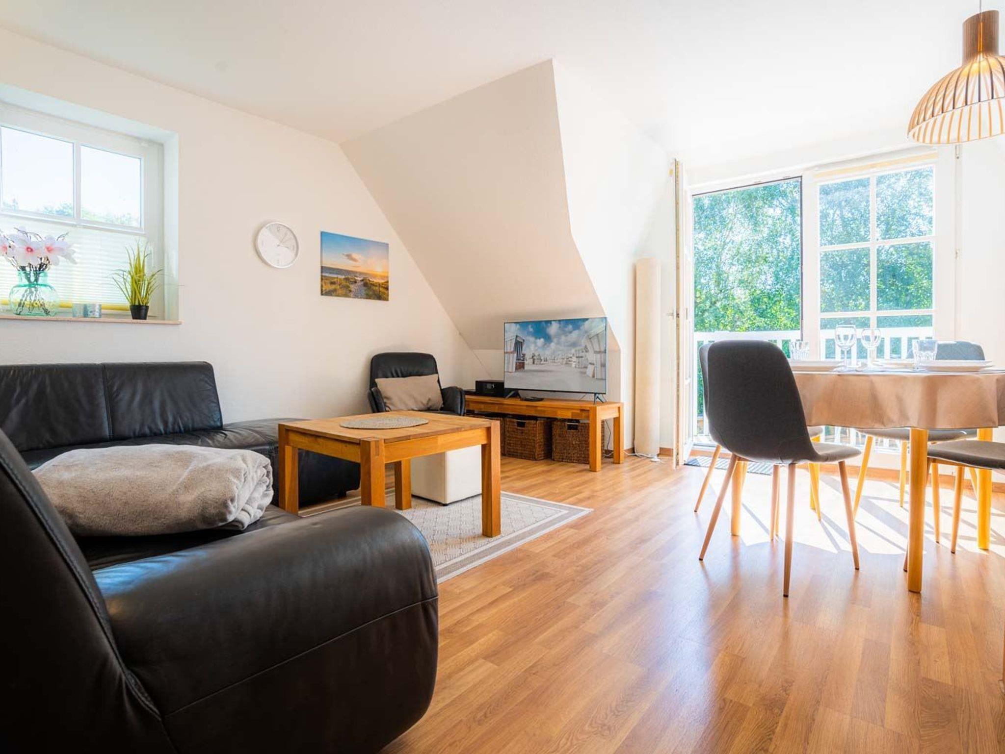 Wohnzimmer mit großem Ecksofa für 3-4 Personen, Sessel, TV (Sat), BluRay-Player, Radio mit CD-Player und Esstisch mit 5 Stühlen. Treppe zum DG. Direkter Zugang zum möblierten Balkon nach Westen zur Seeseite.