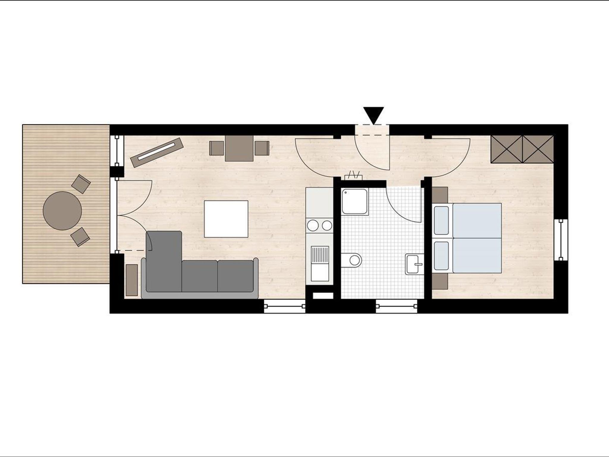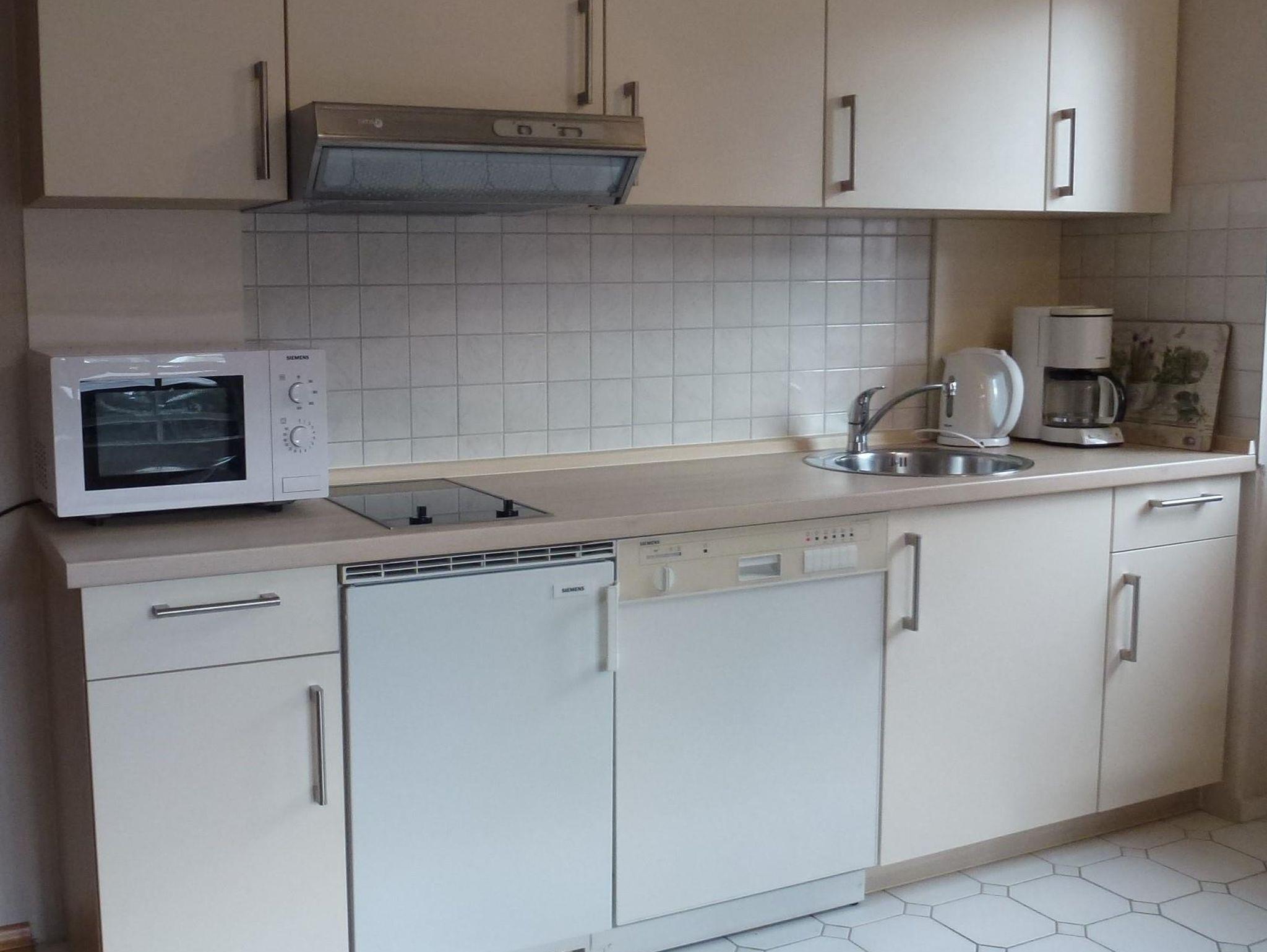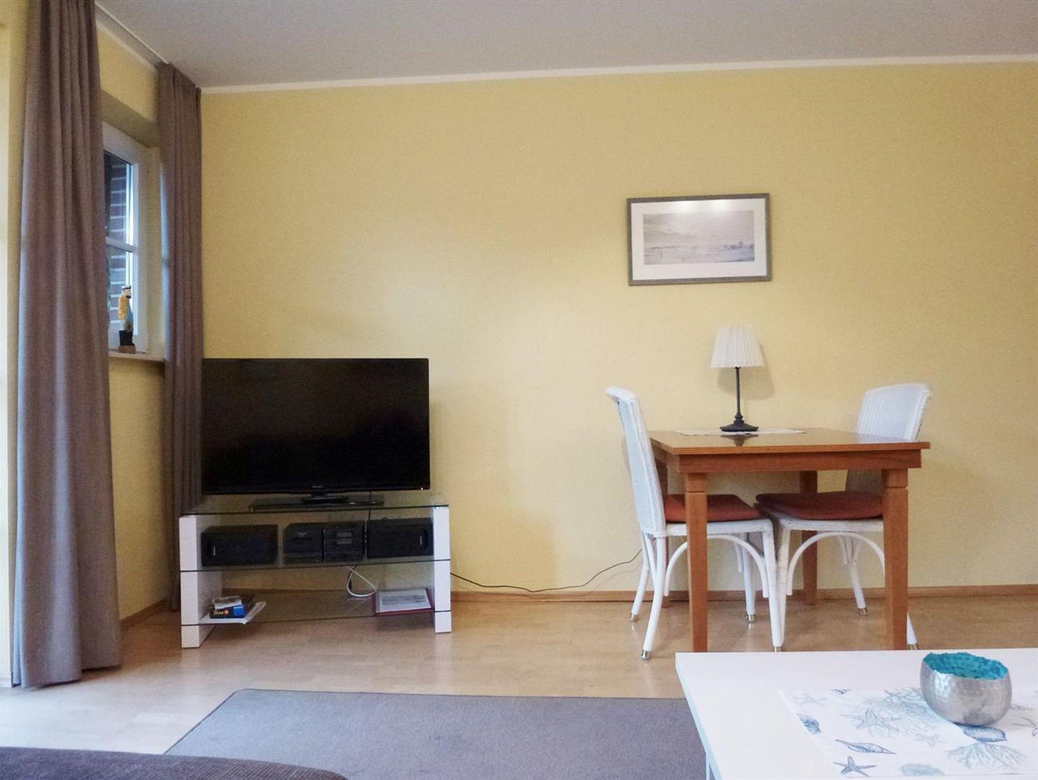 Großes Wohn-Esszimmer mit integrierter, komplett ausgestatteter Küchenzeile, einem Esstisch für 2 Personen, einer gemütlichen Sitzecke, Flachbild-Kabel-TV, CD/Radio-Stereo, südöstlich gelegene, geschützte und möblierte Terrasse. Schlafzimmer mit Doppelbett und einem geräumigen Kleiderschrank, taghelles Badezimmer mit Fussbodenheizung und ebenerdiger Dusche, Flur mit Garderobe und Spiegel. Alle Räume mit Insektenschutz, Parkettfußböden, Safe, kostenfreies WLAN verfügbar. Waschmaschine/Trockner im Haus, reservierter PKW-Stellplatz Nr. 12, überdachter Fahrradunterstand, Nichtraucher, keine Haustiere. Kostenlose Saunanutzung im Haus möglich.