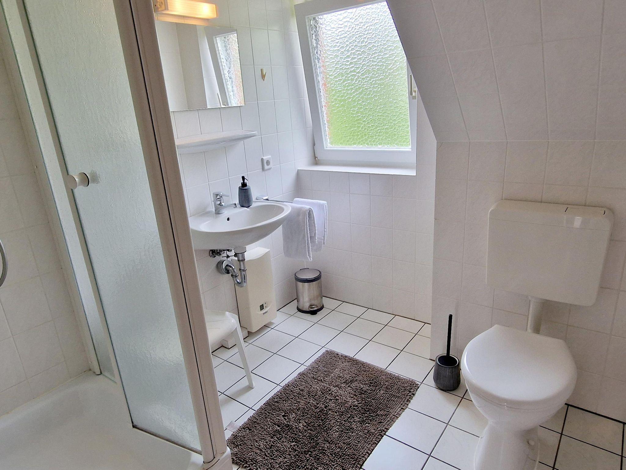Bad: Dusche, Waschbecken, WC,Hocker, Duschkabine