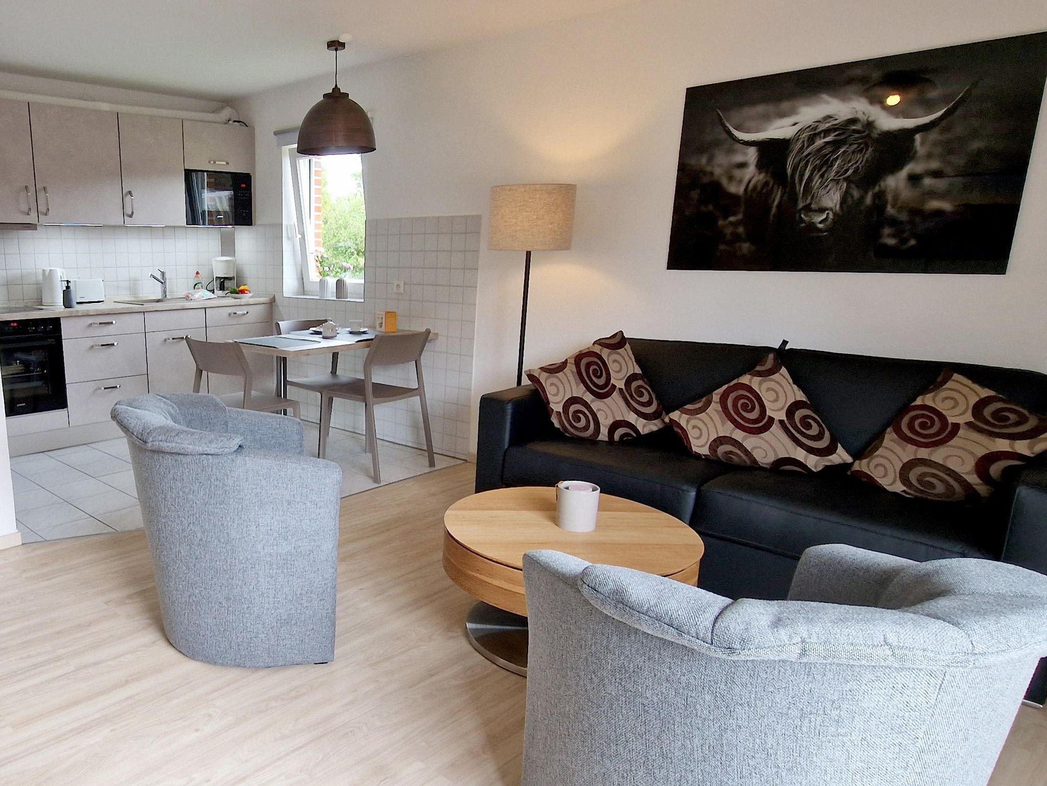 Gemütliche Ferienwohnung in St. Peter-Ording mit Balkon, moderner Küche und Blick auf den Leuchtturm.