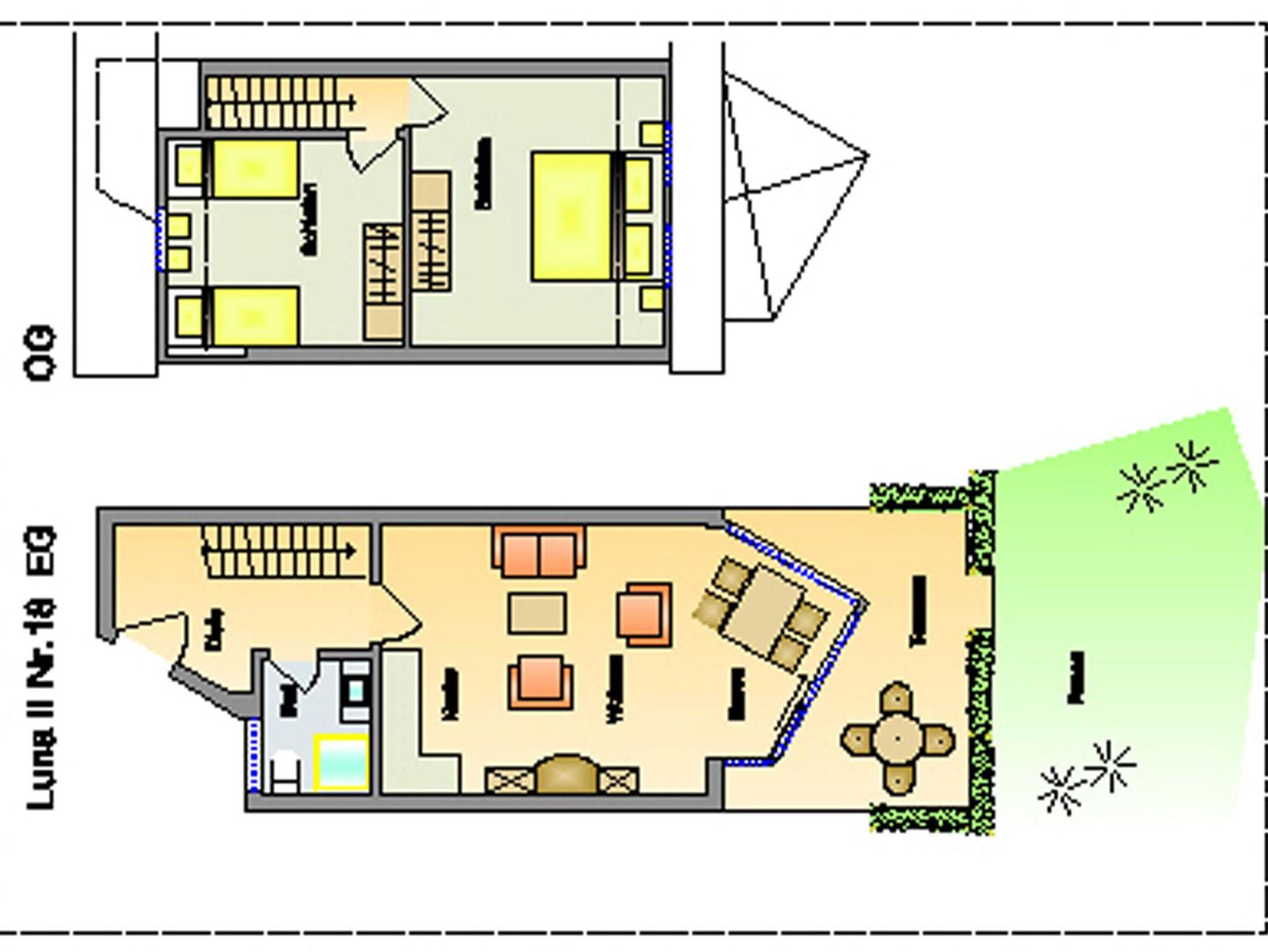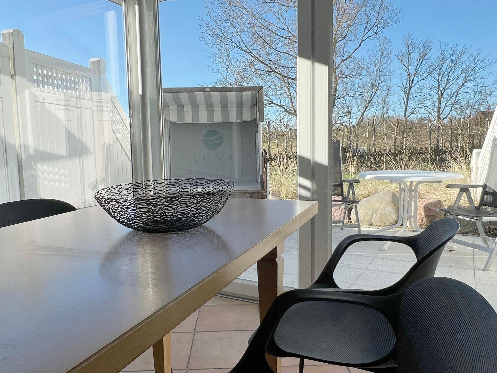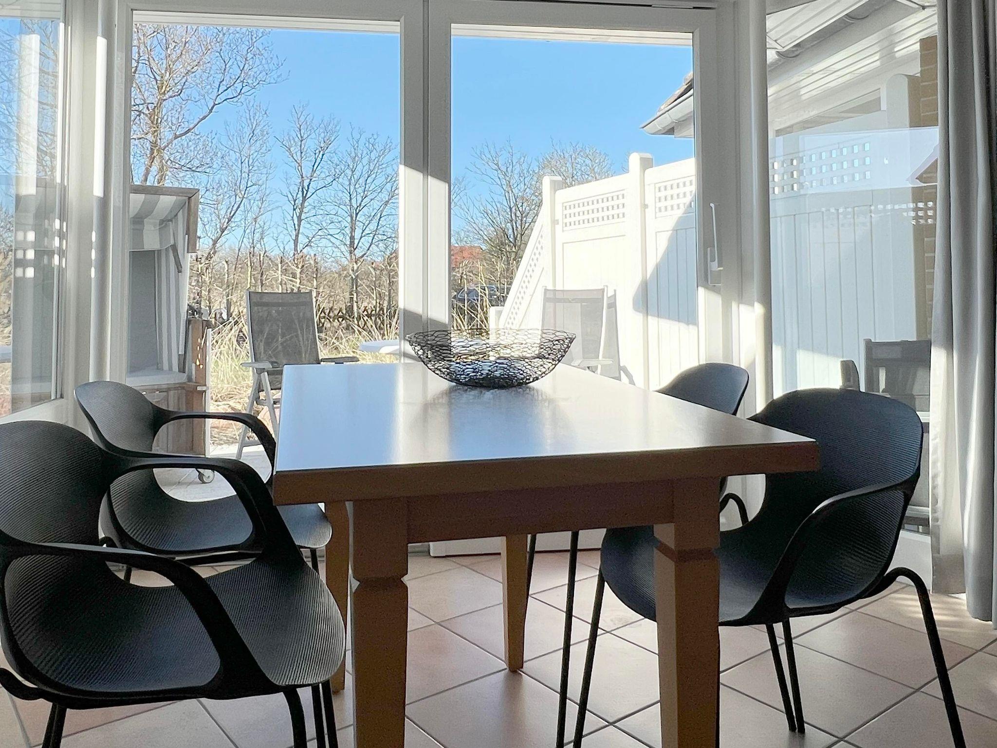 Im Erdgeschoss befindet sich die Eingangsdiele mit einer gradläufigen Treppe nach oben zu den beiden Schlafzimmern.1 Schlafraum mit Doppelbett 180x200cm mit getrennten Matratzen, ein Schlafraum mit 2 Einzelbetten (90x200cm). Das Zustellen eines Kinderreisebettes oder Hochstuhles ist kein Problem. Abgehend von der Eingangsdiele, der Wohn-Essraum mit voll ausgestatteter Küchenzeile, gemütlicher Sitzecke und Essecke im raumhoch verglasten Wintergarten, direkter Zugang zu einer, mit einer kleinen Sanddüne eingefassten Terrasse und Garten. Das Duschbad ist komplett neu in 2018, ausgestattet mit begehbarer Dusche, WC, Waschbecken und Außenfenster.
