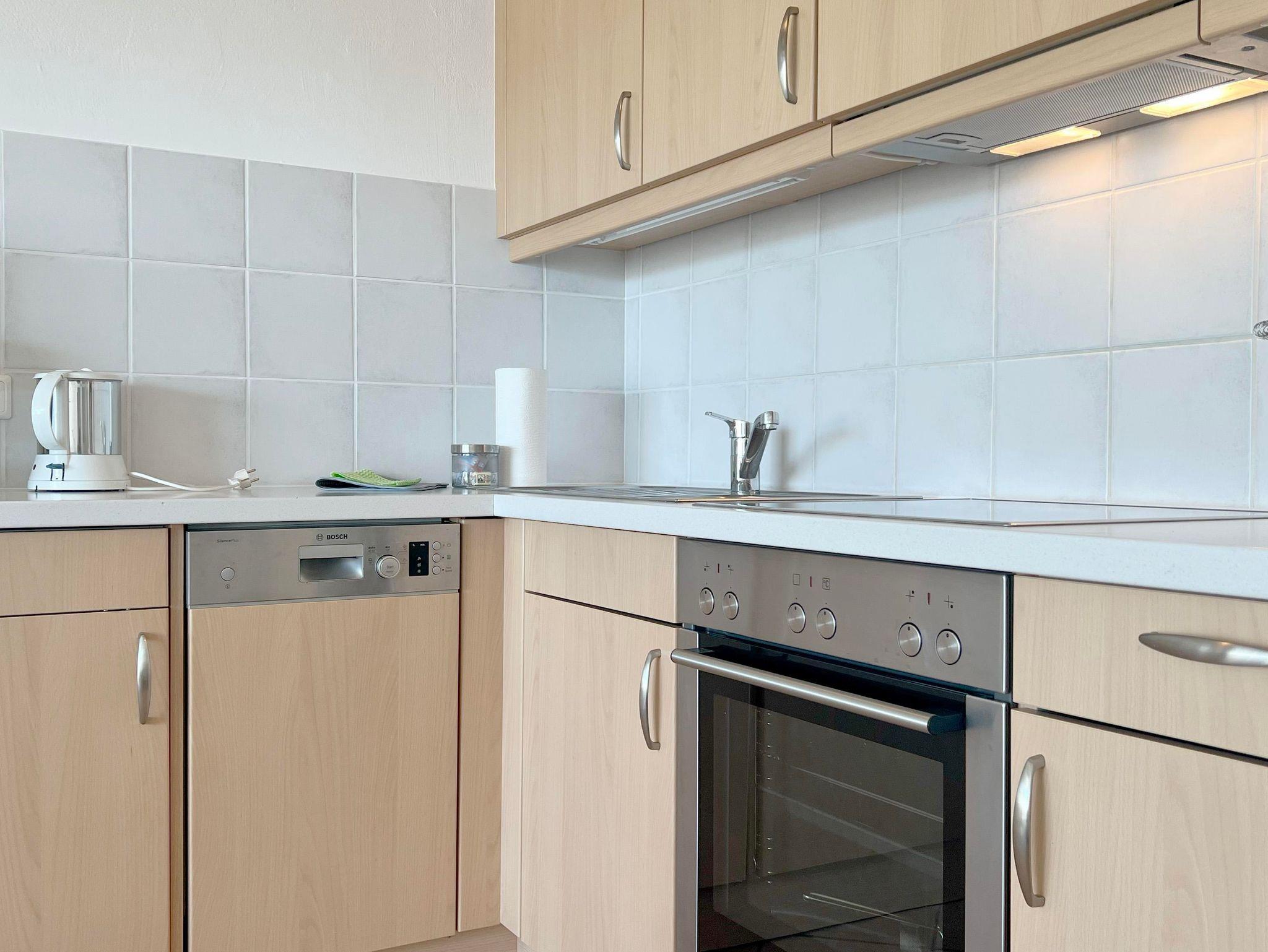 • komplett eingerichtete Küche, Backofen, Geschirrspüler, Kühlschrank mit Gefrierfach, Wasserkocher, Kaffeemaschine (Filter), Toaster.