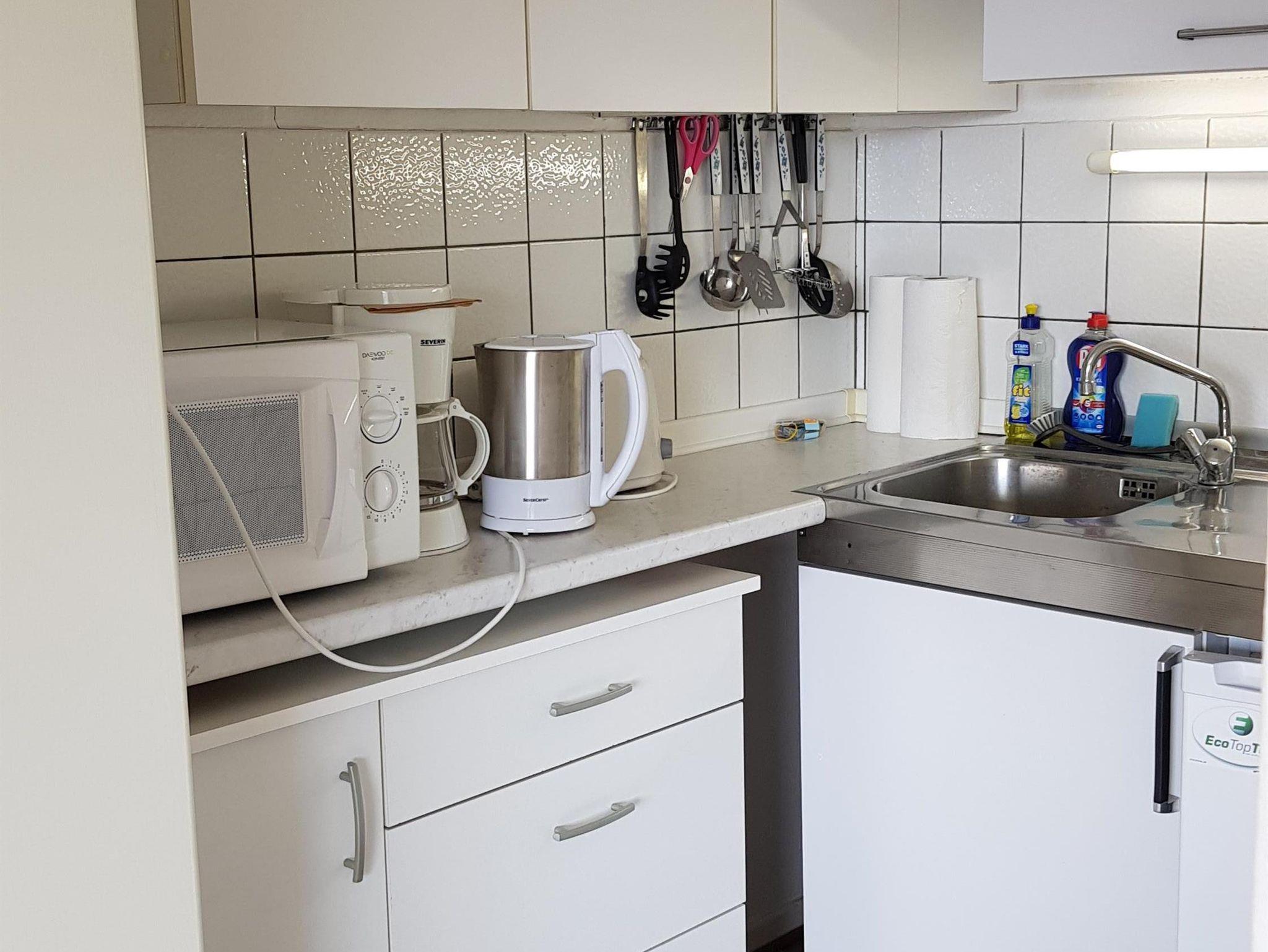 An den Wohnbereich schließt sich eine voll ausgestattete Pantryküche an. (Kühl- und Gefrierschrank, 2 Platten-Herd, Mikrowelle, Wasserkocher, Kaffeemaschine, Toaster, Eierkocher, Geschirr)