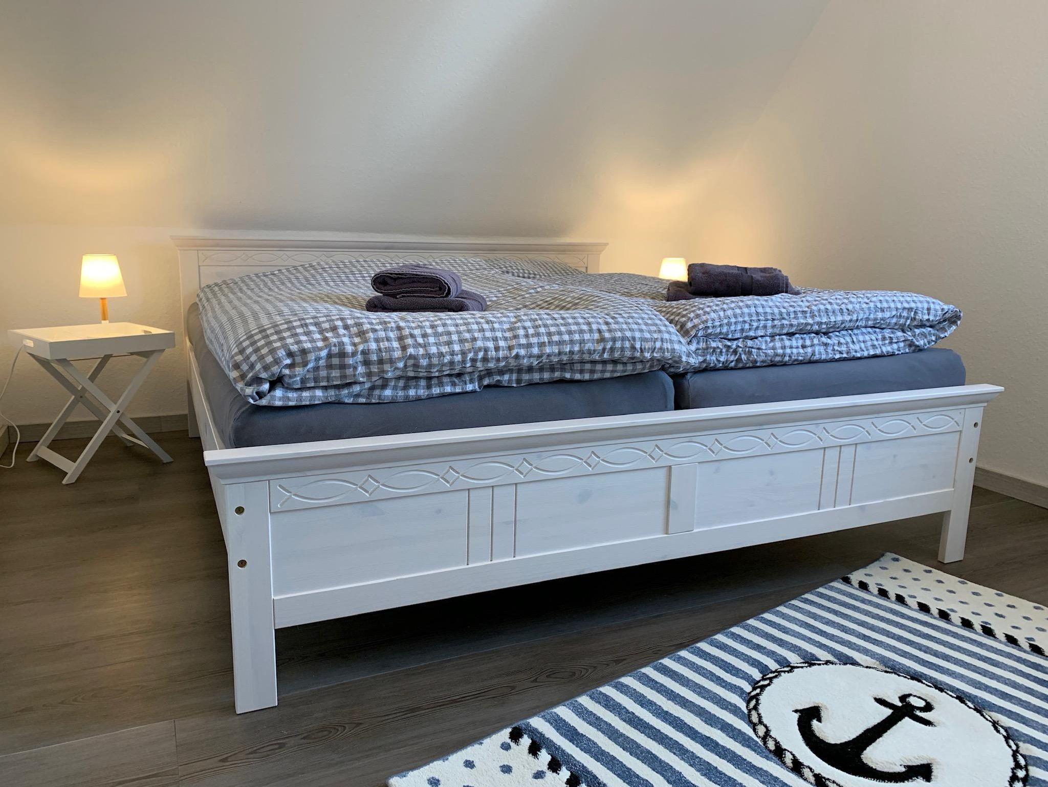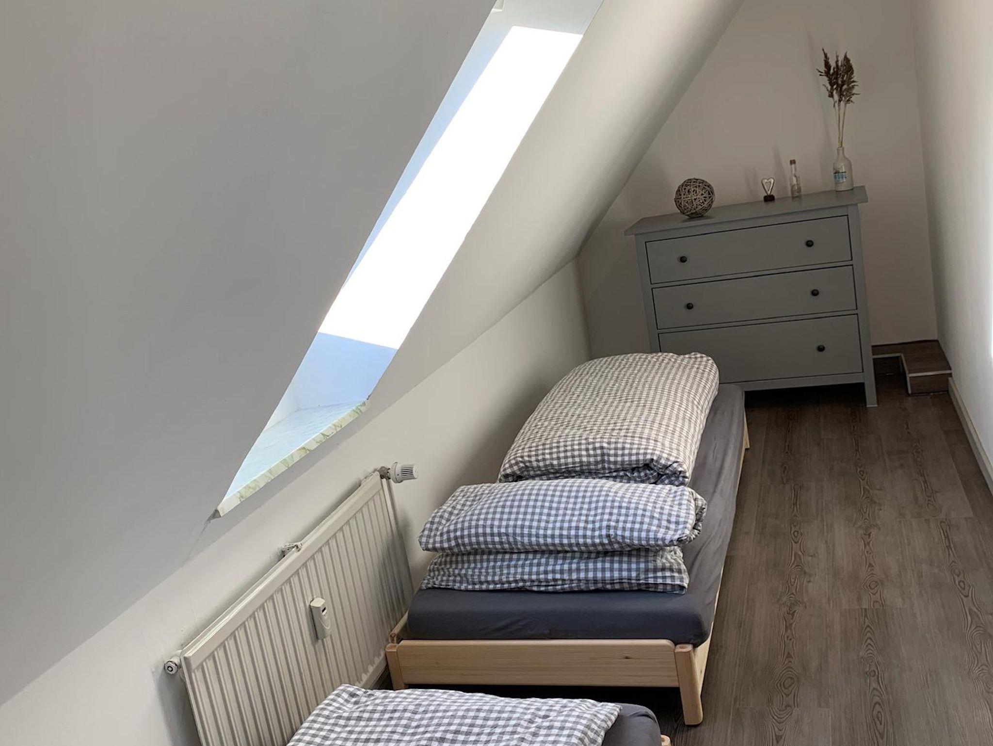 Im Dachspitz befindet sich das große Schlafzimmer mit einem 180 x 200 Doppelbett. Nebenan ist ein zweites Schlafzimmer mit zwei Einzelbetten, die ideal für zwei Mitreisende oder für die Kinder genutzt werden können.