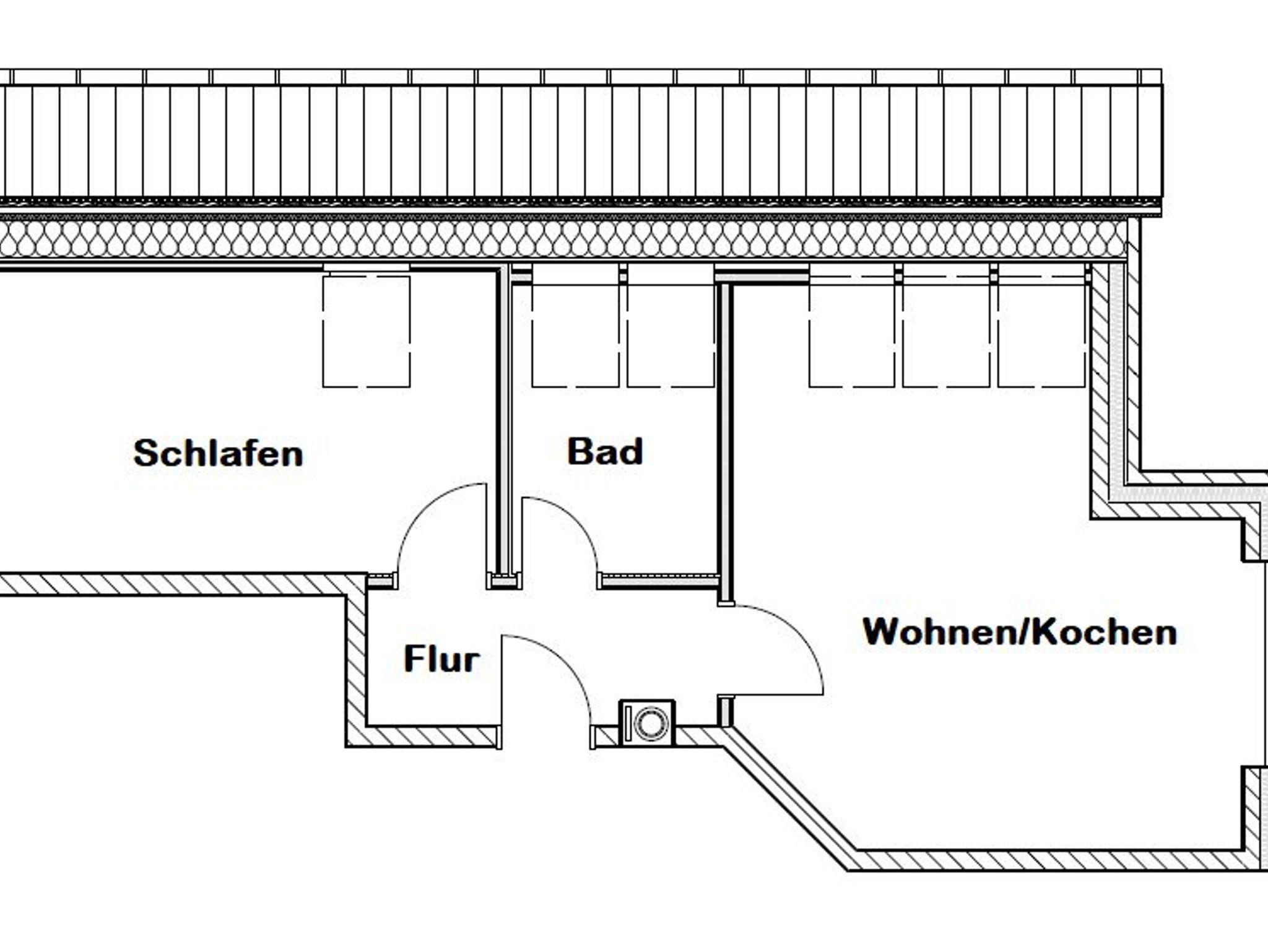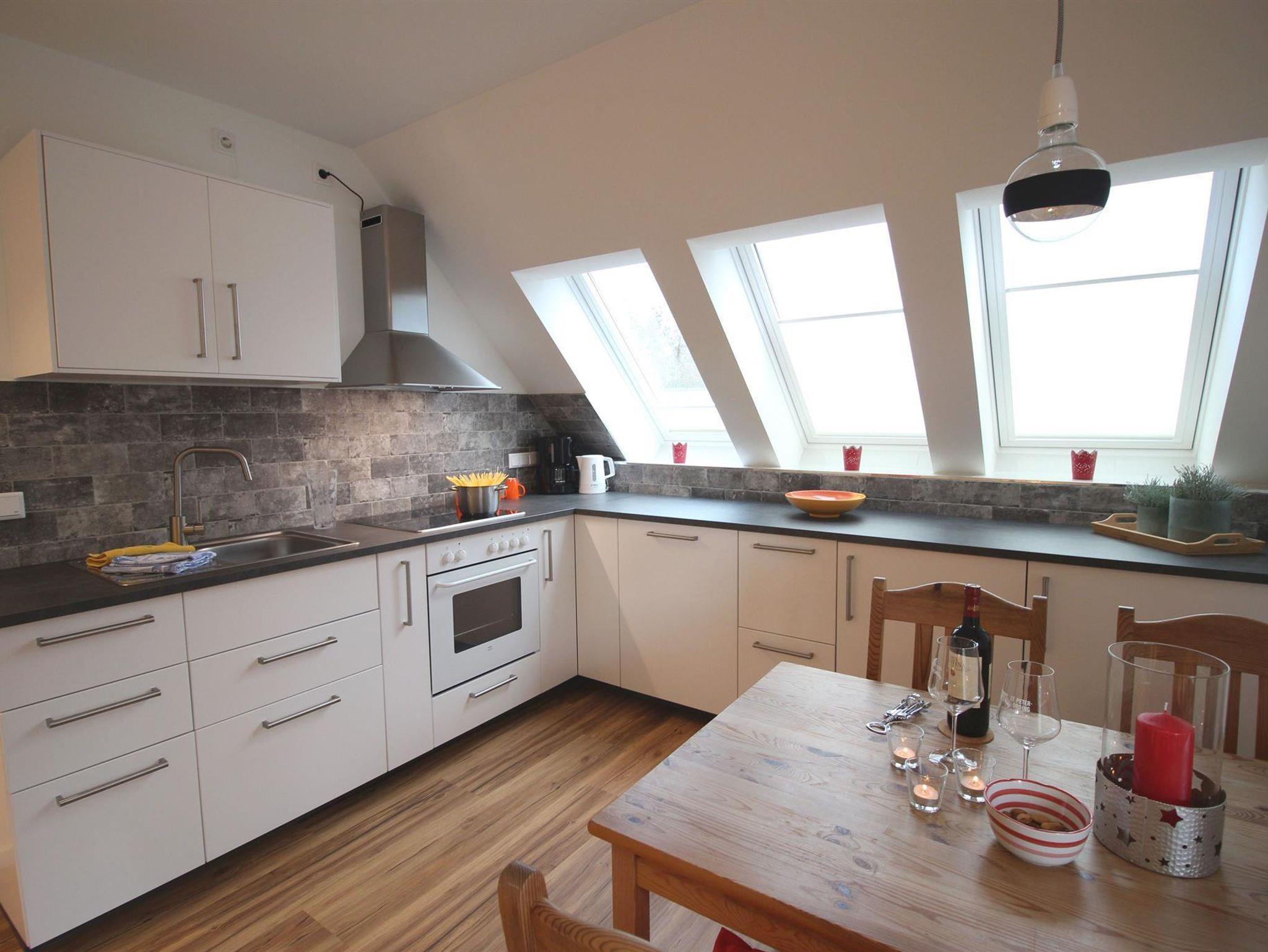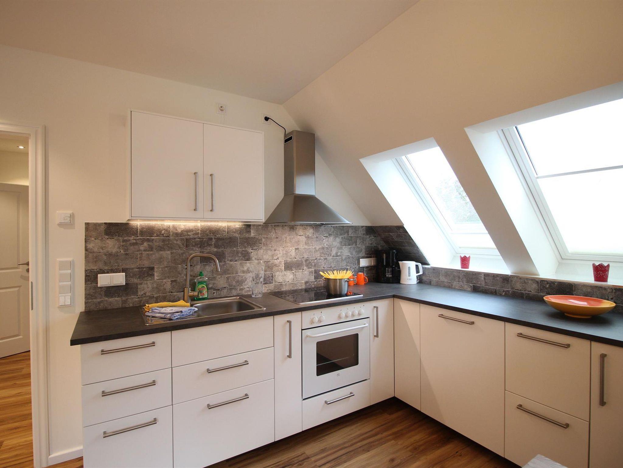 Sie verfügt über einen Blick in einen Garten mit zahlreichen Stauden und Obstbäumen. Vom Treppenhaus des Hauses gelangt man in den kleinen Flur der Wohnung und von dort in die Wohnküche, das Schlafzimmer und das Bad. Der Wohnzimmerbereich ist mit einer Couch, einem Tisch und einem Korbsessel ausgestattet. Die vielen Dachflächenfenster sowie die bodentiefen Fenster im Wohnbereich durchfluten die Dachgeschosswohnung mit reichlich Licht. Der Fernseher verfügt über einen Magenta®-TV-Anschluss. Die Küche ist mit Geschirrspüler, Kühlschrank mit Tiefkühlfach, 4-Plattenherd mit Backofen, Kaffeemaschine, Toaster und Wasserkocher ausgestattet und lädt mit ihrer ausgedehnten Arbeitsfläche zum Kochen ein. Außerdem ist im Küchenbereich ein Esstisch mit vier Stühlen vorhanden. Das Bad ist mit Dusche, WC und Haartrockner ausgestattet. Im Schlafzimmer befinden sich ein Doppelbett (1,80 x 2,00 m), ein Kleiderschrank und eine Kommode sowie ein Wecker.