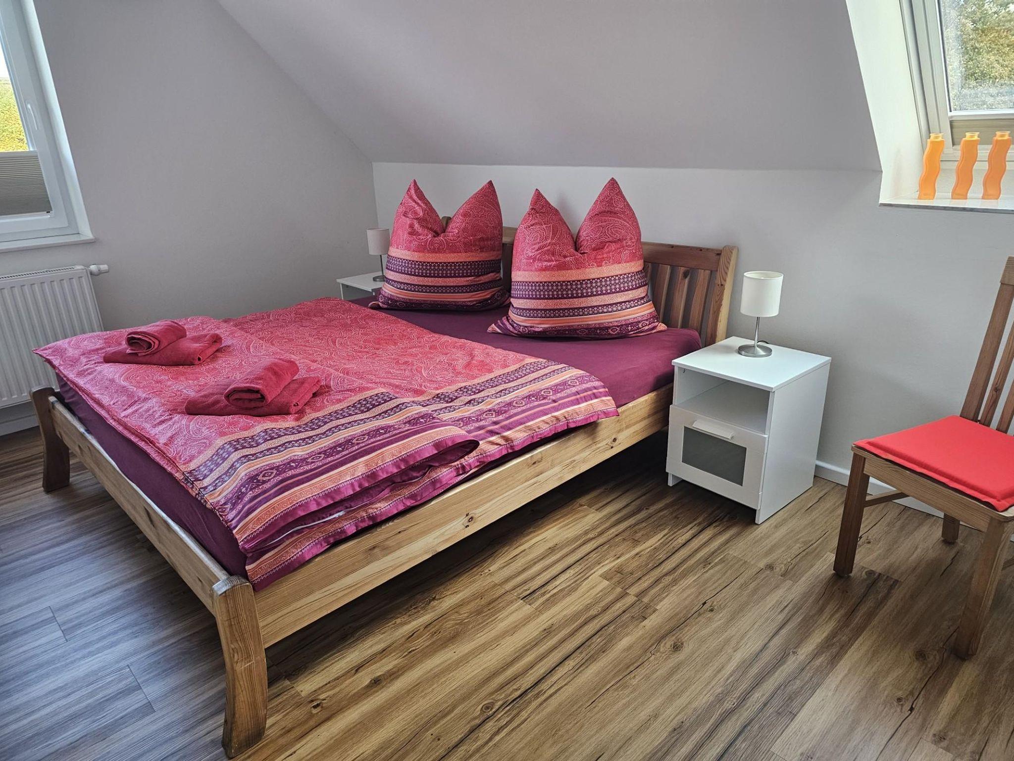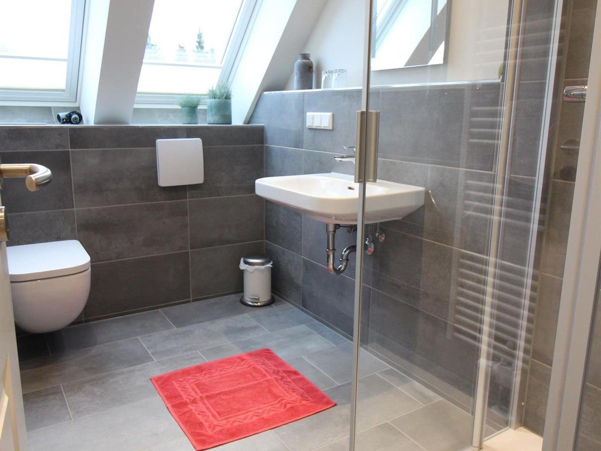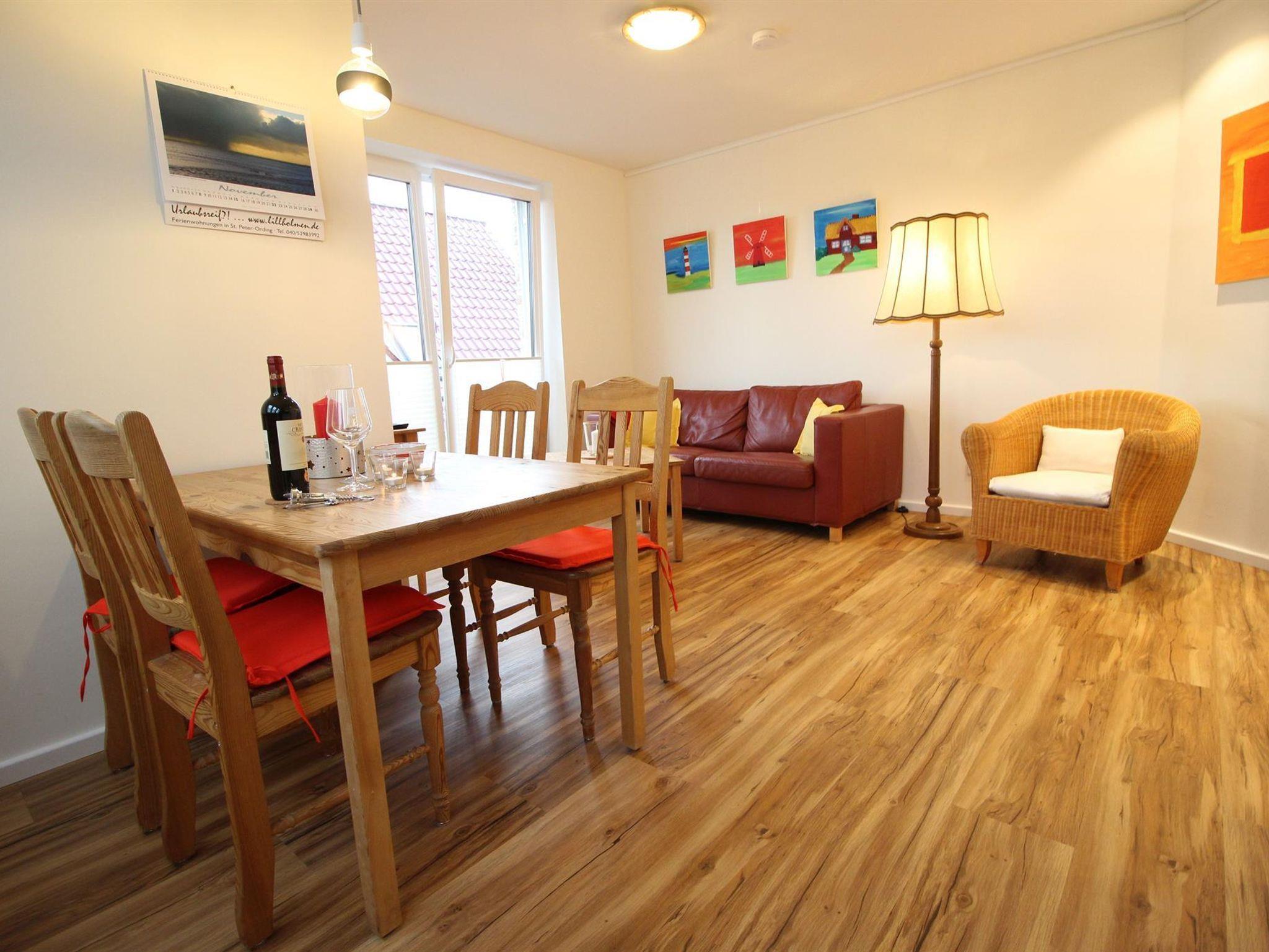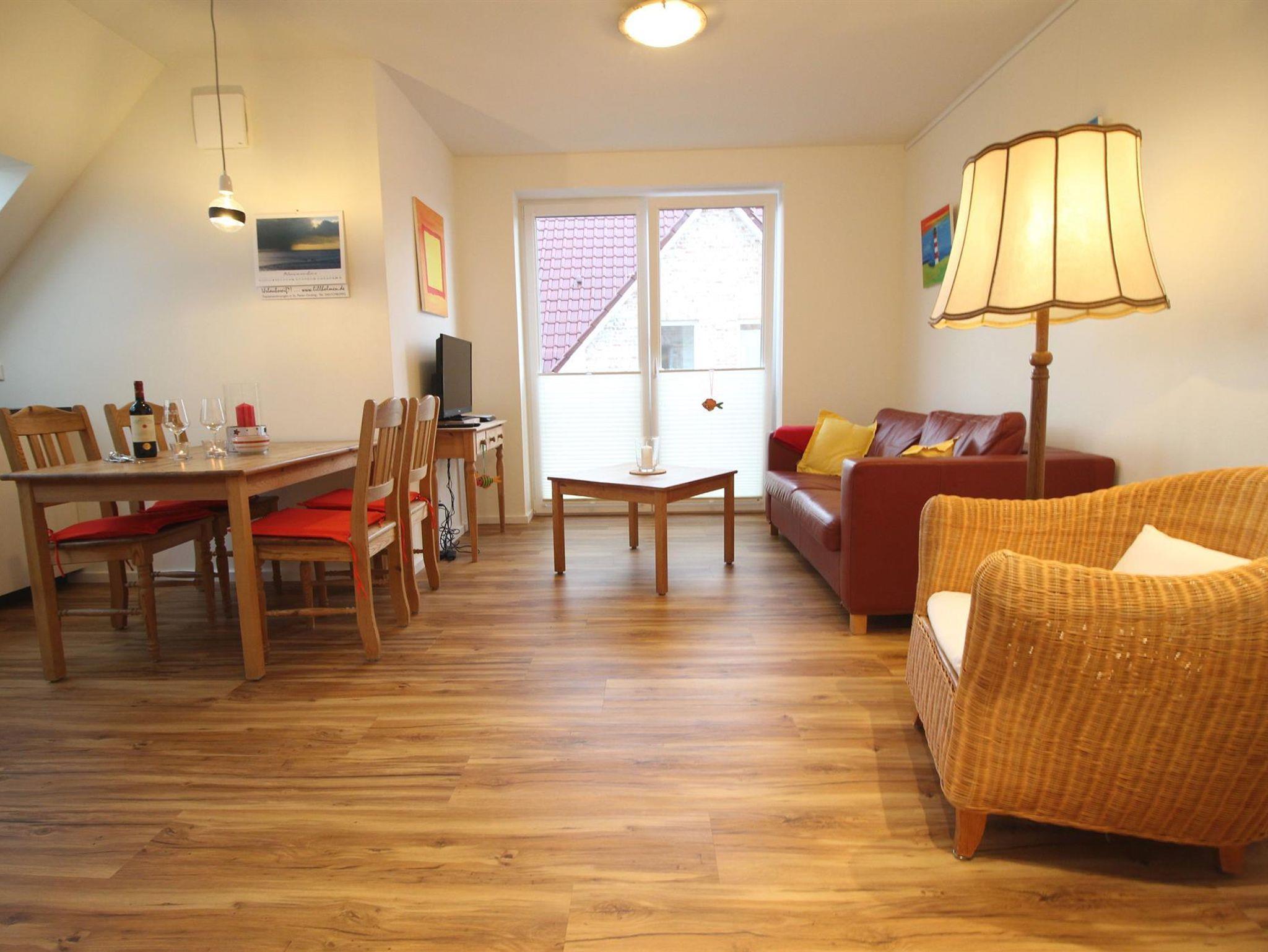 Sie verfügt über einen Blick in einen Garten mit zahlreichen Stauden und Obstbäumen. Vom Treppenhaus des Hauses gelangt man in den kleinen Flur der Wohnung und von dort in die Wohnküche, das Schlafzimmer und das Bad. Der Wohnzimmerbereich ist mit einer Couch, einem Tisch und einem Korbsessel ausgestattet. Die vielen Dachflächenfenster sowie die bodentiefen Fenster im Wohnbereich durchfluten die Dachgeschosswohnung mit reichlich Licht. Der Fernseher verfügt über einen Magenta®-TV-Anschluss. Die Küche ist mit Geschirrspüler, Kühlschrank mit Tiefkühlfach, 4-Plattenherd mit Backofen, Kaffeemaschine, Toaster und Wasserkocher ausgestattet und lädt mit ihrer ausgedehnten Arbeitsfläche zum Kochen ein. Außerdem ist im Küchenbereich ein Esstisch mit vier Stühlen vorhanden. Das Bad ist mit Dusche, WC und Haartrockner ausgestattet. Im Schlafzimmer befinden sich ein Doppelbett (1,80 x 2,00 m), ein Kleiderschrank und eine Kommode sowie ein Wecker.