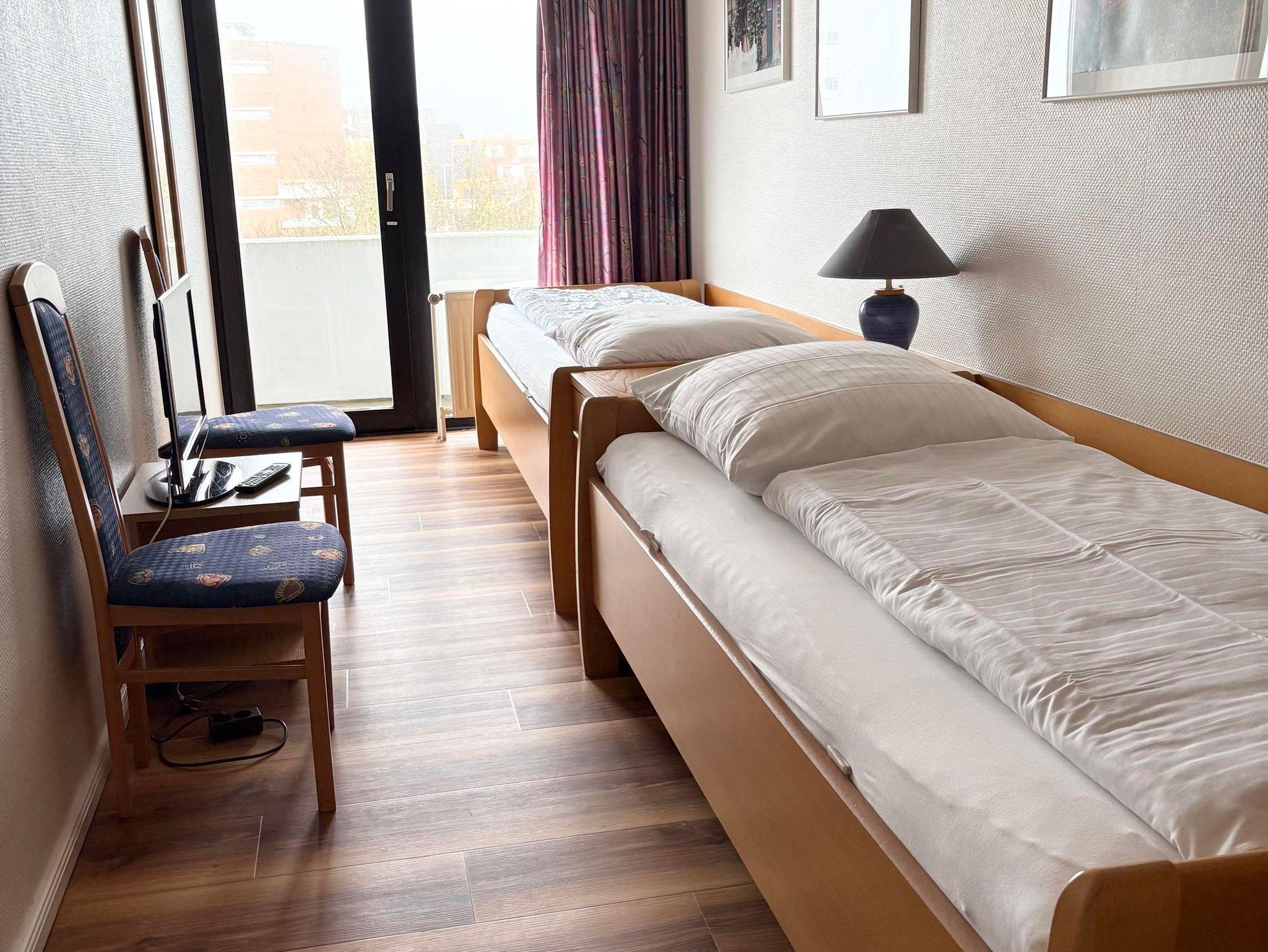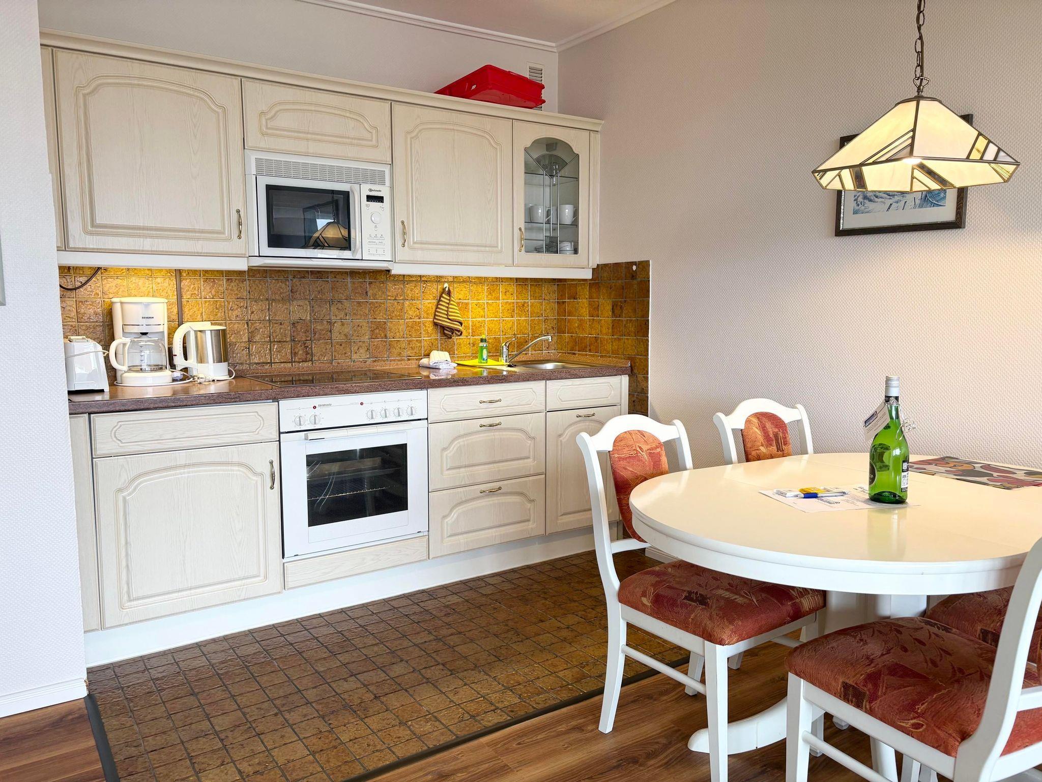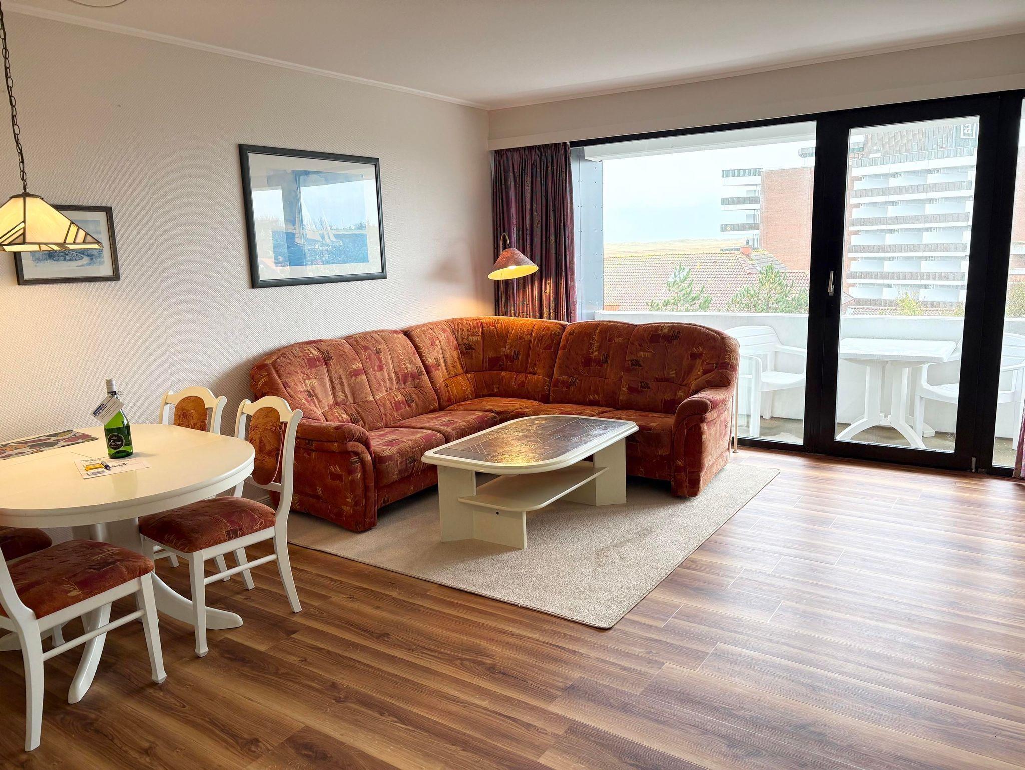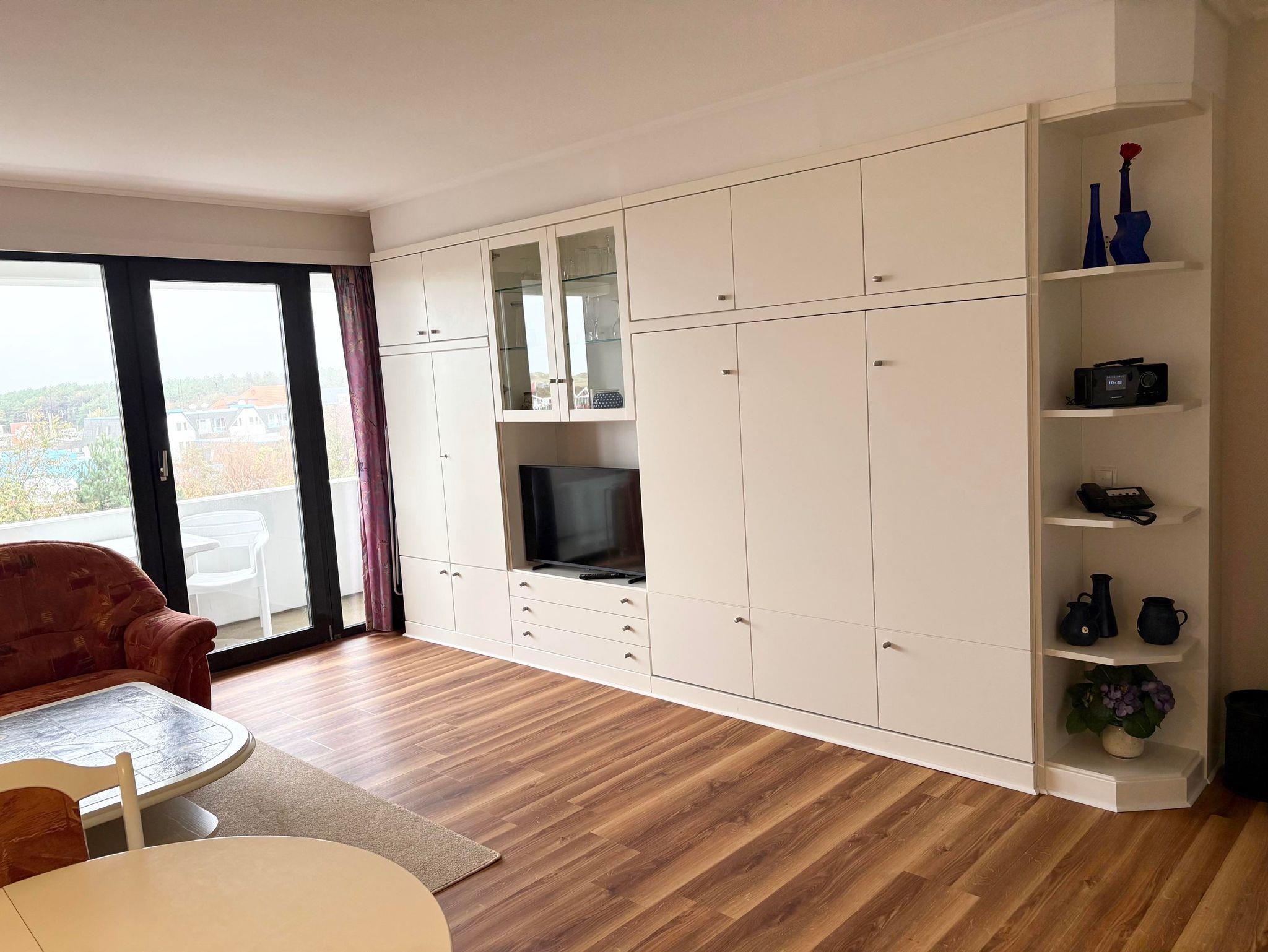 App.-Nr. 63, Typ 2, III. OG, Nord-Westlage Schlafraum mit 2 Einzelbetten, Wohn-Schlafraum mit 2 Wandschrankbetten, Teppichboden, Sitzecke, Essecke, Küchenzeile mit Backofen und Mikrowelle, Dusche/WC, 2 x Flachbildschirmer, Durchwahltelefon, Balkon, PKW-Platz-Nr. 63, Aufzug im Haus und Fahrradkeller. Rezeption, Brötchenservice, Schwimmbad, Sauna kostenpflichtig, kostenfreier Internetzugang (LAN1-Germania). Bettwäsche wird einmalig bei Einzug gestellt. Handtücher können gegen Gebühr entliehen werden.