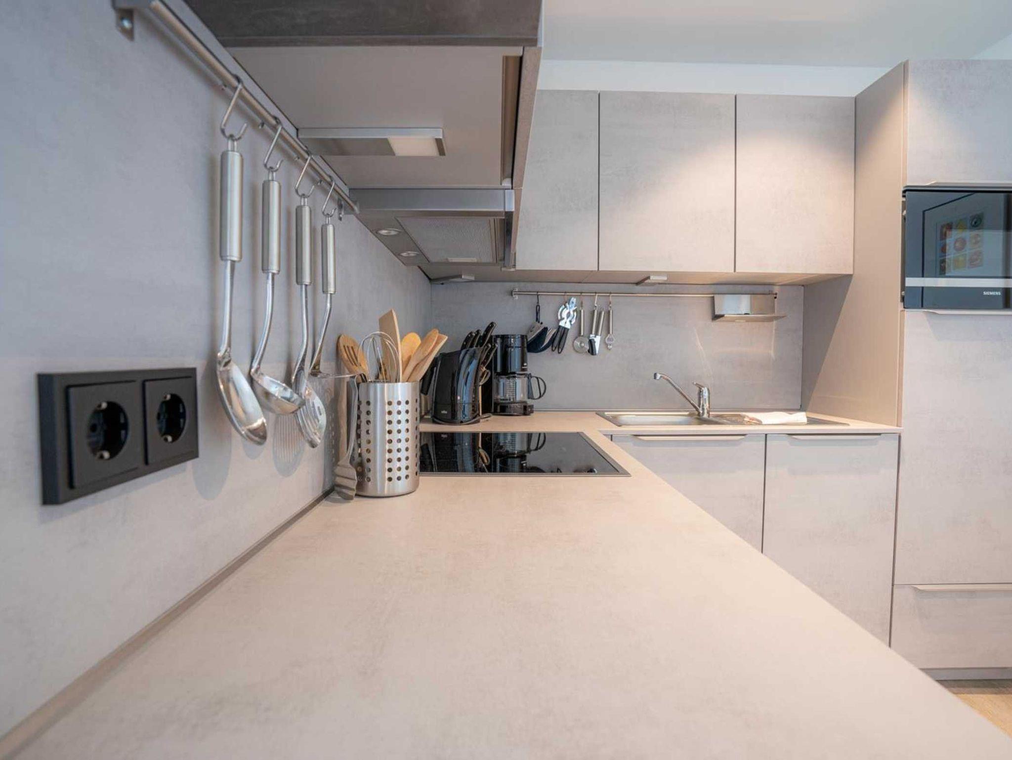 Wohnzimmer mit Ecksofa, Relax-Sessel, Elektro-Kamin mit Heizgebläse, Essplatz für 4 Personen, großes SMART-TV (Sat, SKY-Abo) und Radio. Direkter Zugang zum möblierten Balkon nach Südosten. Offene Küche mit Induktionsherd, Backofen, Mikrowelle, Geschirrspüler und Kühlschrank mit Gefrierfach.