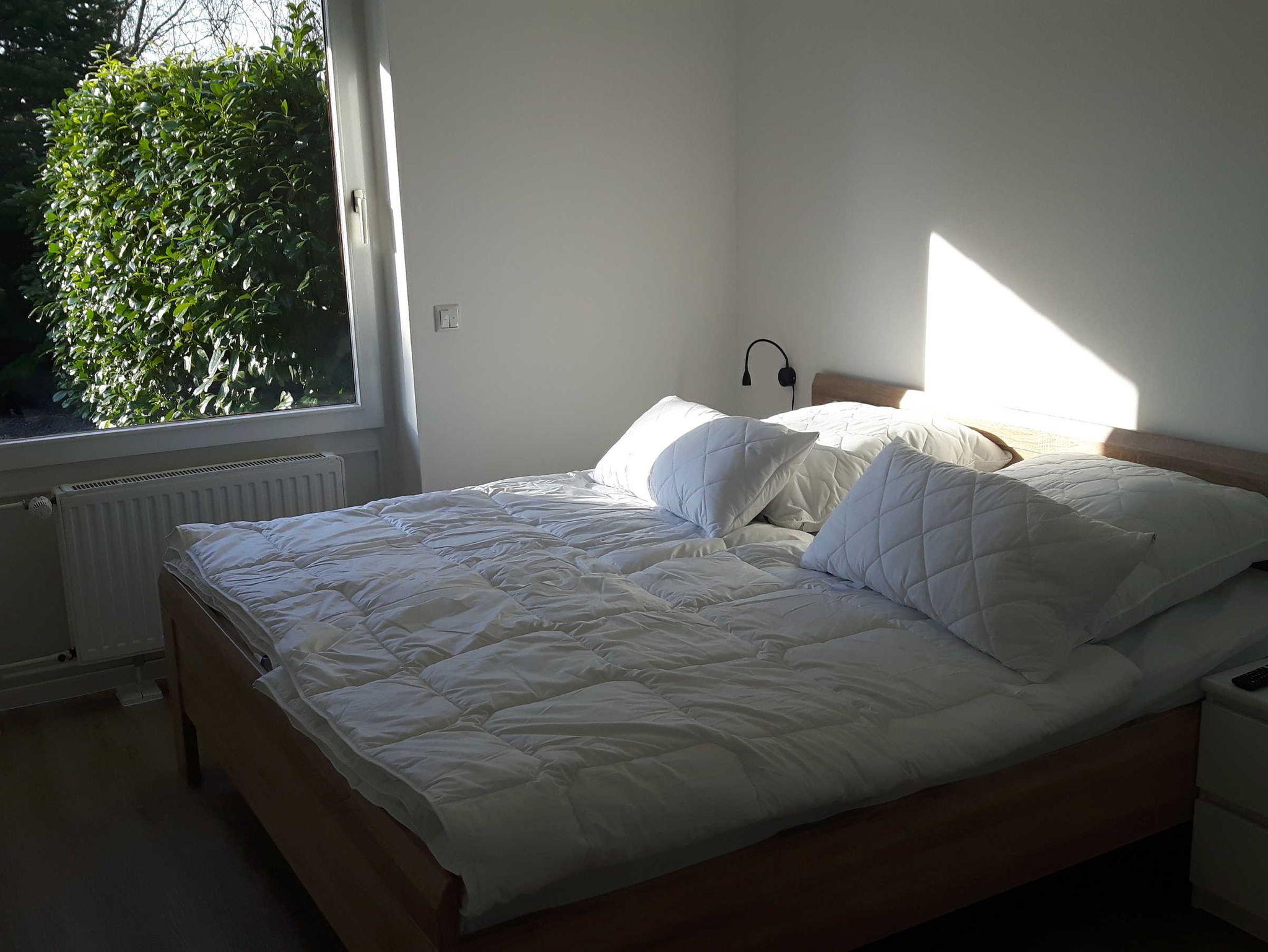 Modern und geschmackvoll eingerichtete helle Doppelhaushälfte. Zwei separate Schlafzimmer (das größere mit Doppelbett 160x200cm und das kleinere mit zwei Einzelbetten von je 90x200cm) mit großen Eckschränken. Wohnzimmer mit einem Dauerschlafsofa (mit Lattenrost und innenliegender Matratze von 160x200cm). Flat-TV´s mit Satellitenanschluss im großen Schlafzimmer (43 Zoll) sowie im Wohnzimmer (55 Zoll). W-LAN ohne Gebühr. Separate, modern eingerichtete voll ausgestattete Küche mit allen Elektoreinrichtungen (Kühlschrank mit Tiefkühlfach, Geschirrspüler, selbstreinigender Backofen, Induktionsherd mit vier Kochplatten, elektrischer Wasserkocher, Kaffeefiltermaschine, Toaster, Mixer, Handrührgerät etc.) plus Esstisch für bis zu sechs Personen. Duschbad mit großer Duschkabine mit Glasabtrennung sowie Waschmaschine. Alle Räume sind mit hellem, unempfindlichem Designboden ausgestattet. Wohn- und Schlafräume mit dimmbarem Licht. Elektrische Rollläden sichern alle Räume (einschließlich der Eingangstür, falls gewünscht) und verdunkeln die Zimmer. Ferner stehen Staubsauger, Bügelbrett/Bügeleisen und Fön zur Nutzung bereit! Wäschespinne und Wäscheständer im Außenbereich. Gartenterrasse mit zwei Liegen, sechs Gartenstühlen und großem Esstisch sowie Holzkohlegrill.