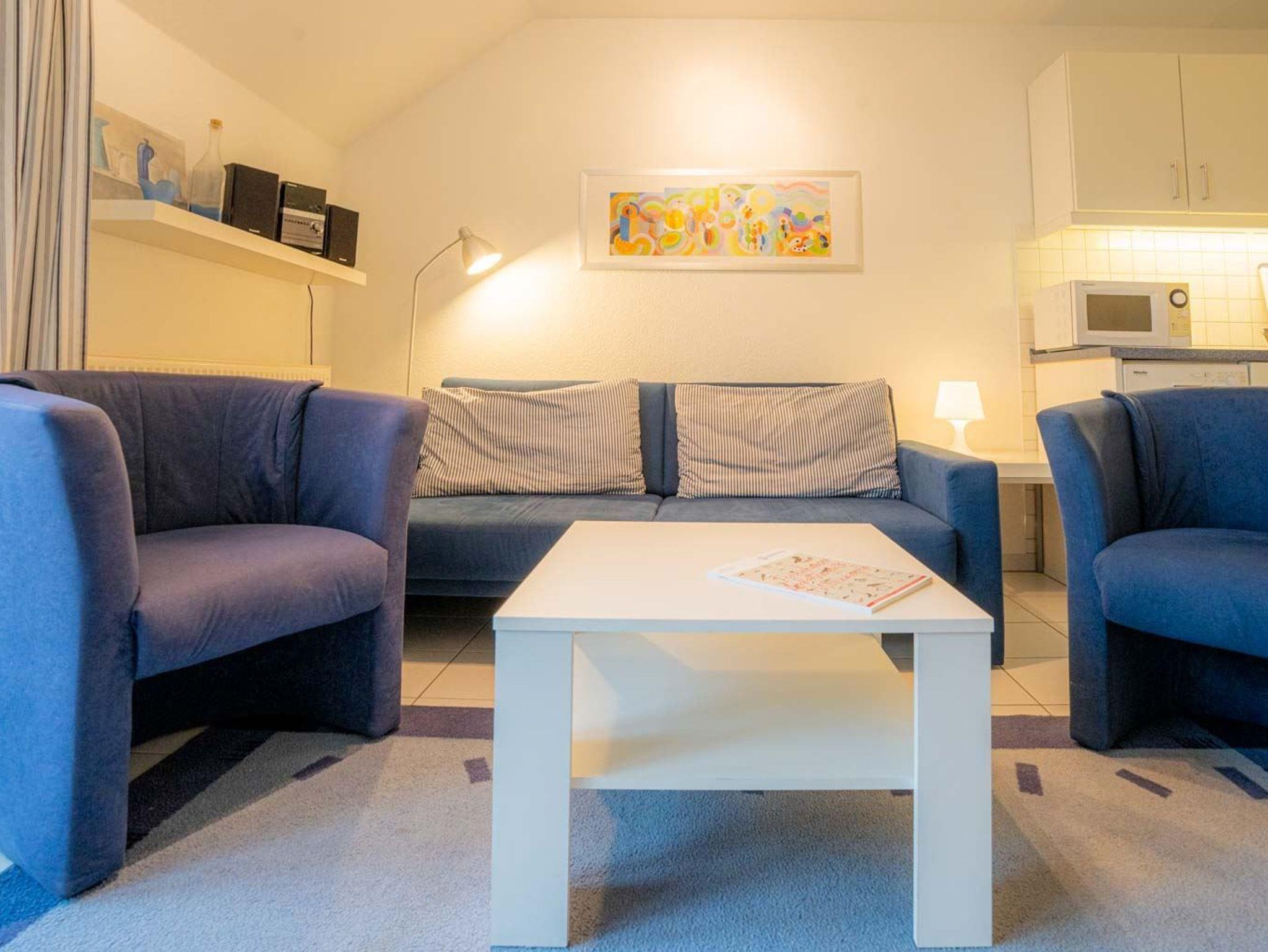Wohnzimmer mit ausziehbarem Schlafsofa (170 x 190cm), 2 Sesseln, TV (Sat), DVD-Player, Stereoanlage mit CD-Player und Esstisch mit 4 Stühlen. Direkter Zugang zum windgeschützten, möblierten Südbalkon mit schönem Ausblick über den Deich in Richtung Meer. Offene Küche mit Backofen, Geschirrspüler, Kühlschrank mit Gefrierfach und Mikrowelle.