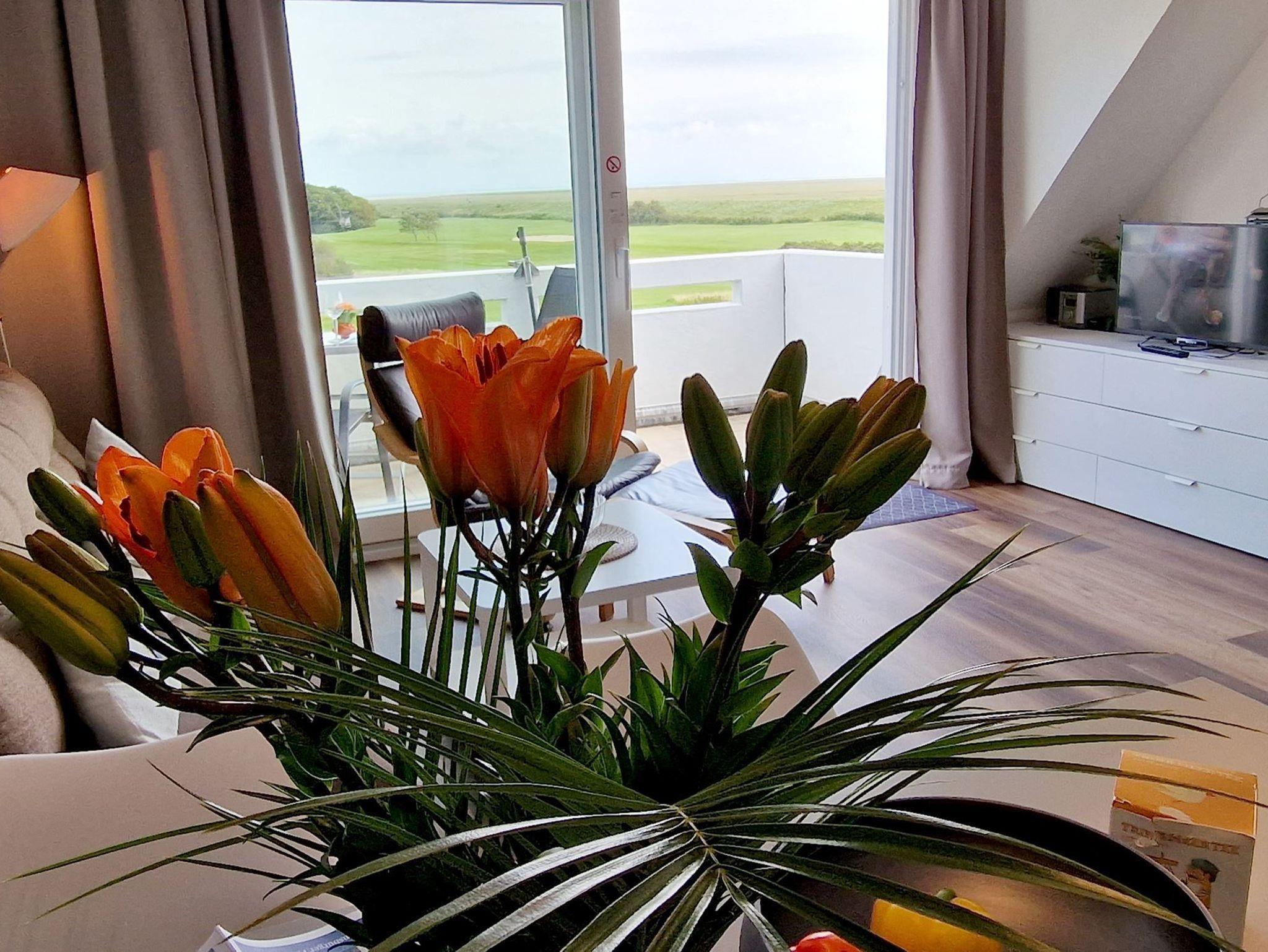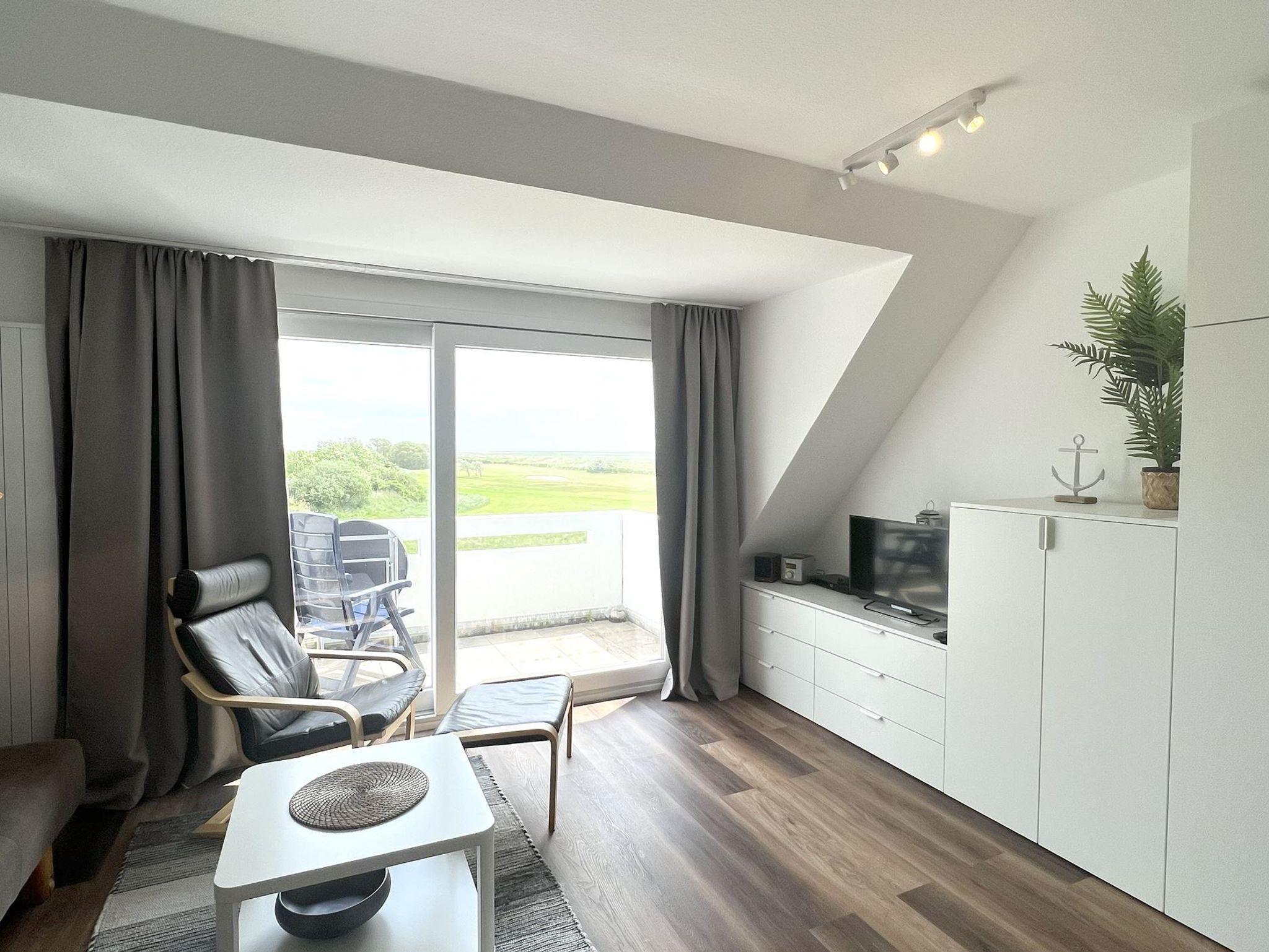 Helle 2-Zimmer-Ferienwohnung mit Balkon, Golfplatz- und Meerblick in St. Peter-Ording – ideal für entspannte Urlaubstage.