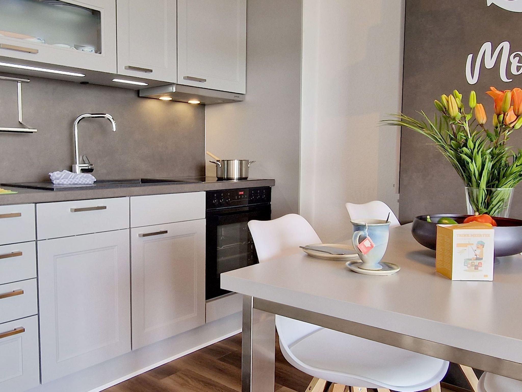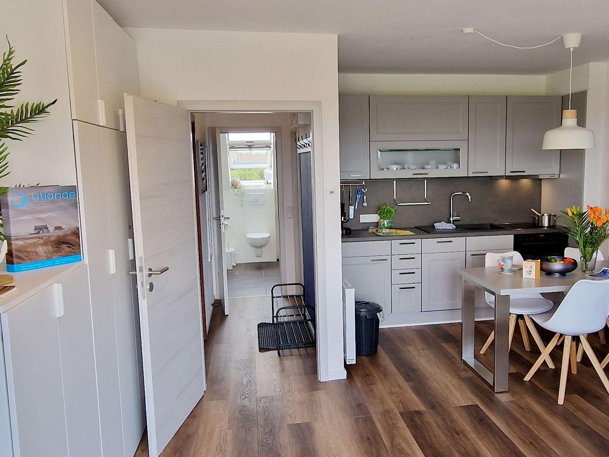 Küche: Die liebevoll gestaltete friesische Küchenzeile im Wohnzimmer ist mit Ceranfeld, Geschirrspüler und Backofen ausgestattet ? ideal für kulinarische Erlebnisse!