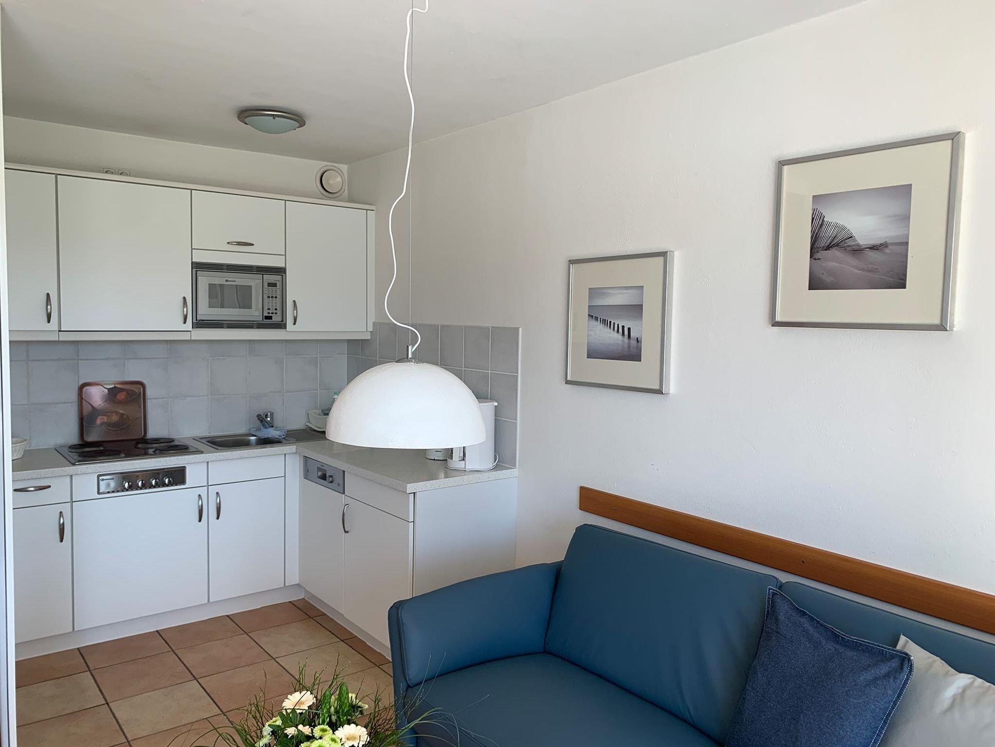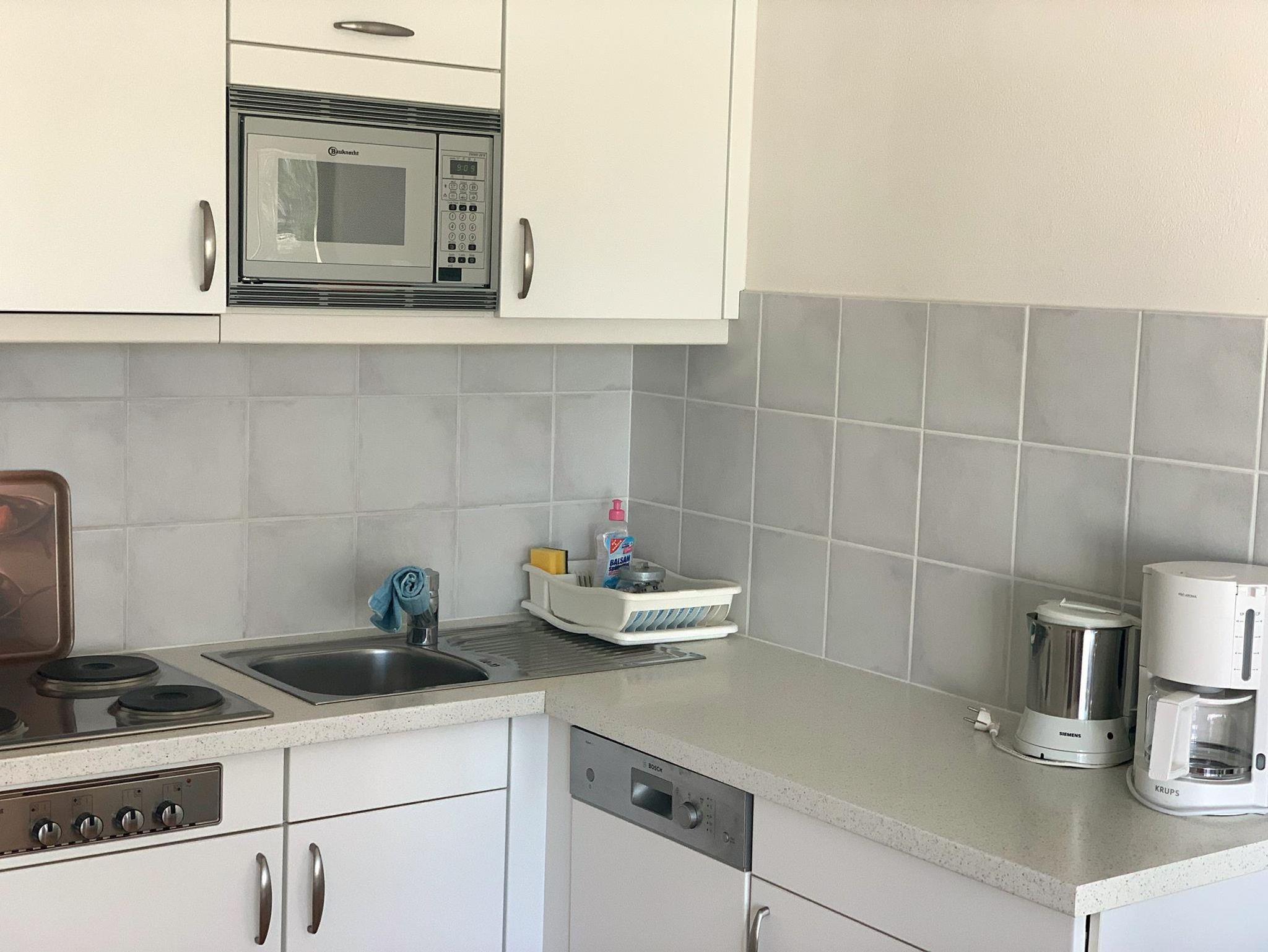 • komplett eingerichtete Küche, Mikrowelle, Geschirrspüler, Kühlschrank mit Gefrierfach, Wasserkocher, Kaffeemaschine (Filter), Toaster.