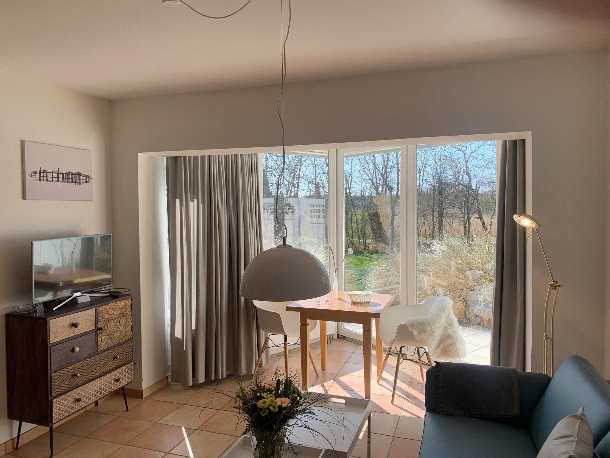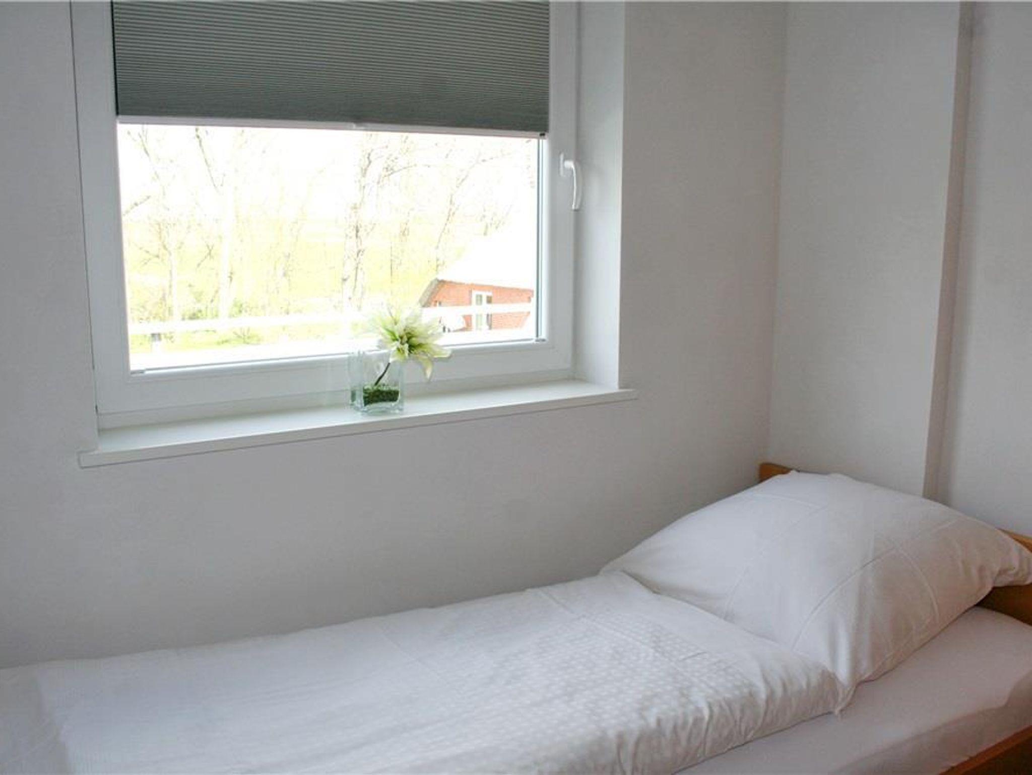 Eingangsbereich mit Garderobe, offene Küche zum Wohnraum mit Essbereich in einem vorgelagerten Wintergarten, direkter Zugang zur Terrasse und Garten, Schlafzimmer mit 2 Einzelbetten (90x200cm), 1 Duschbad mit WC und Waschbecken. Parkplatz und Fahrradständer.