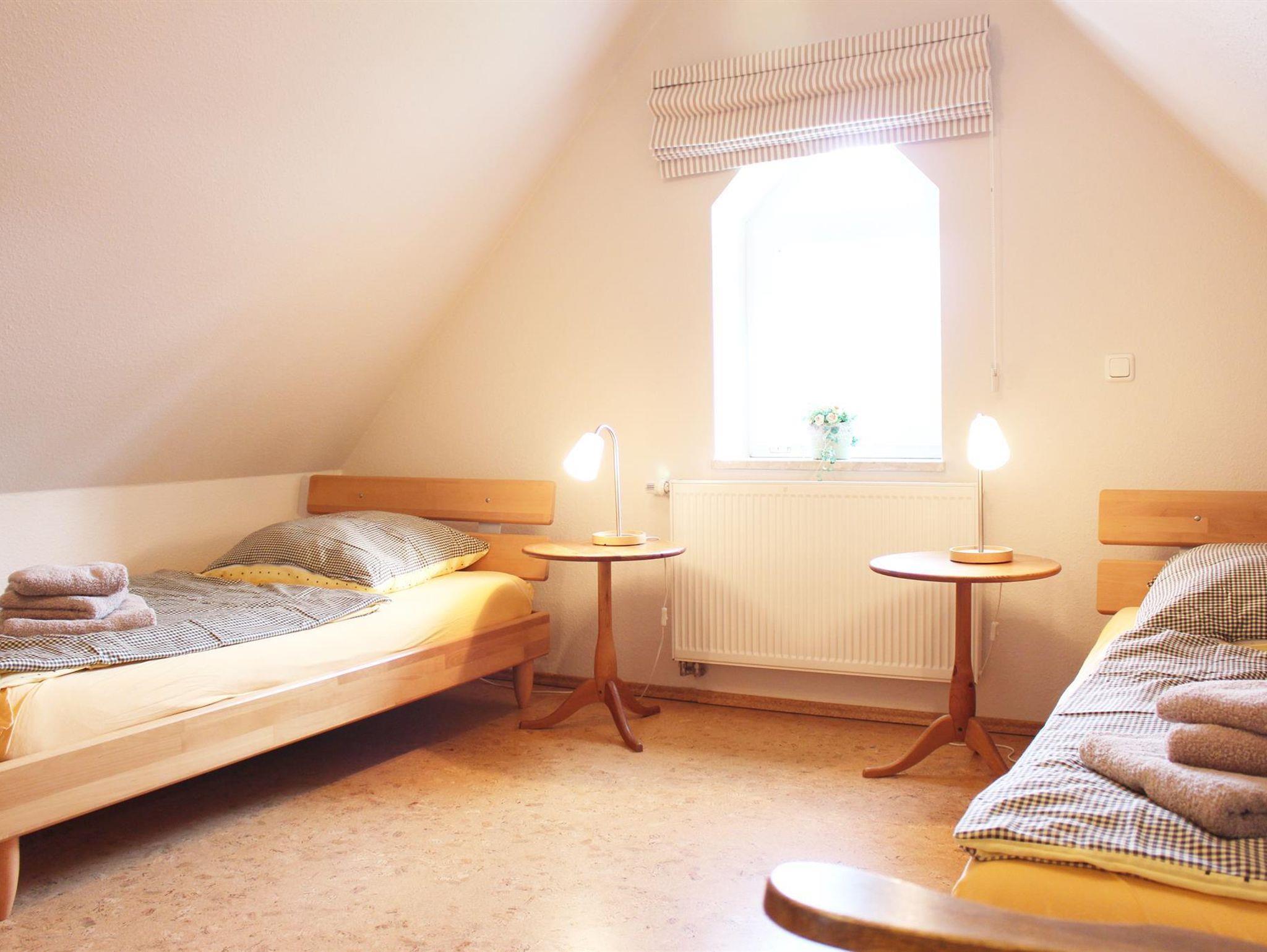 Über eine Treppe erreichen Sie einen zweiten Schlafraum mit zwei Einzelbetten.