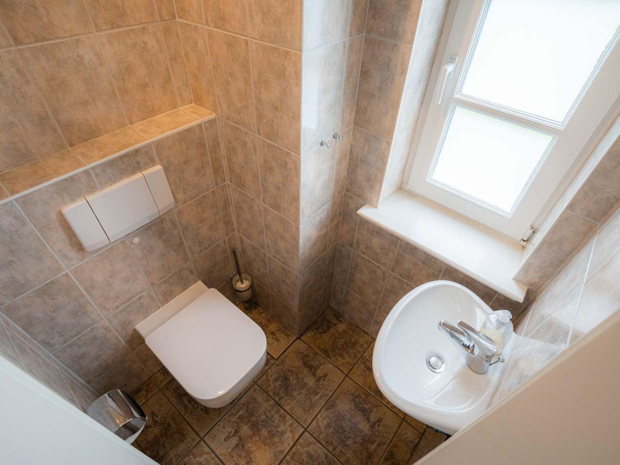 Badezimmer (Duschbad) mit Dusche, WC, Tageslicht und Föhn.
