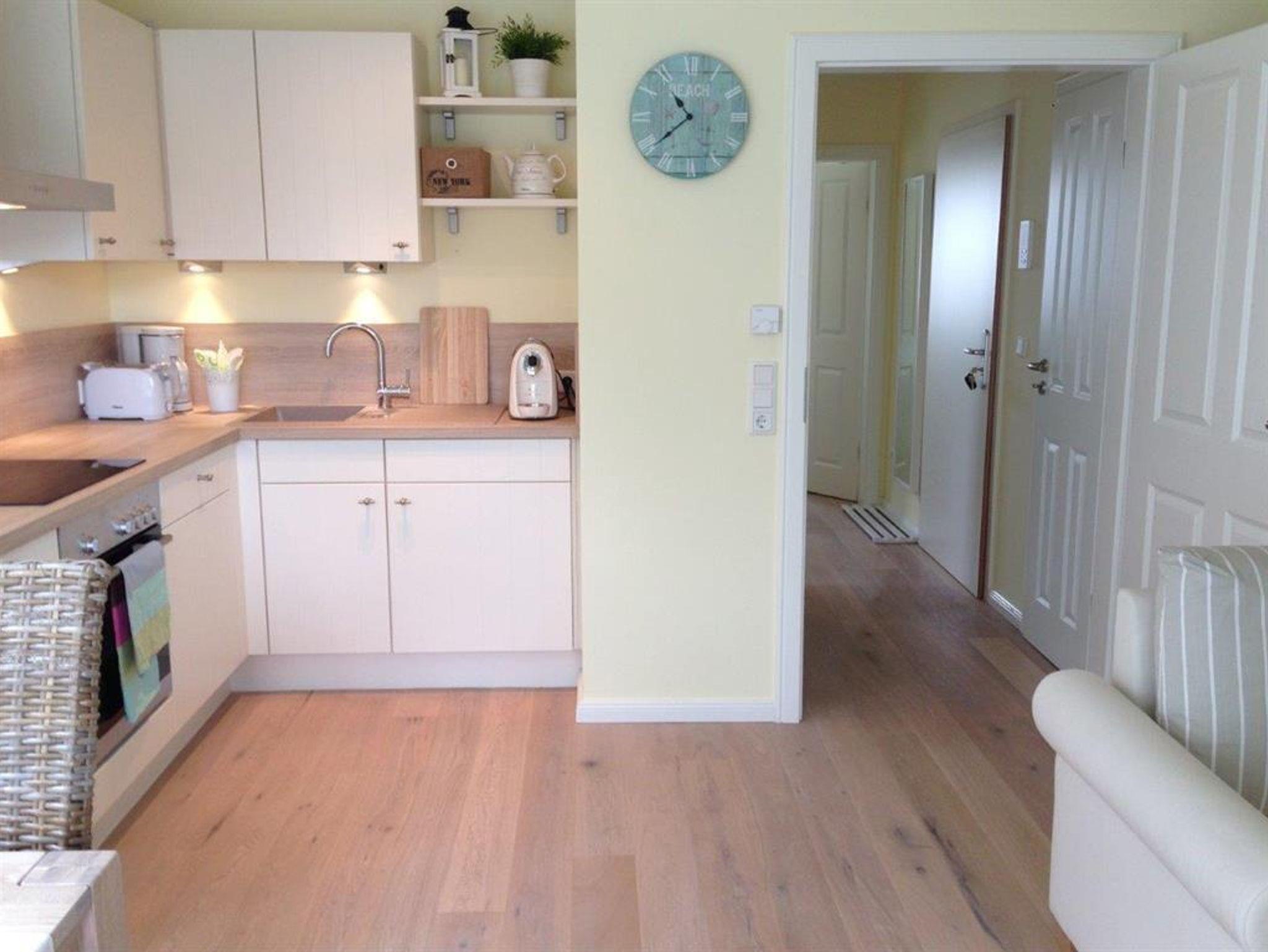 Wohnzimmer mit offener Küche, Schlafzimmer mit Boxspringbett. Bad mit ebenerdiger Dusche. Echtholzparkett in Räumen und Flur, große Sonnenterrasse nach Süden, eigener Parkplatz vor dem Hauseingang.