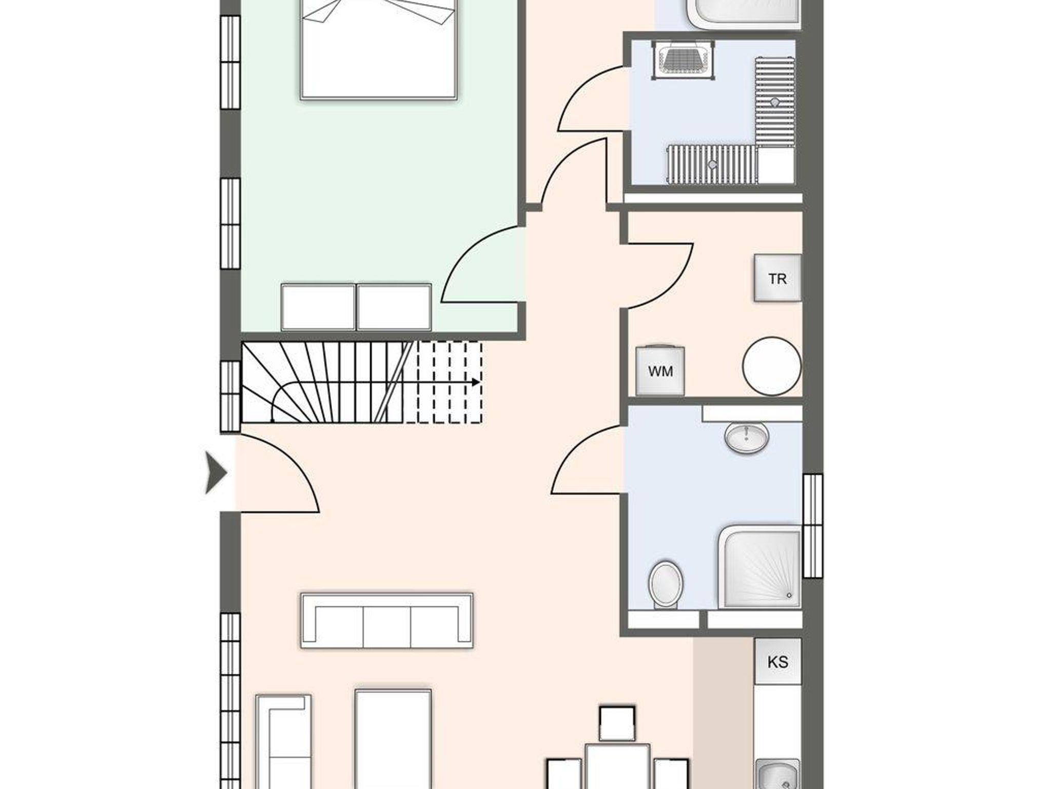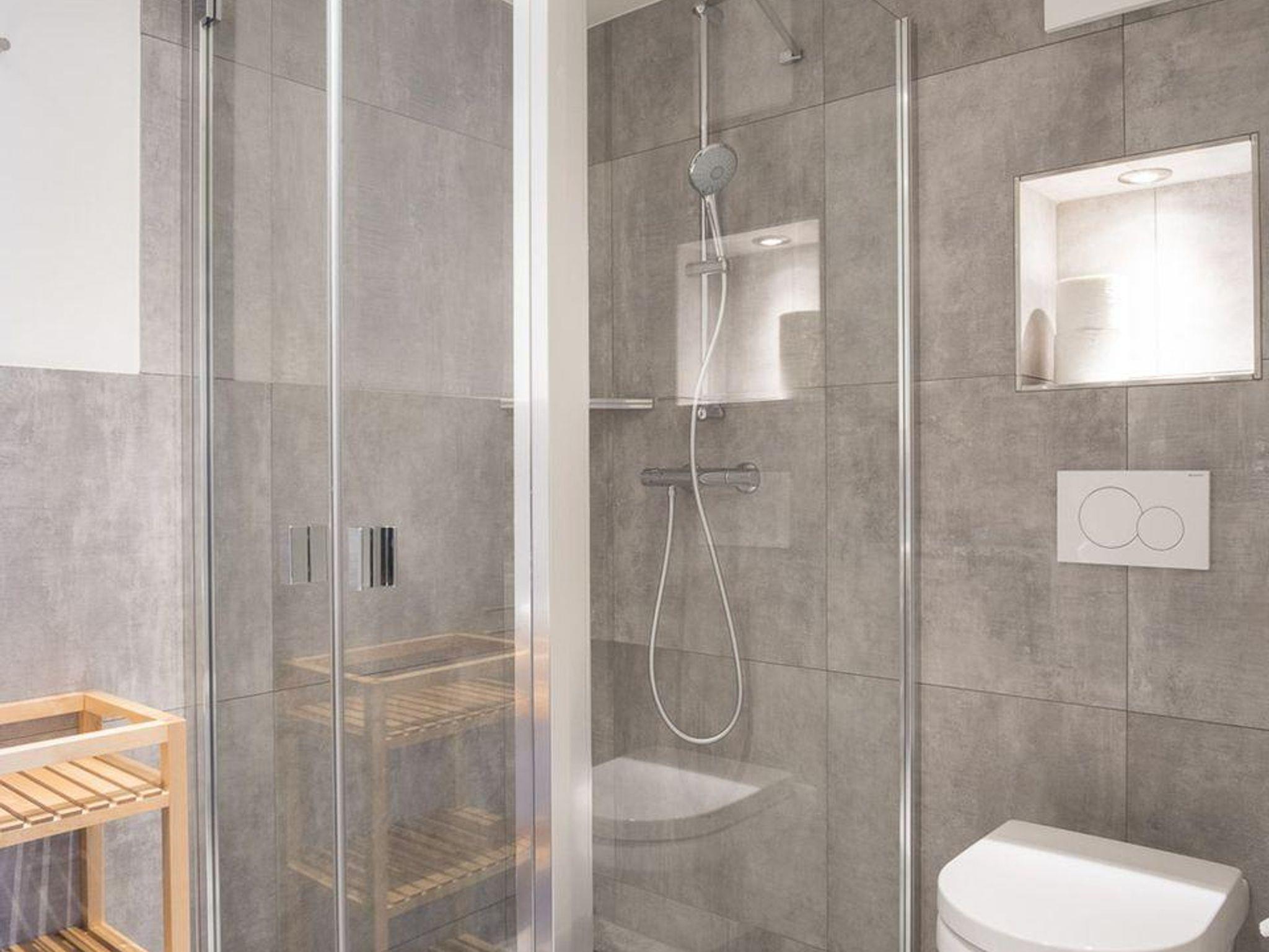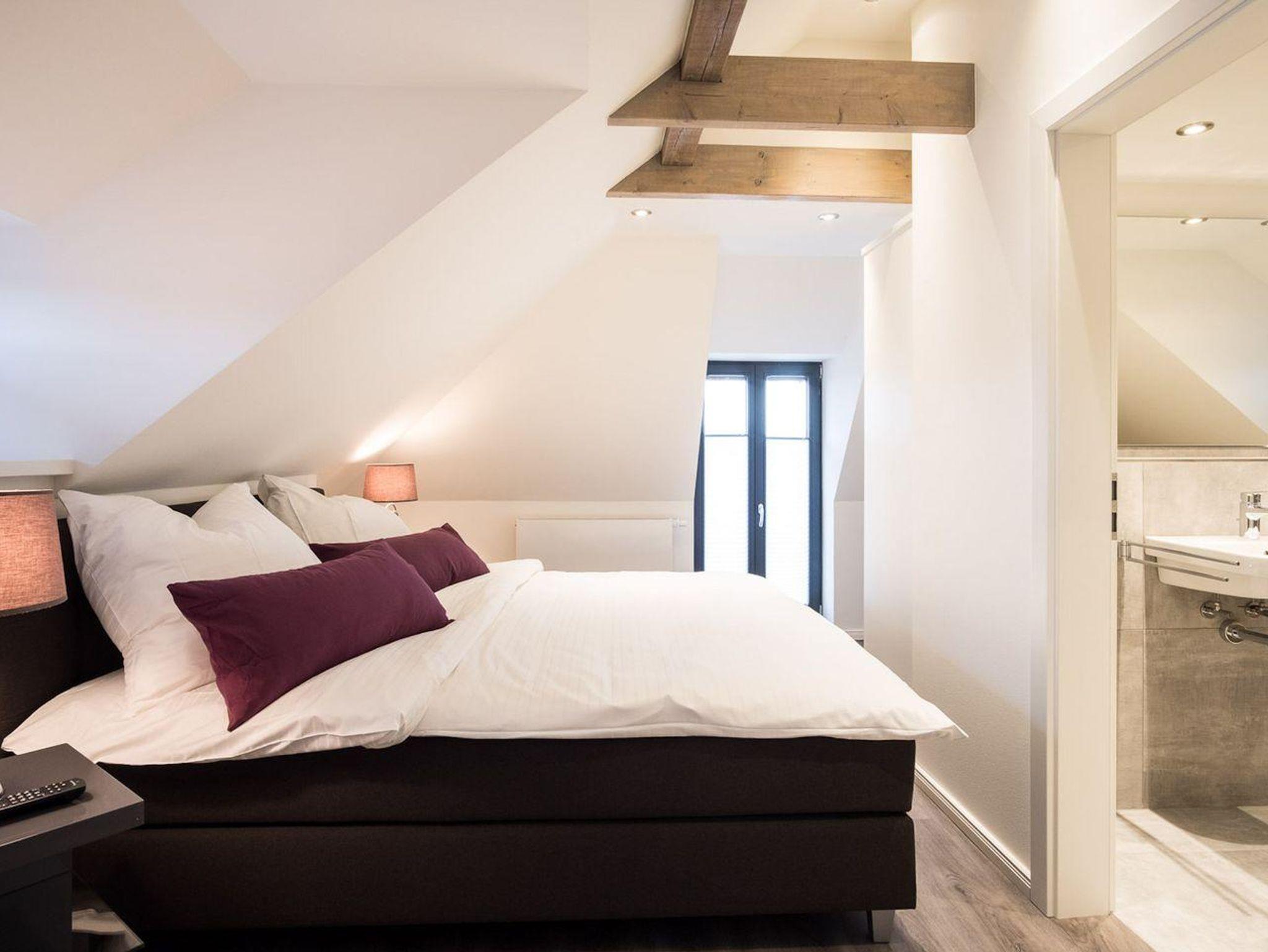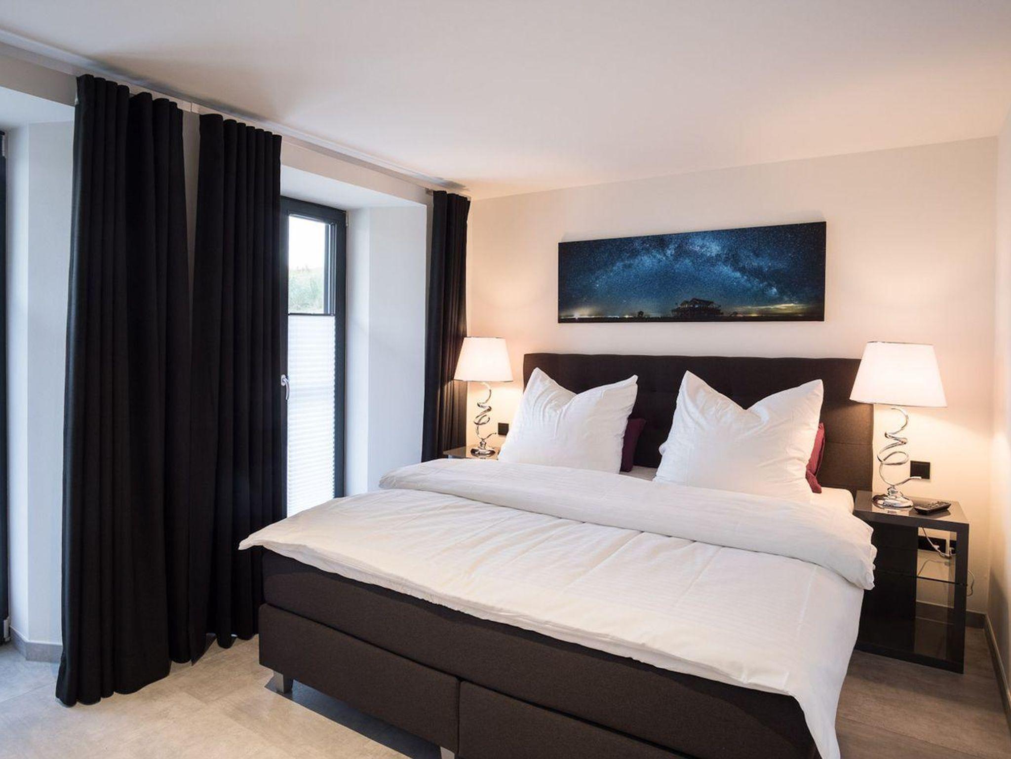 Im Erdgeschoss ist ebenso ein Doppelschlafzimmer mit TV, sowie ein gegenüberliegendes Duschbad mit WC und eine Sauna mit Zugang in den Garten.