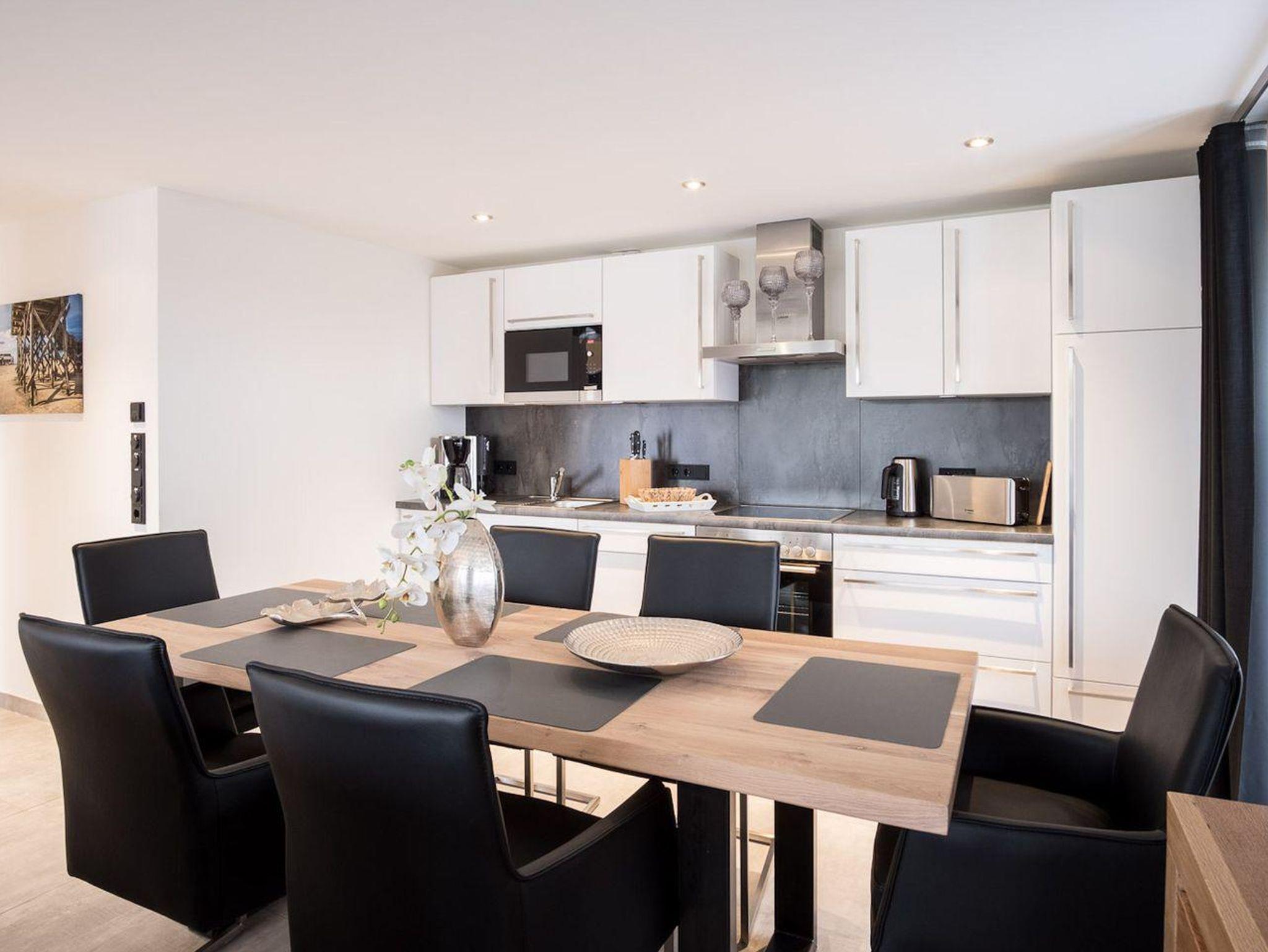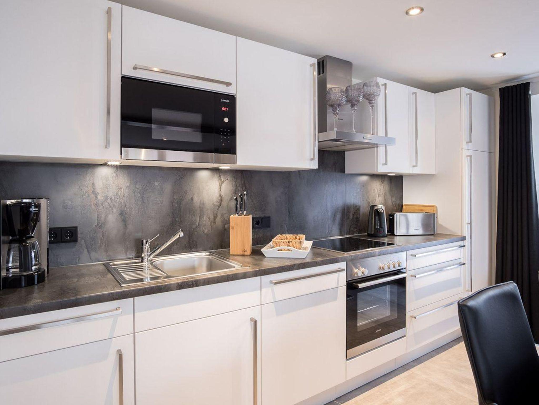 Die angrenzende Wohnküche ist mit allen wichtigen Geräten voll ausgestattet und lädt zum gemeinsamen Kochen ein.