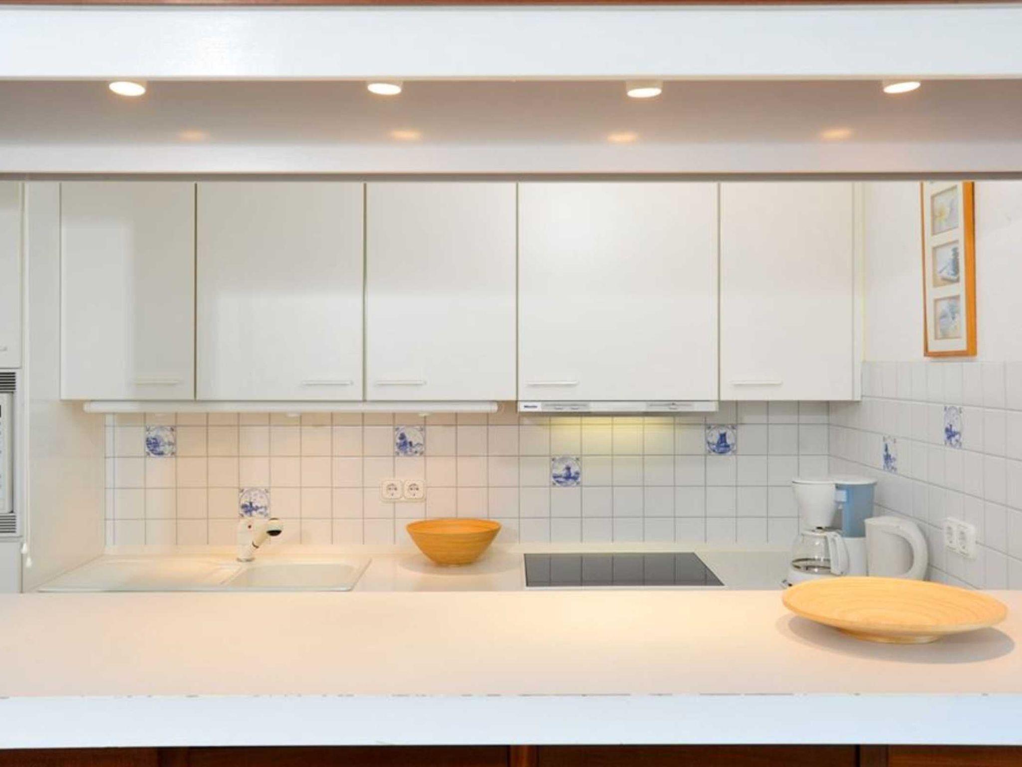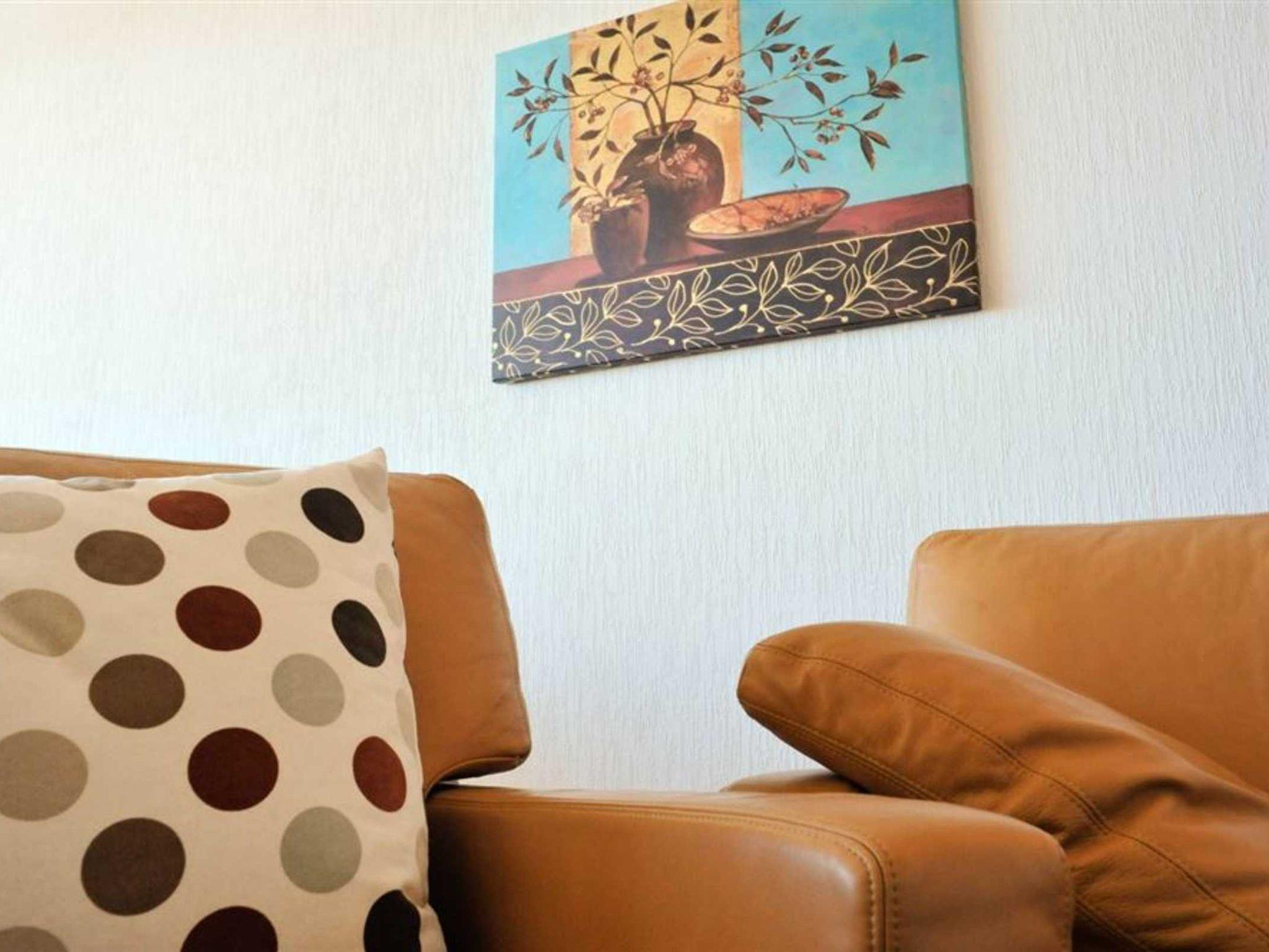 Wohnzimmer mit Sofa für 2 Personen, 2 Sesseln, TV (Sat), Stereo-Kompaktanlage, Sony PlayStation 2 und Esstisch mit 4 Stühlen. Direkter Zugang zum möblierten Balkon nach Südwesten mit wunderschönem Meerblick. Offene Küche mit Backofen, Mikrowelle, Kühlschrank mit Gefrierfach, Geschirrspüler und Tresen zum Wohnbereich.