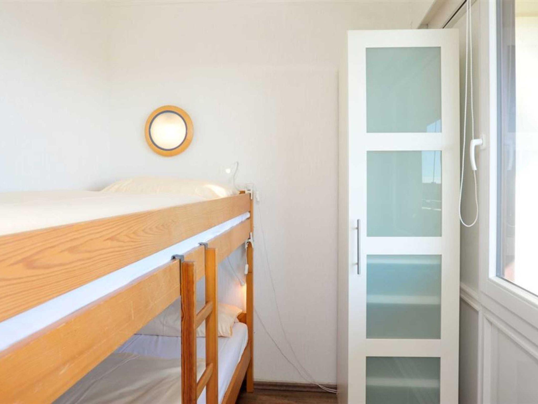 2. Schlafzimmer mit 2 Etagen-Einzelbetten (je 90x200cm), Kleiderschrank und Meerblick. Durch eine Schiebetür abgetrennt.
