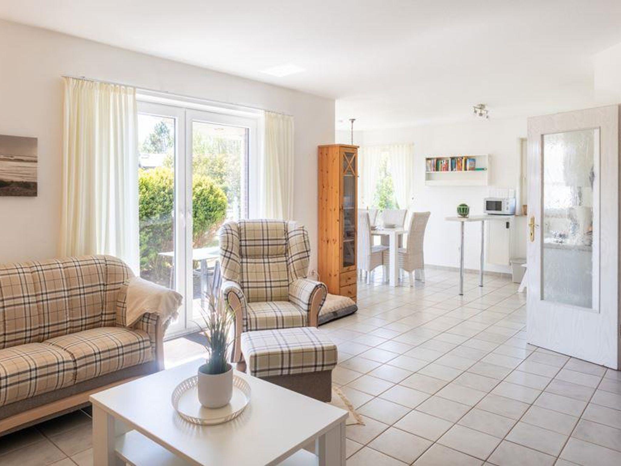 1 Wohnraum mit Sitzecke, Radio, Farb-TV, DVD-Player und vollständig eingerichteter Küchenzeile mit Backofen sowie Geschirrspülmaschine und Eßecke und Ausgang zur Terrasse mit Strandkorb. 1 Schlafraum mit 3Einzelbetten. 1 Schlafraum mit Doppelbett, Dusche/WC und Flur. Die Wohnung ist komplett gefliest und hat Fußbodenheizung. Spiele und Bücher stehen zur Verfügung. Komfortabel und liebevoll eingerichtet.