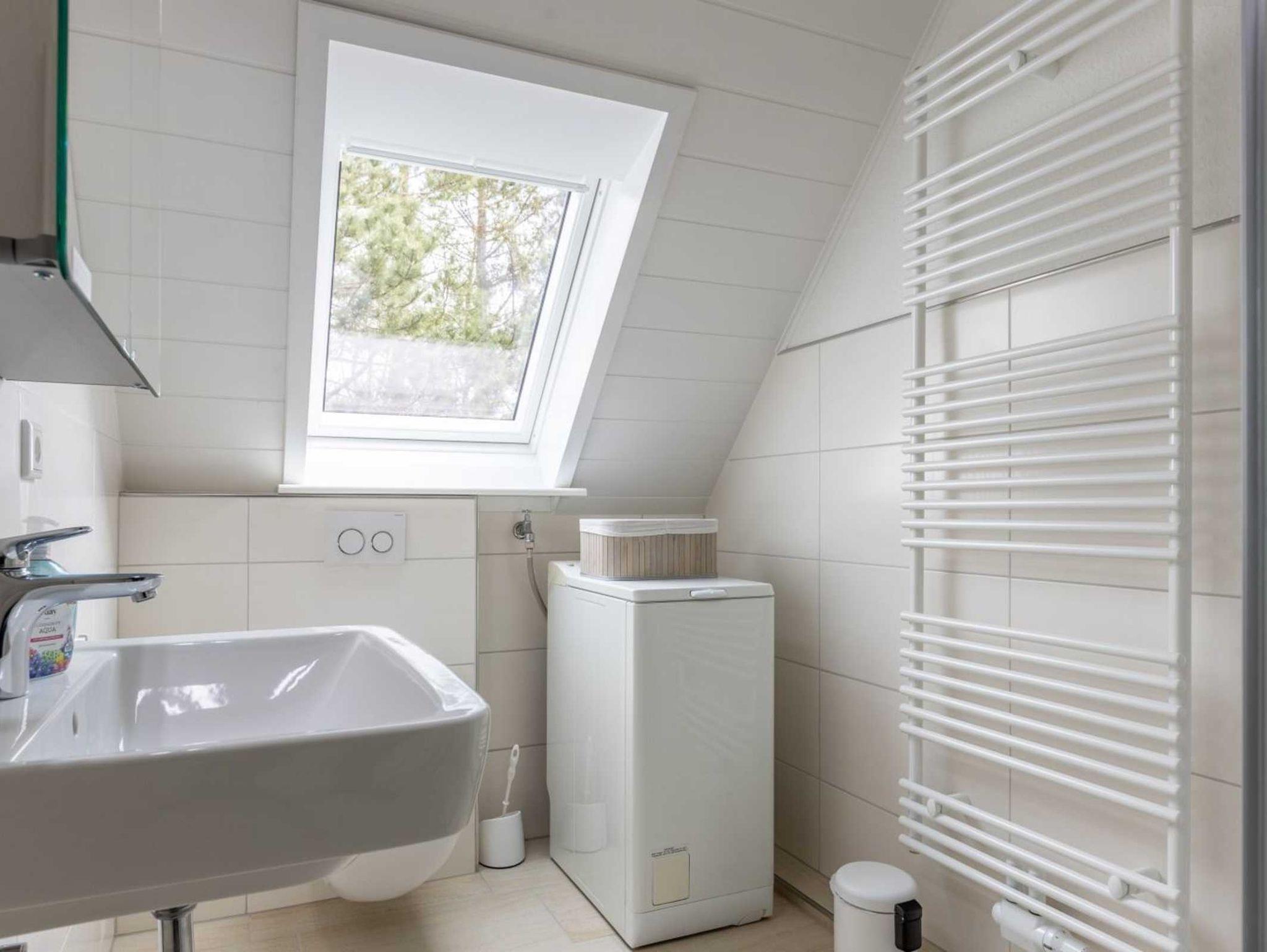 Badezimmer (Duschbad) mit Dusche, WC, Waschmaschine, Handtuchwärmer und Tageslicht.