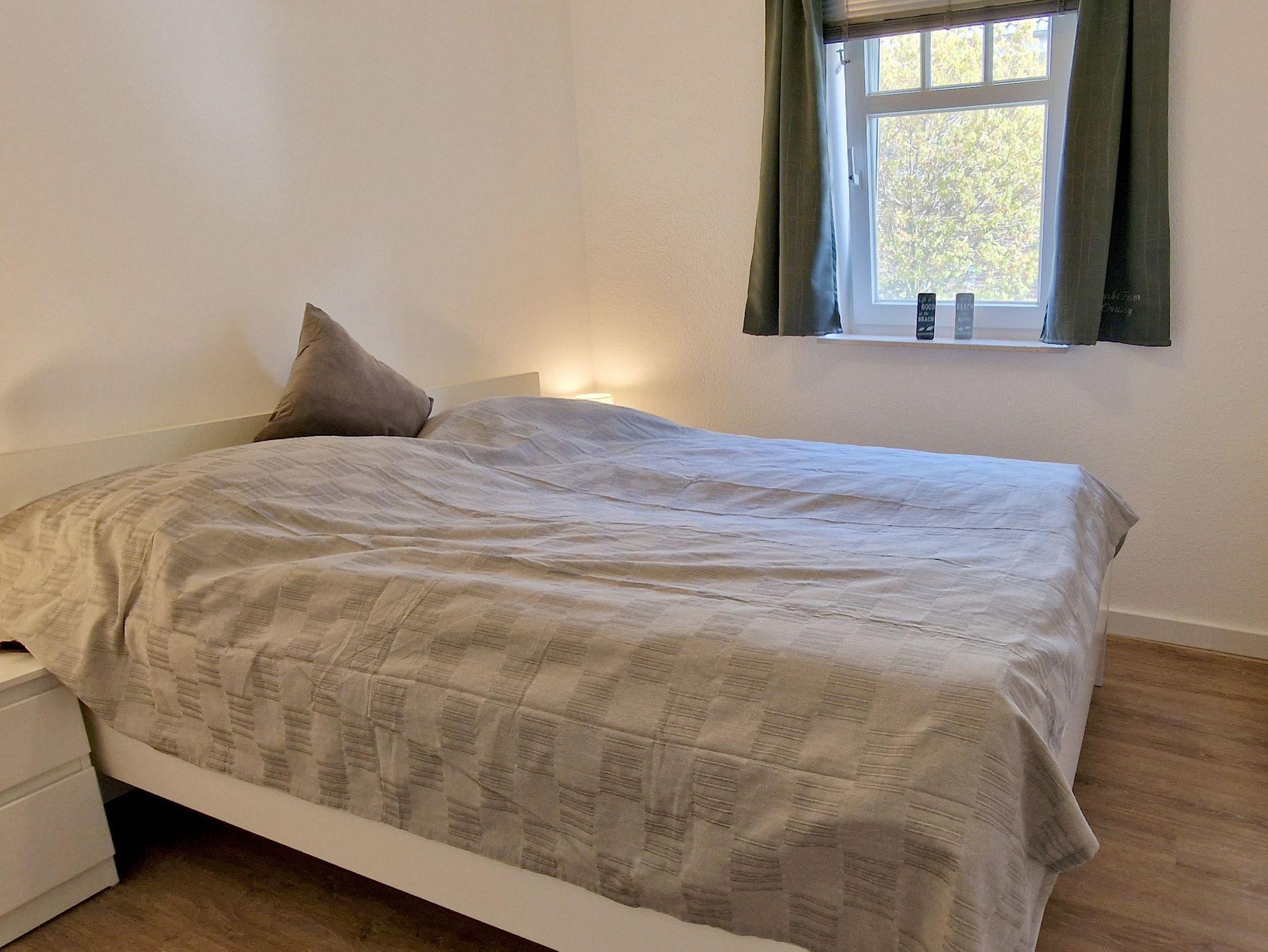 Schlafzimmer 1: Doppelbett 2,00 x 1,60 m, Nachtisch, Hocker, Nachtspeicherofen, Kleiderschrank, Garderobe