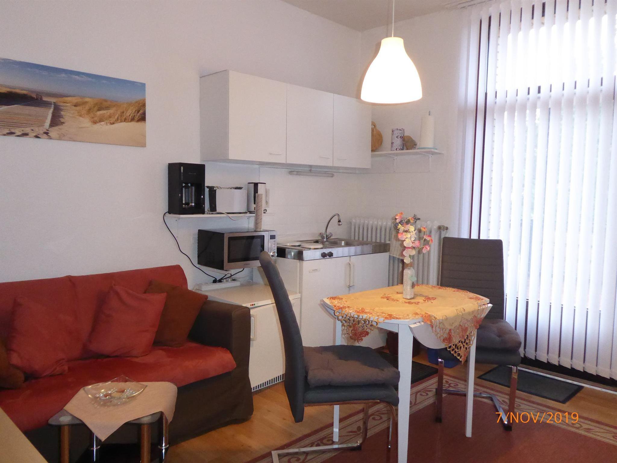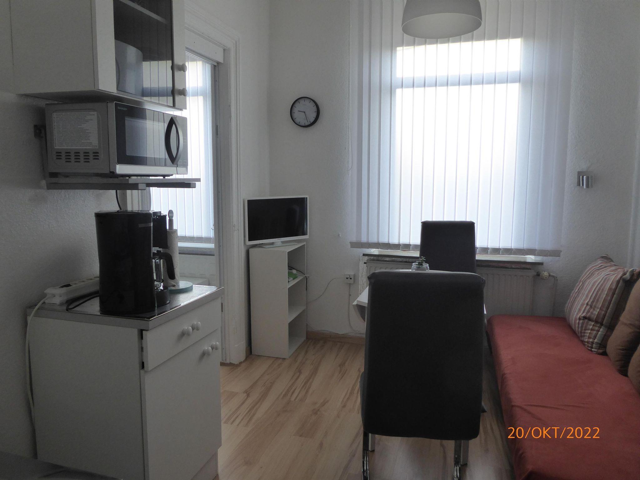 Ausgestattet mit einem Wohnraum mit SAT-TV und kleiner Stereoanlage.Die integrierte Pantryküche in dem Wohnraum verfügt über eine Microwelle, Wasserkocher, 2-Platten-Herd, Töpfe, Geschirr, etc..Wir möchten Sie darauf hinweisen ,dass es ein Nichtraucherappartement ist !