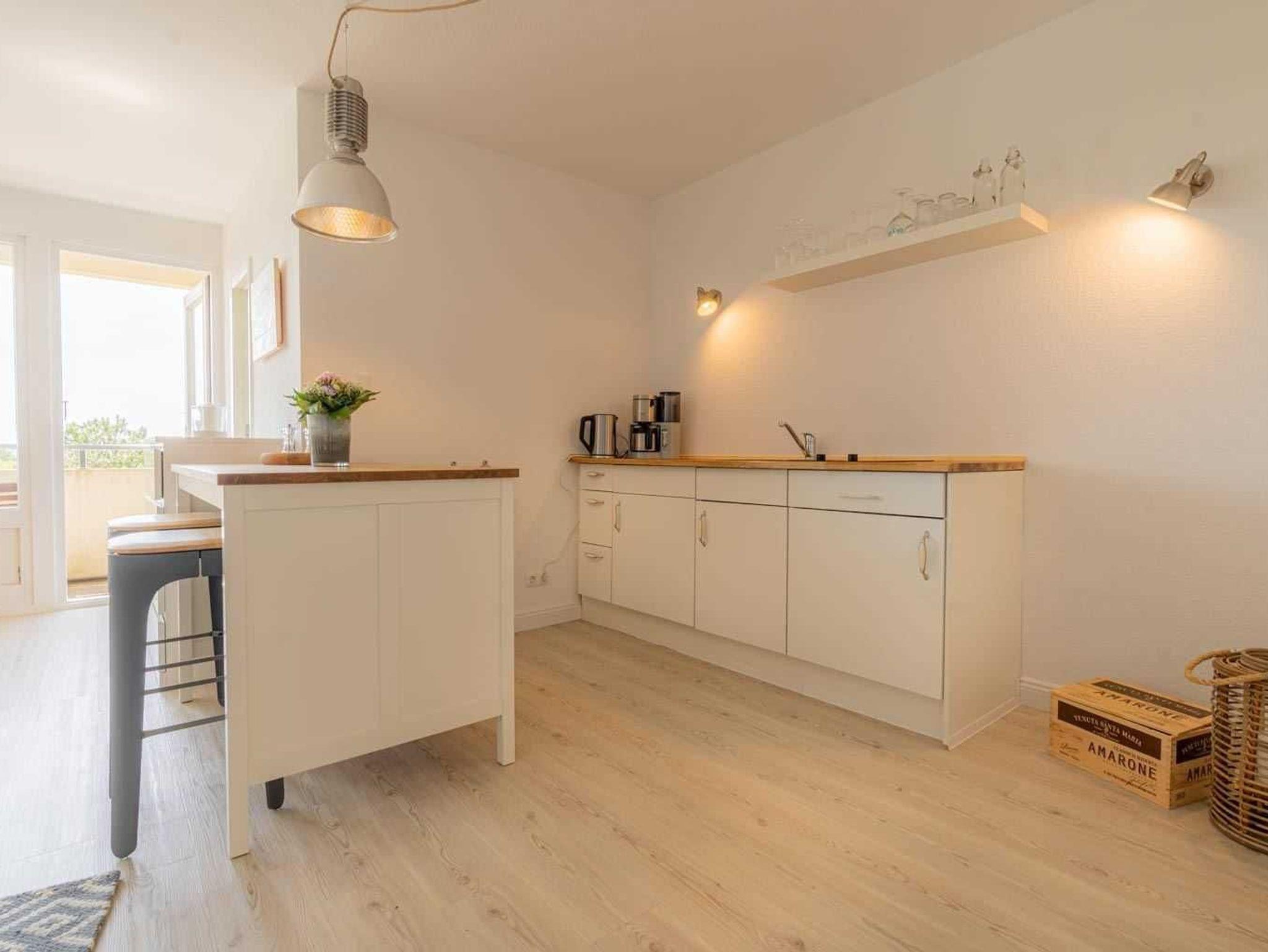 Wohn- und Schlafzimmer mit 2 Sesseln, großem SMART-TV (Sat), Esstisch für 4 Personen und Doppelbett (160x200cm, Boxspring). Direkter Zugang zum möblierten Südwest-Balkon. Offene Küche mit Ceran-Herd mit 2 Kochstellen, Mikrowelle mit Grillfunktion, Geschirrspüler, Kühlschrank mit Gefrierfach und kleinem Tresentisch mit zwei Barhochern.