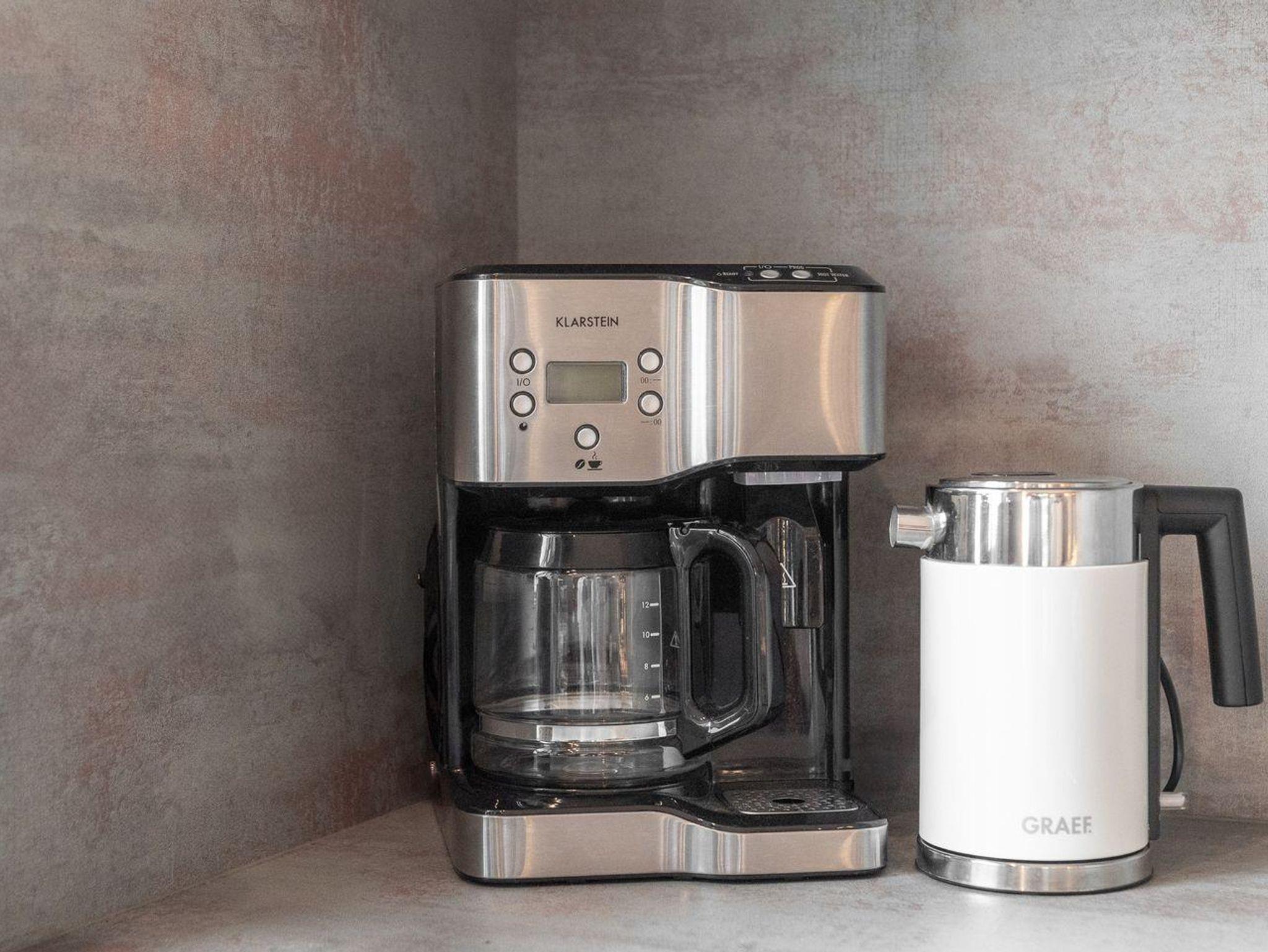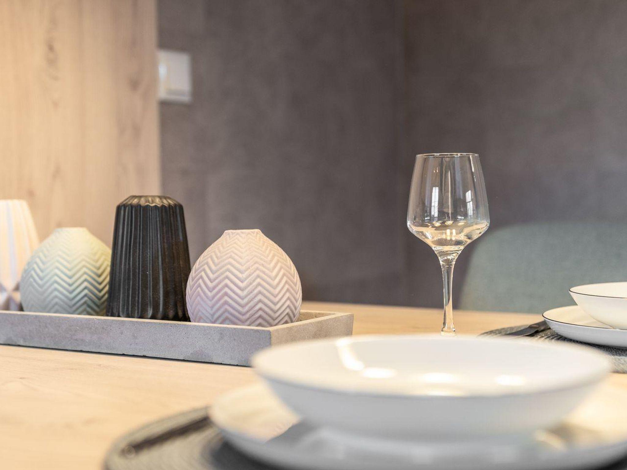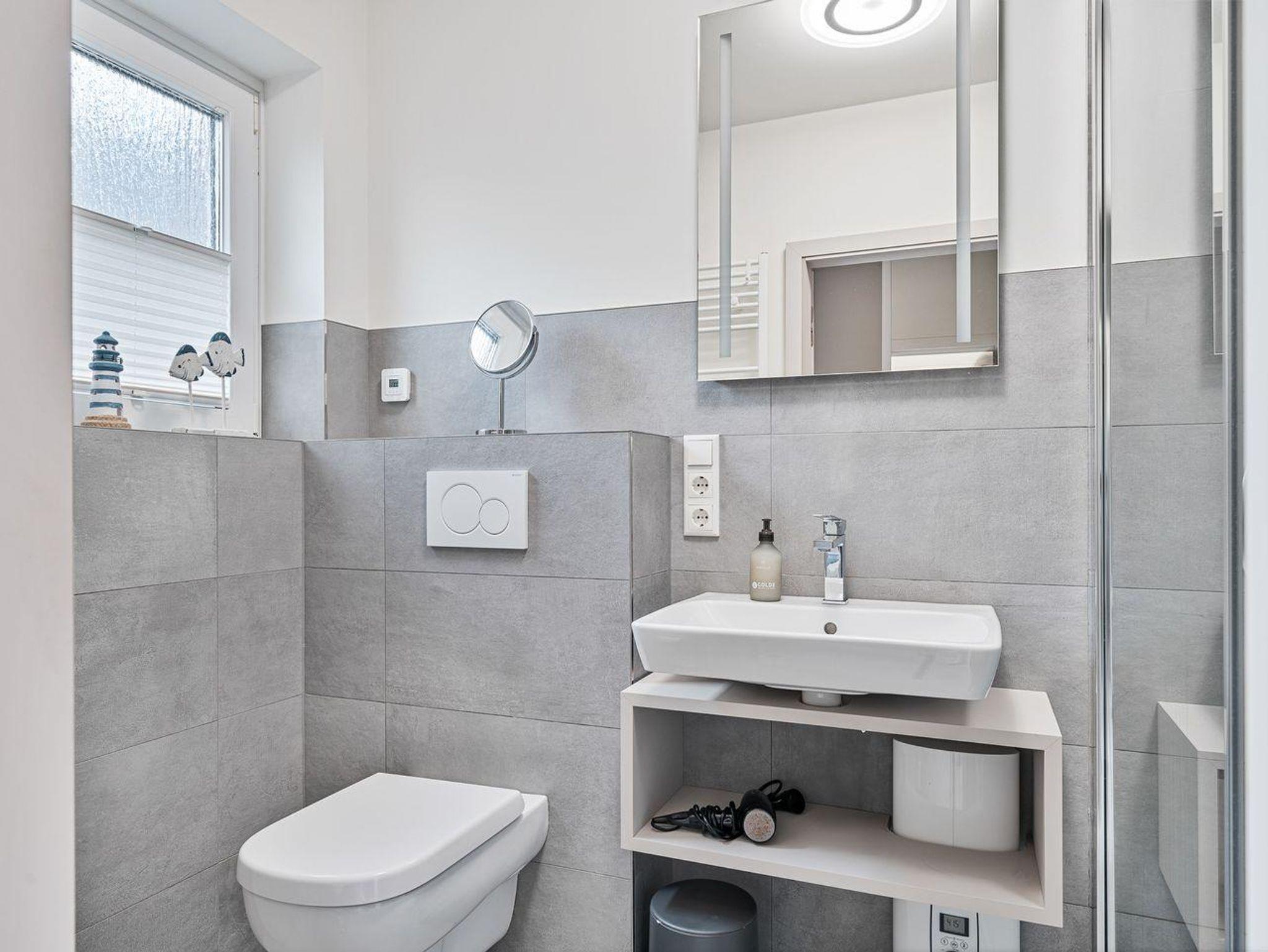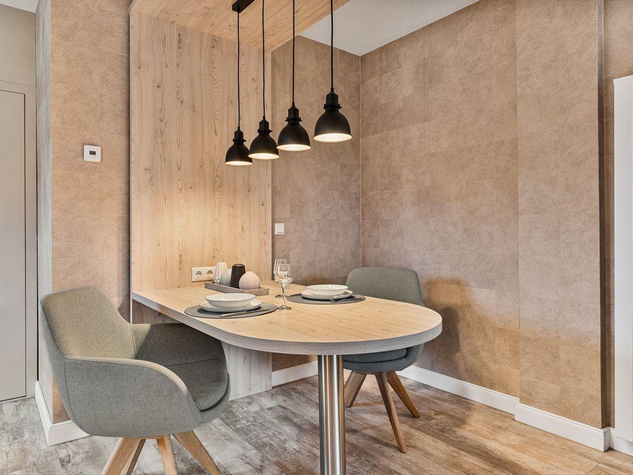 Die offene, moderne Einbauküche lässt keine Wünsche offen: Ausgestattet mit Backofen, Geschirrspüler, Kühlschrank mit Gefrierfach und Kaffeemaschine bietet sie alles, was man zum Kochen und Genießen braucht. Ein kleiner Flur führt Sie in das stilvoll gestaltete Duschbad mit WC.