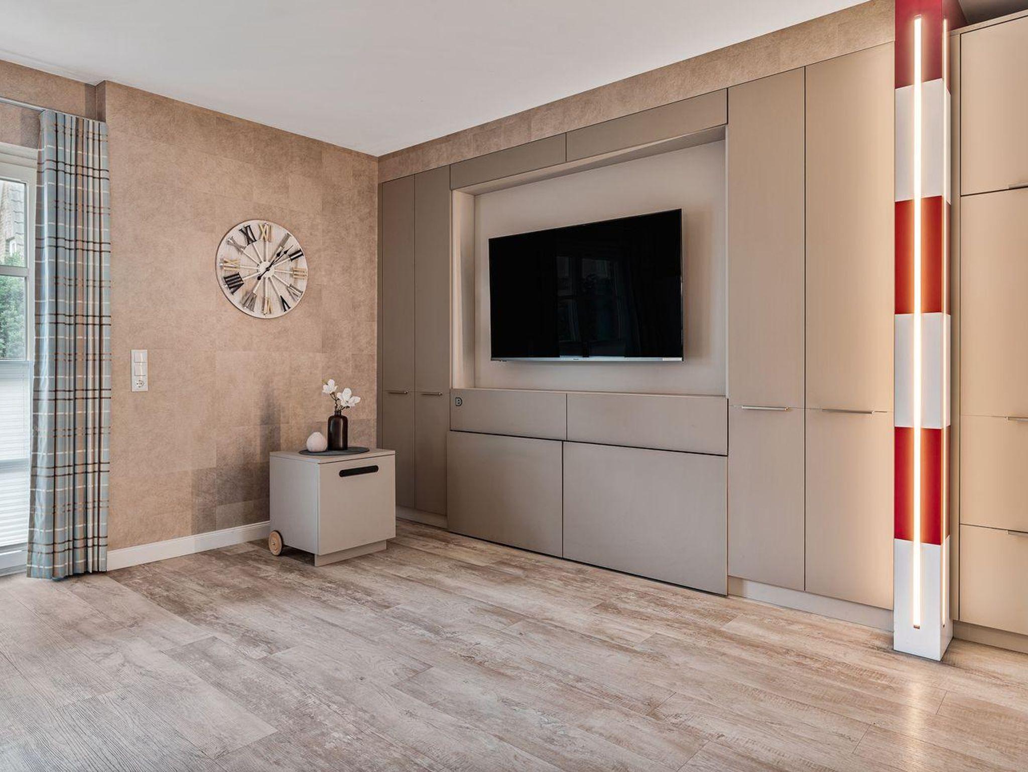 Der einladende Wohnbereich überzeugt mit einer gemütlichen Essecke und einem hochwertigen Ledersofa mit elektrischer Relaxfunktion – ideal für entspannte Abende zu zweit. Ein clever integriertes Belitec-Schrankbett verwandelt den Raum bei Bedarf in ein behagliches Schlafzimmer. Tagsüber lässt sich das Bett dezent im Schrank verstauen, wodurch ein großzügiges Wohnambiente entsteht.