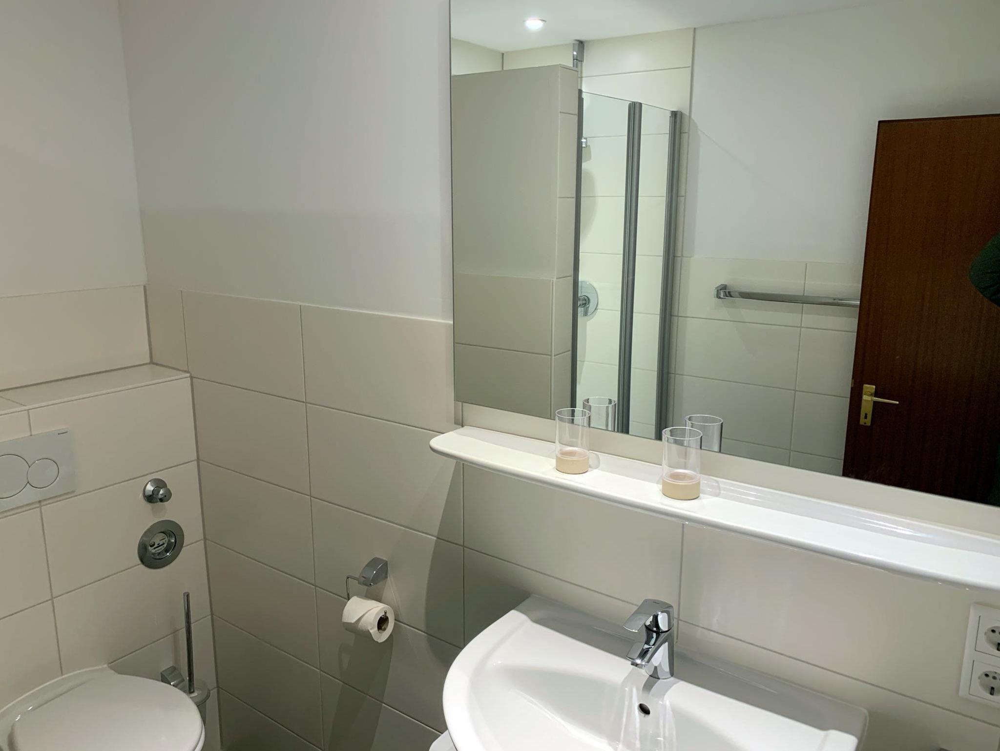 Bad:Dusche, Waschbecken, WC, Spiegel, Hocker