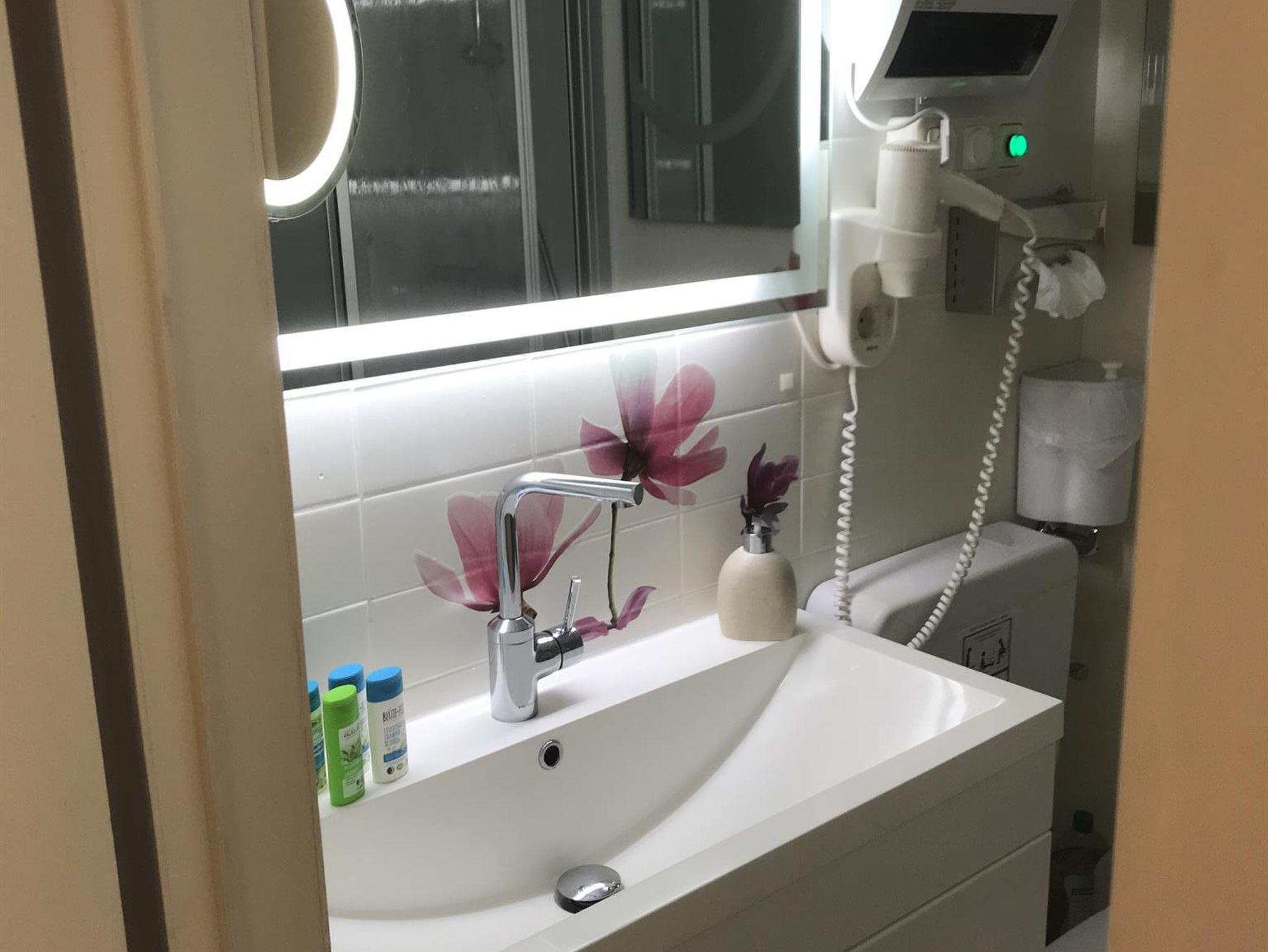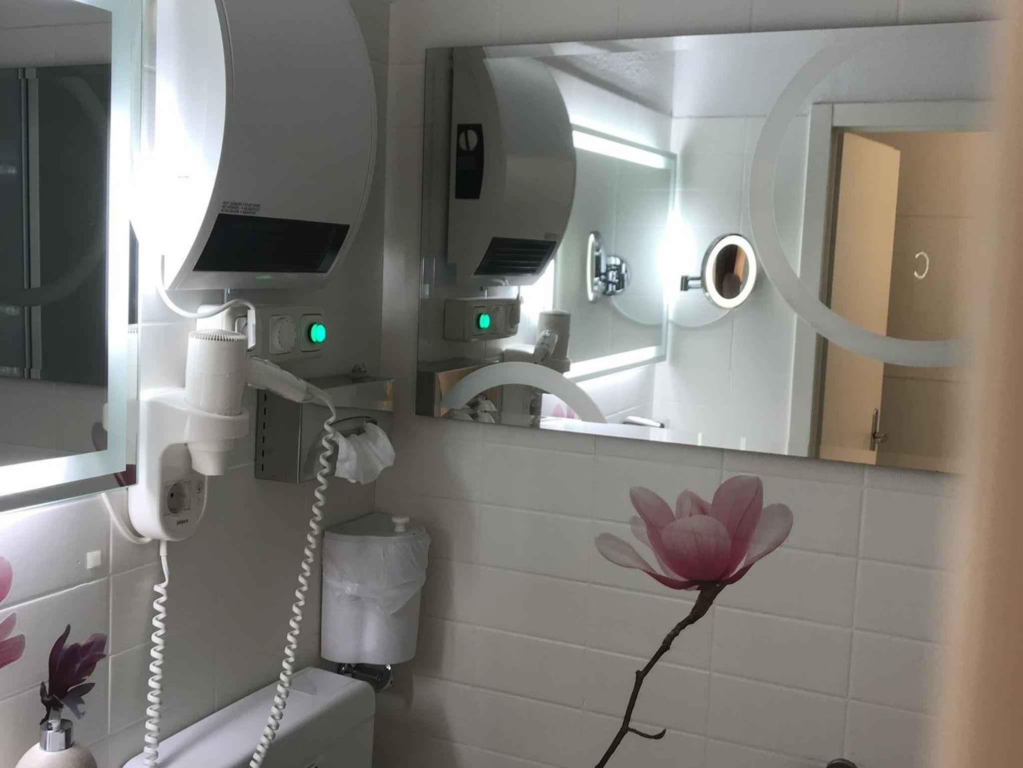 Bad:Dusche,WC,Waschtisch mit 2 Schubladen, großer beleuchteter Spiegel mit Rahmenbeleuchtung , Fön, beleuchteter Kosmetikspiegel