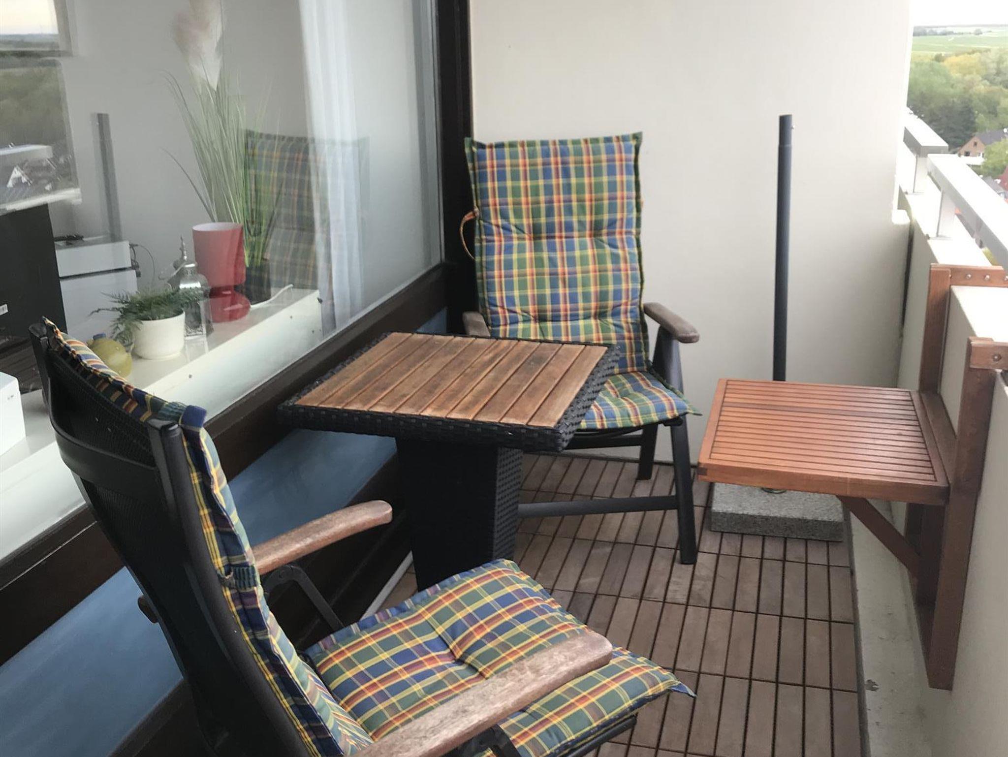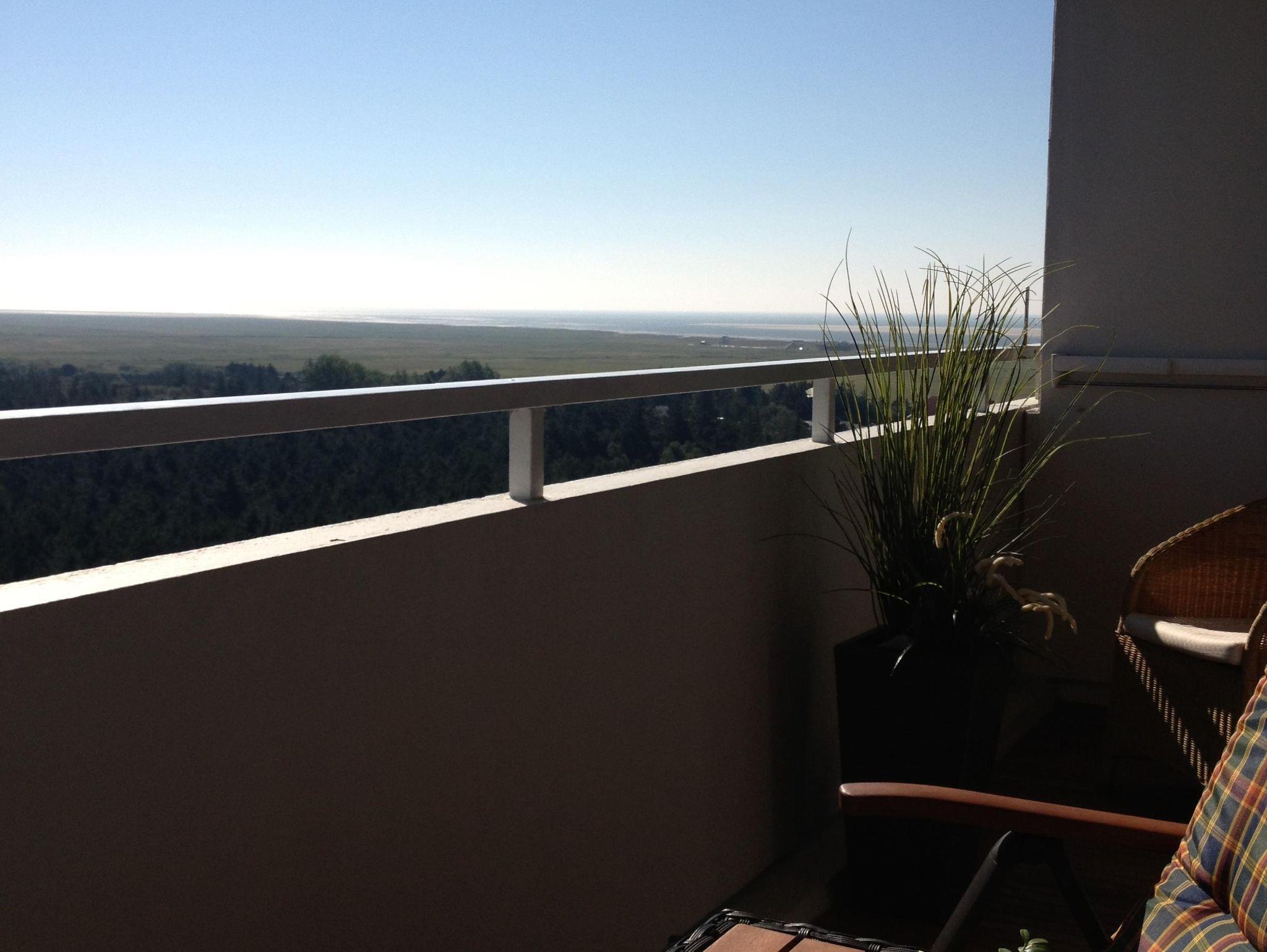 Der große möblierte Balkon (Neuer Holzfußboden!) bietet mit seiner Panoramafensterfront einen grandiosem Blick vom Eidersperrwerk bis über das Meer den Südstrand, den Prielen, Büsum bis zum Horizont! (Süd-Ost).