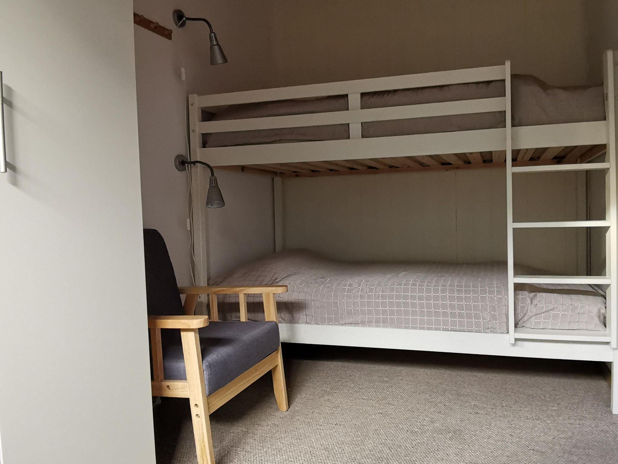 Vom Wohnzimmer betritt man zwei kleine miteinander verbundene Schlafzimmer mit einem Doppelbett( je 0,90 x 1,90m), einem Etagenbett (0,90x1,80m) im Kinderzimmer und dem gemeinsam zu nutzenden Kleiderschrank ( Siehe Zeichnung).