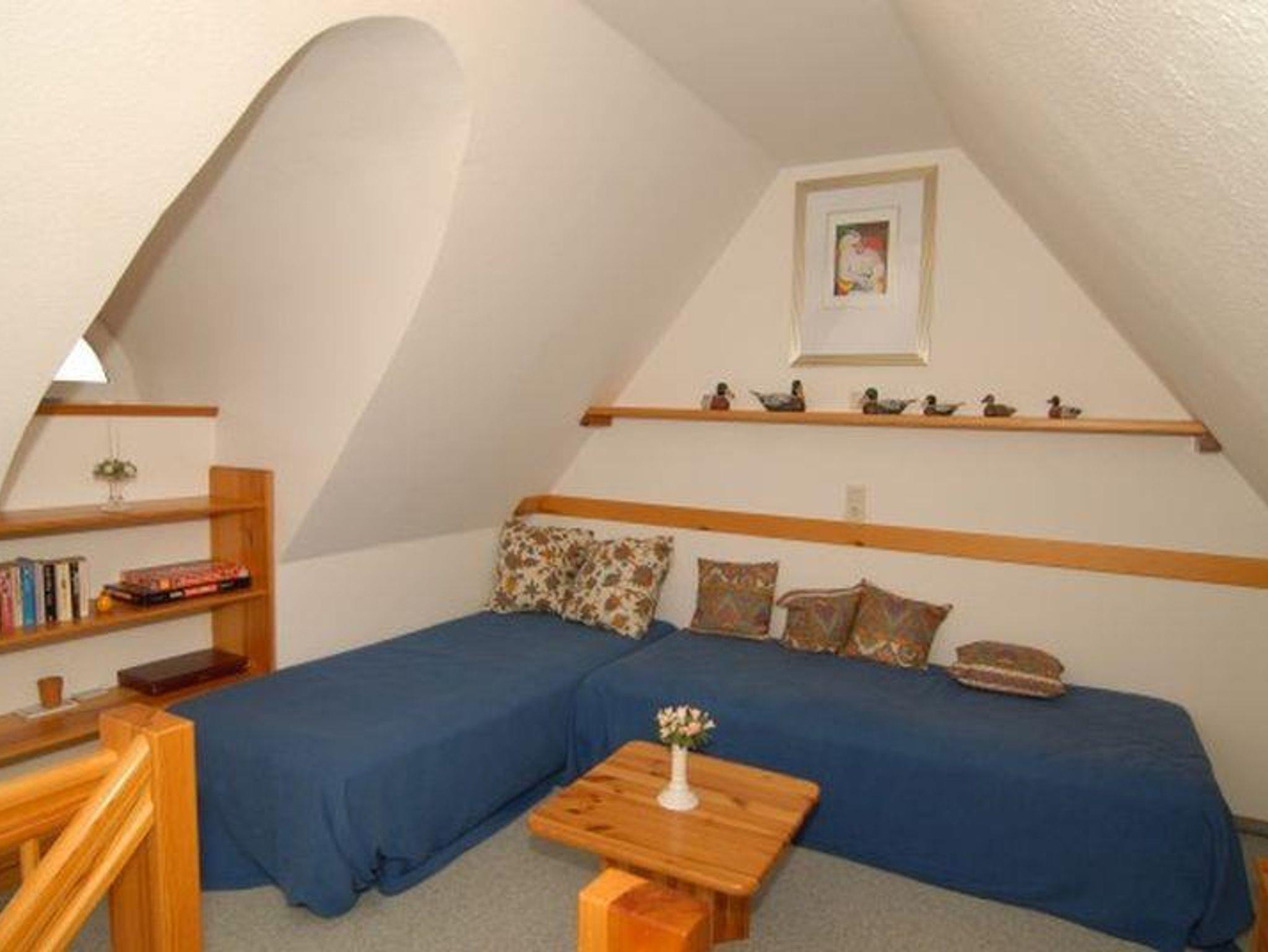 Schlafzimmer 2: 2 Einzelbetten, Tischlampe, Couchtisch, 2 Kommoden, Nachtspeicherofen, Treppe nach unten