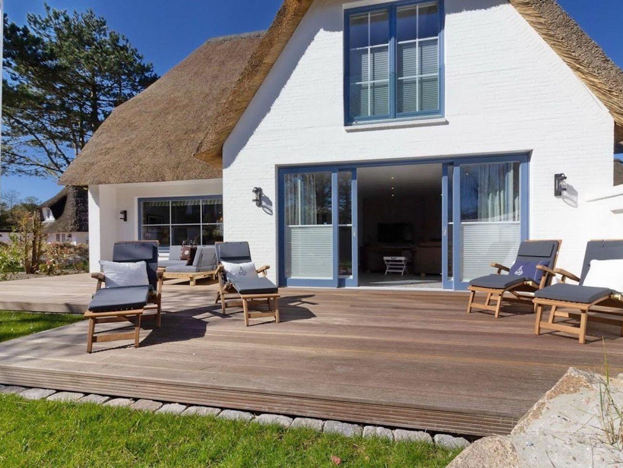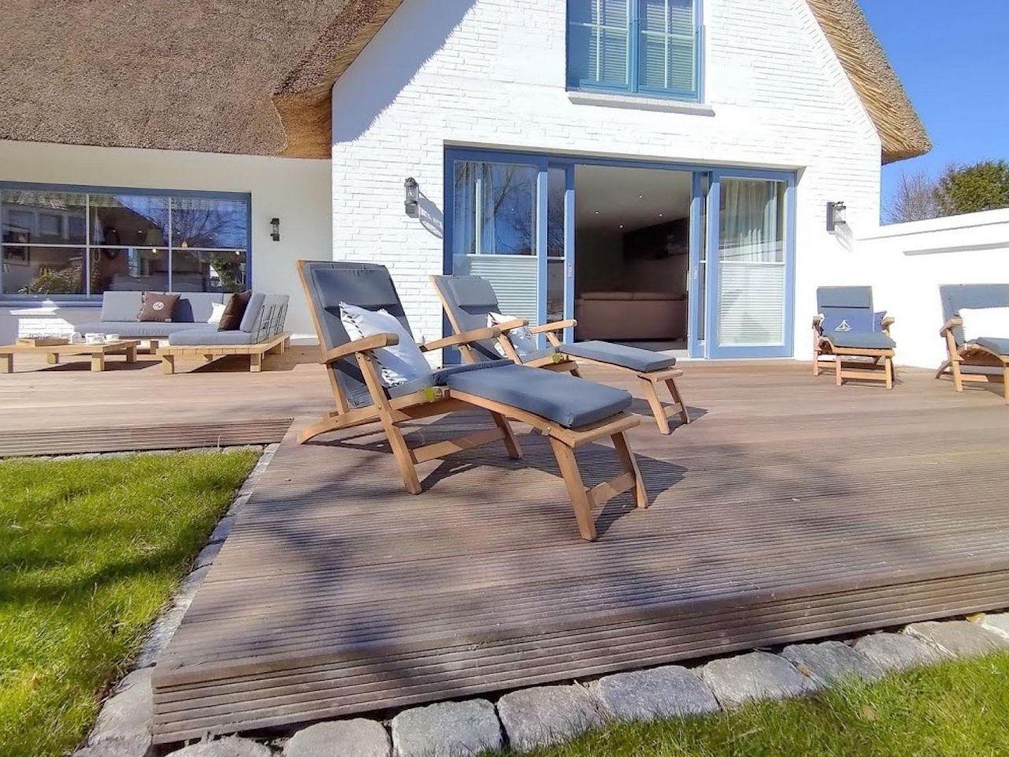 Luxuriöse Reetdach-Villa in St. Peter-Ording mit großem Garten, Sauna und nah am Seedeich für entspannte Ferien.