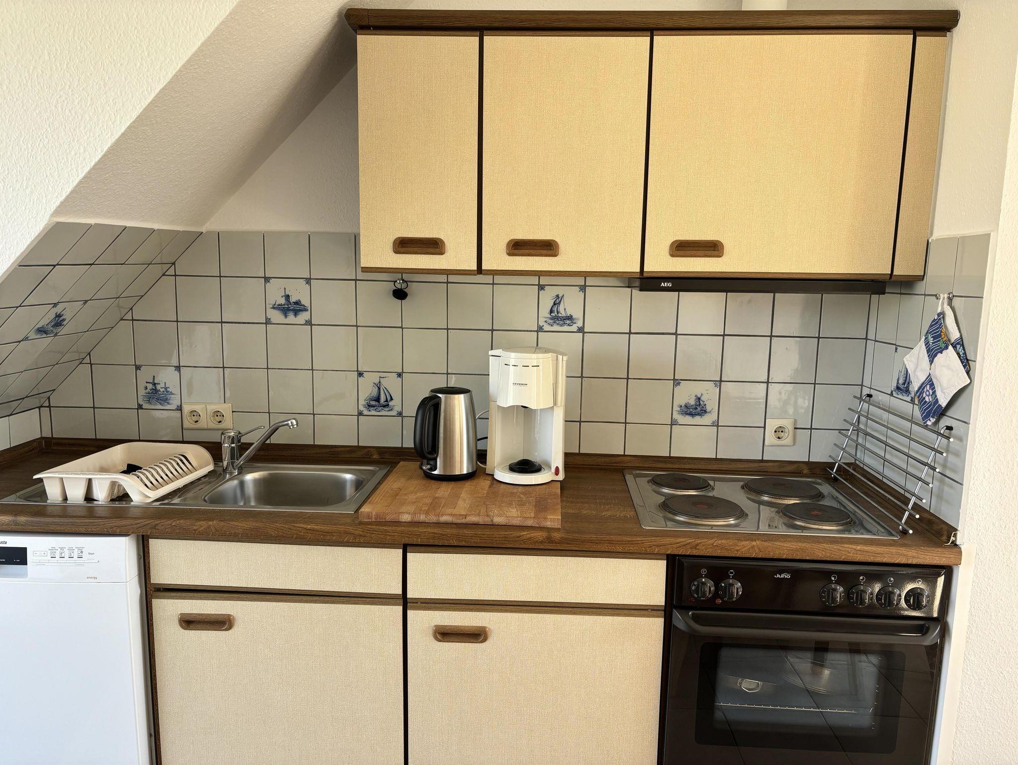 Küche mit Elektroherd, Backofen, Spülmaschine, Kühlschrank, Kaffeemaschine, Dunstabzugshaube, Mikrowelle und Zugang zum Nord/Ost Balkon.