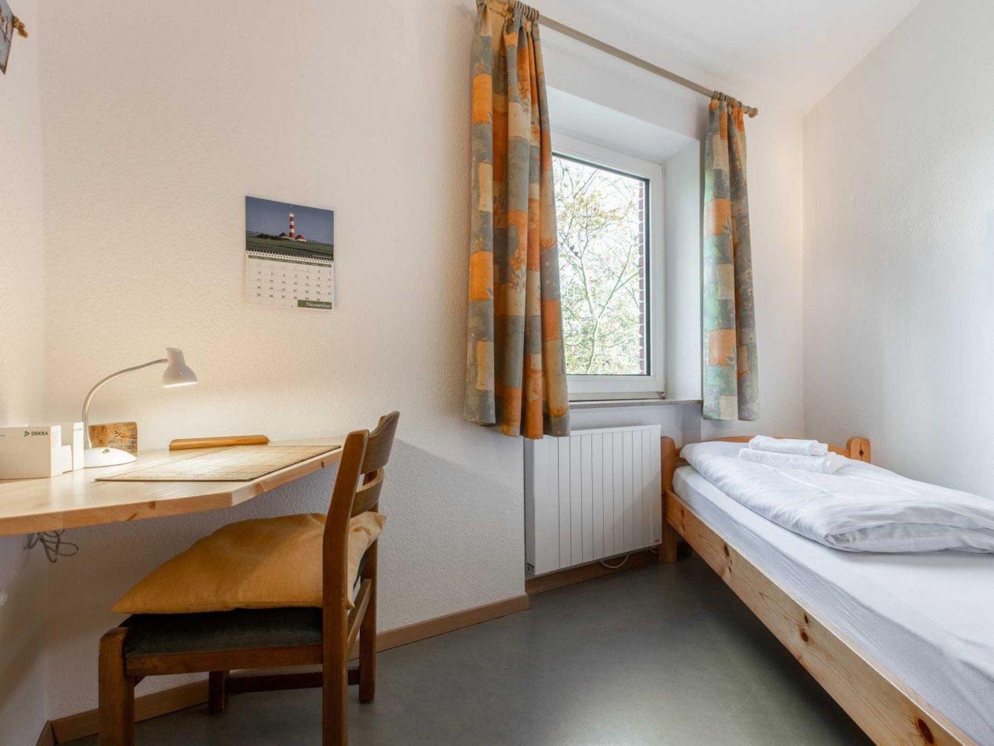 Schlafzimmer mit Einzelbett (90x190cm) und 2 Etagen-Einzelbetten (je 90x200cm), Kleiderschrank und Stuhl.