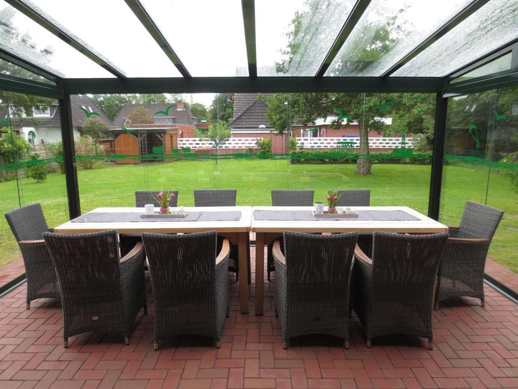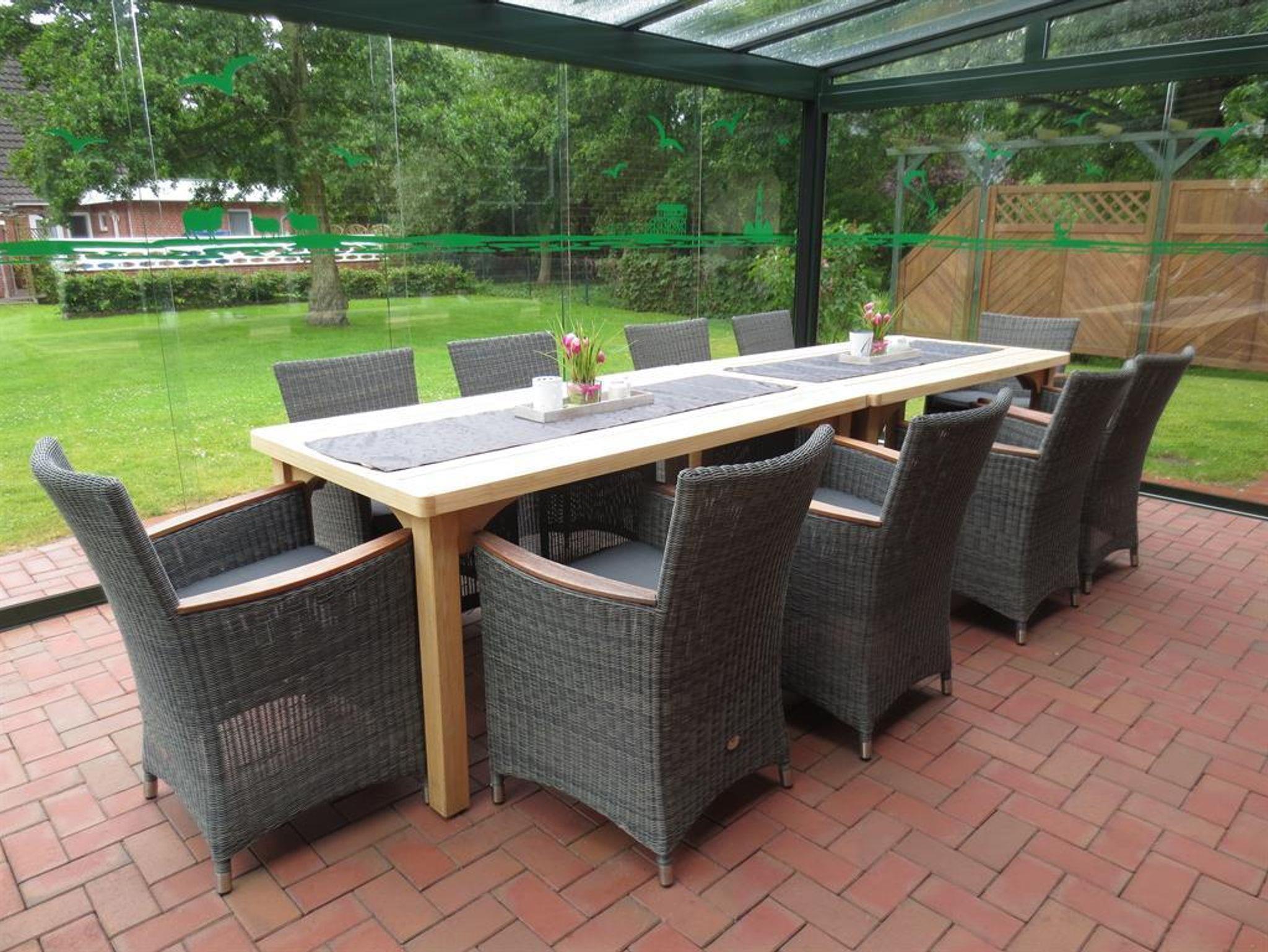 Auf der großen sonnigen Terrasse erwarten Sie eine Sitzgruppe, Strandkorb, Sonnenmarkise und Gartengrill. Der Wintergarten mit seinen verschiebbaren Elementen sorgt auch bei nordischem Wetter für Terrassenfeeling. Der schöne Garten lädt zum Sonnenbaden und Spielen ein.