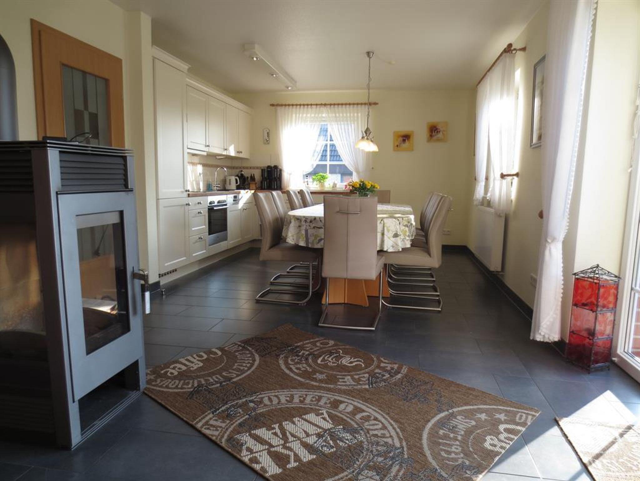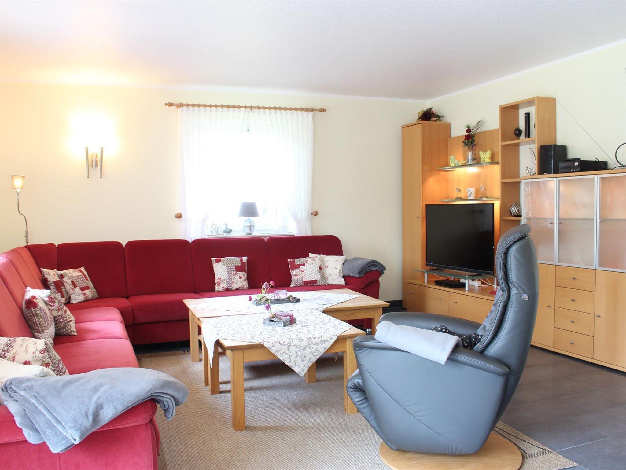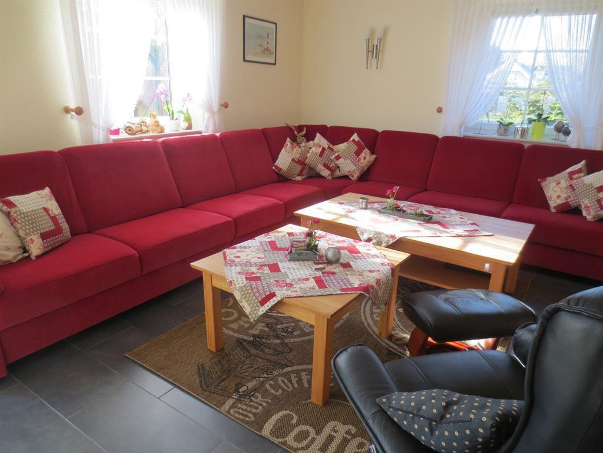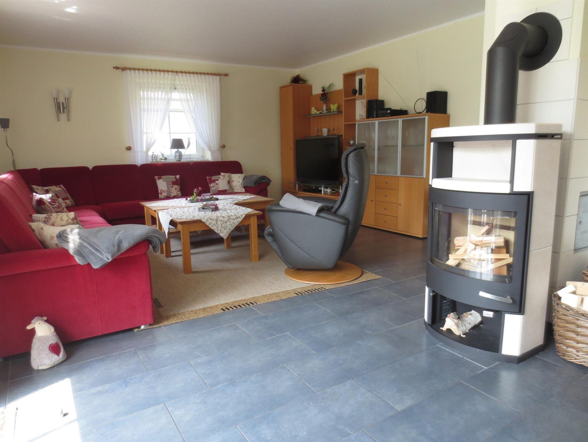 Großzügige Sitzecke mit zwei Couchtischen, großer Flachbildfernseher, DVD-Player, kl. Musikanlage. Der schöne Kaminofen vermittelt an kühlen Tagen eine wohlige Atmosphäre. Holz wird kostenlos gestellt. Urlaubslektüre und Spiele stehen bereit. Kostenloser WLAN-Internetzugang (Glasfaseranschluss).