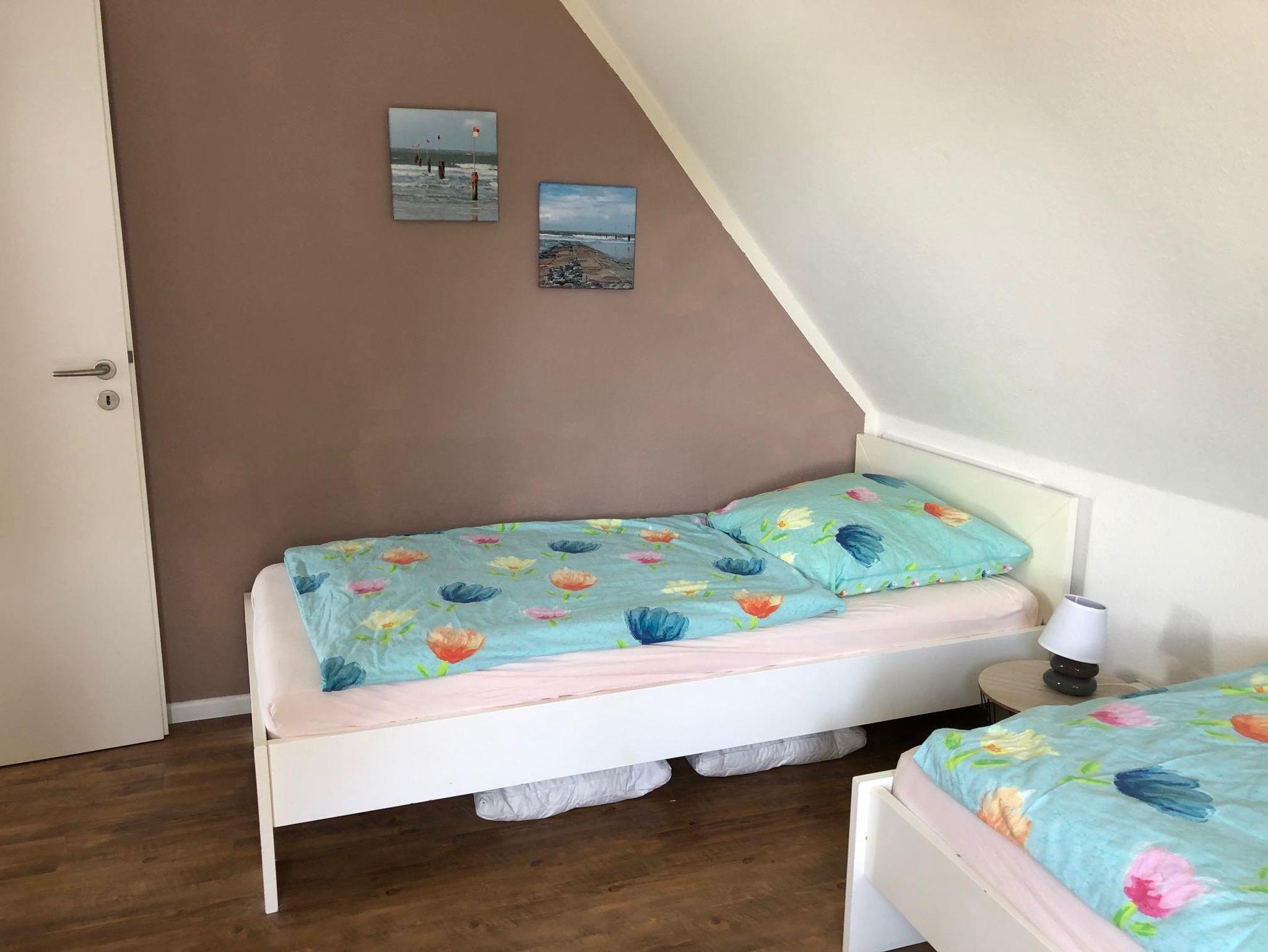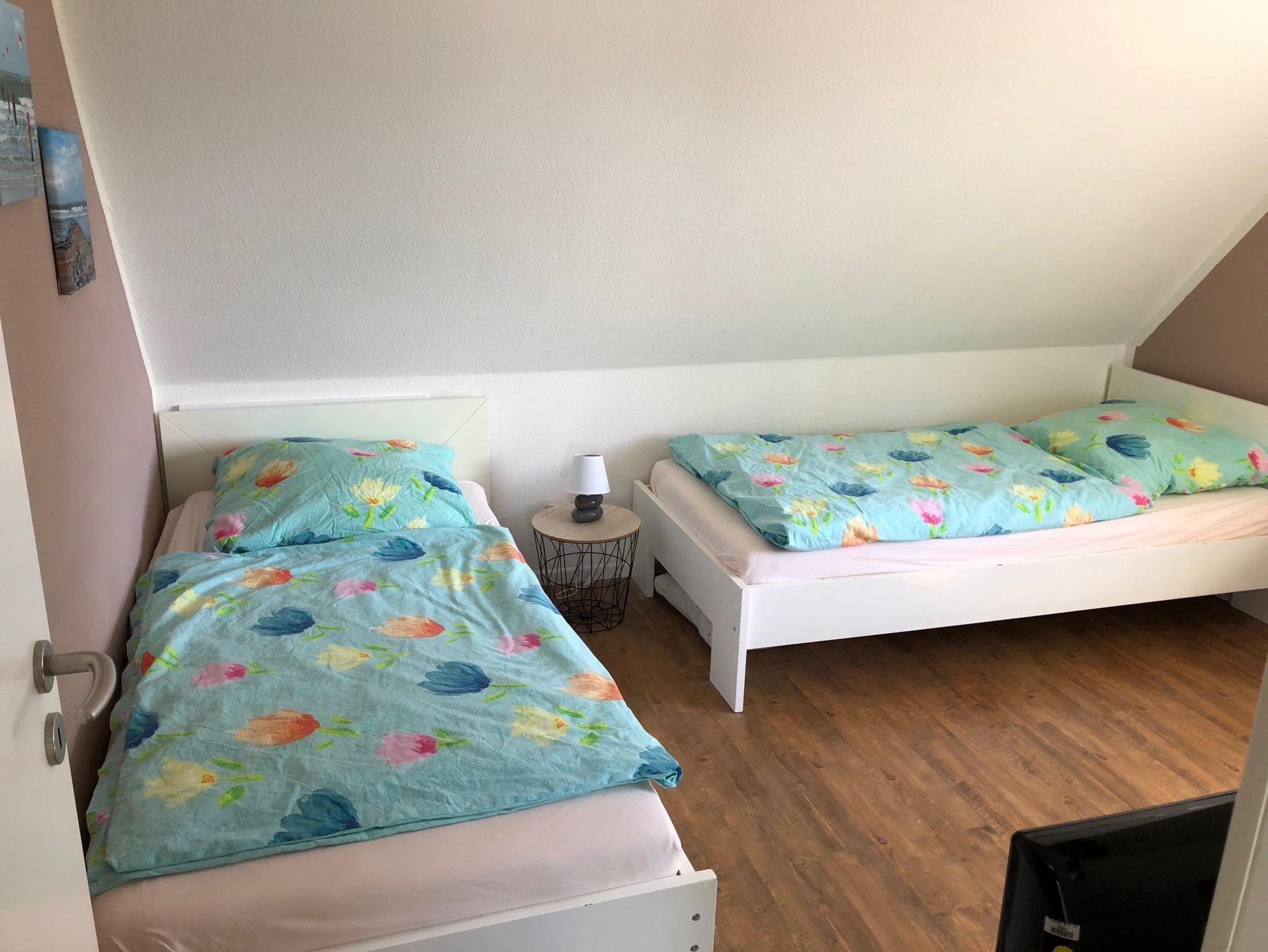 Obergeschoss: ein Schlafzimmer mit Doppelbett (180 x 200 cm - Einzelmatratzen) und Fernseher, ein Schlafzimmer mit 2 Einzelbetten (90 x 190 cm)