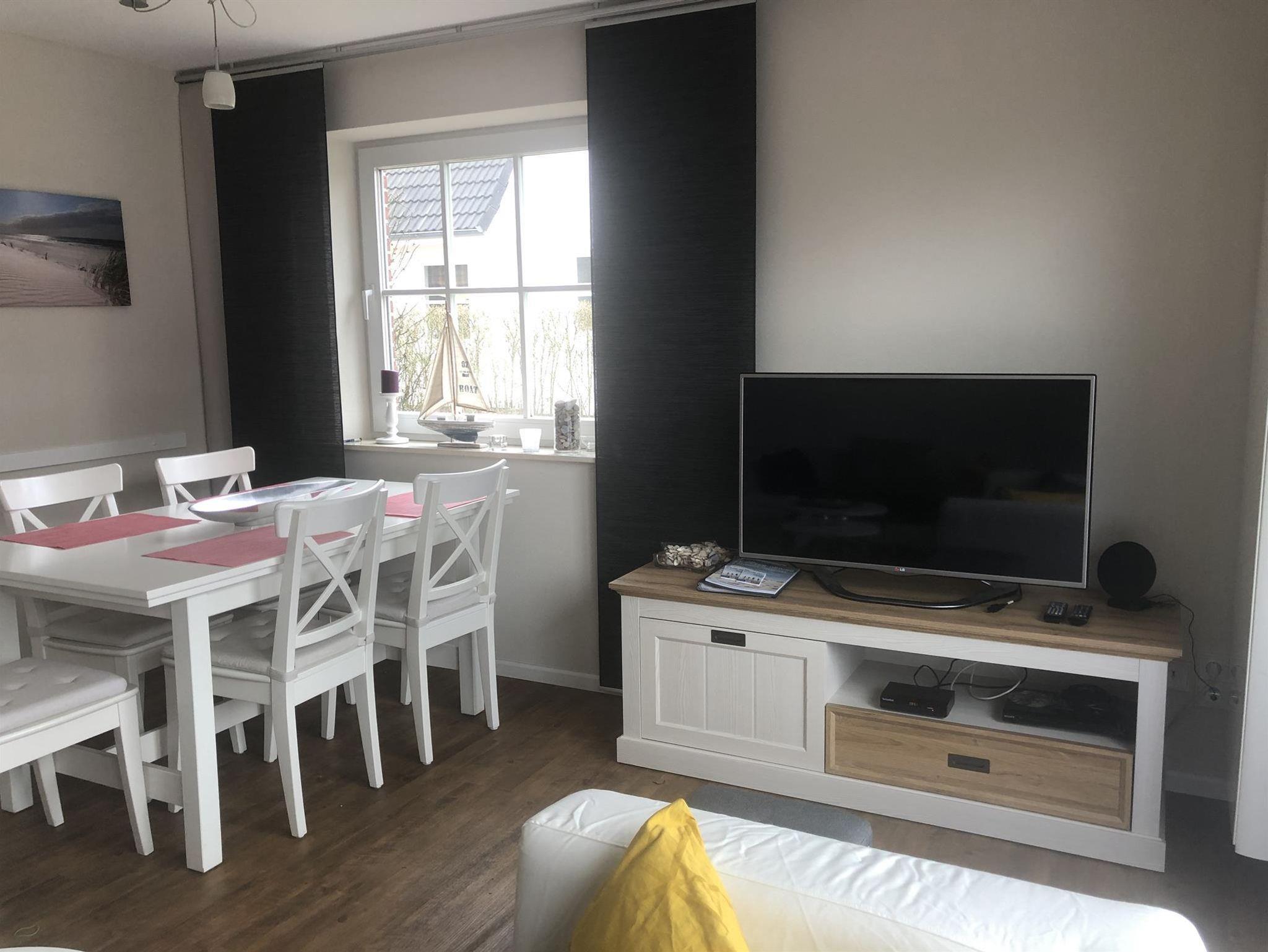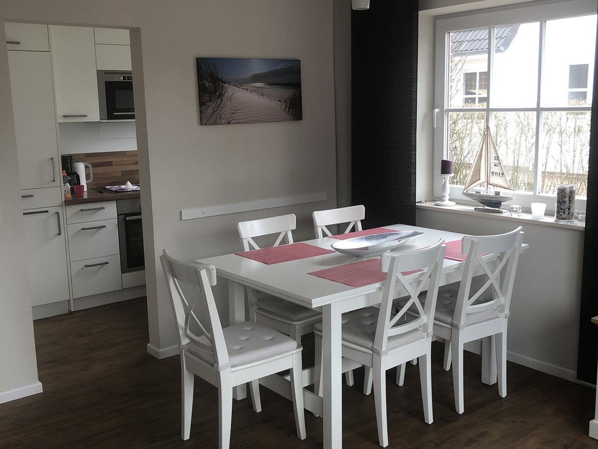 Erdgeschoss: Eingangsbereich, Wohn- & Essbereich mit Zugang zur Terrasse und seprater Küche, ein Duschbad/WC, ein Hauswirtschaftsraum. Auf der Terrasse befinden sich Gartenmöbel, zudem gibt es einen Gemeinschaftsgarten hinter dem Haus mit einem Strandkorb.