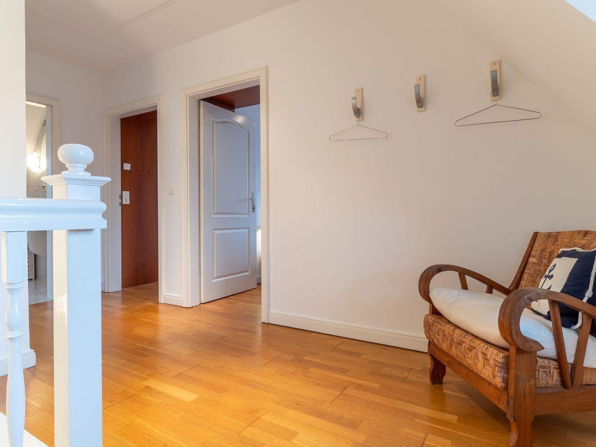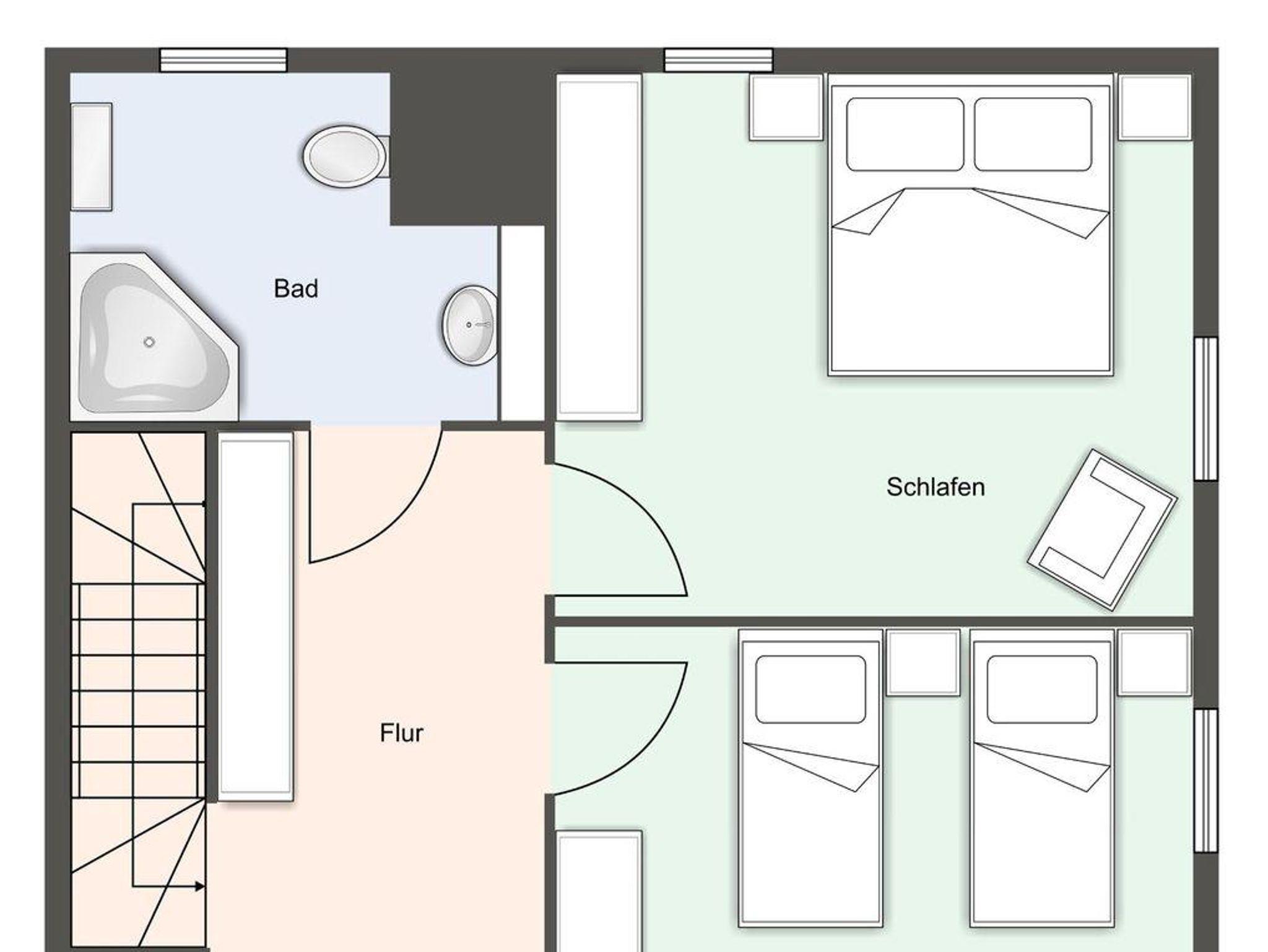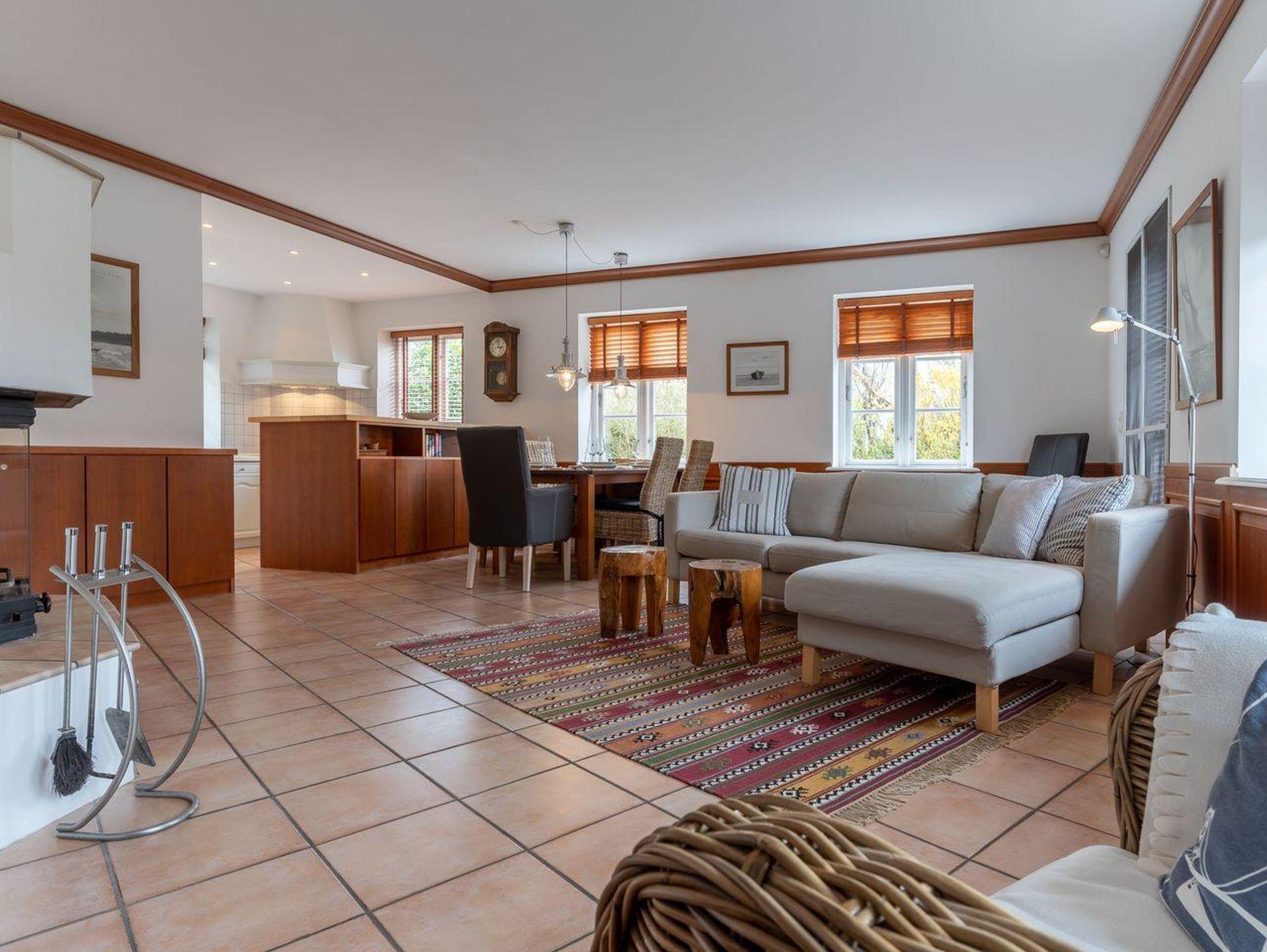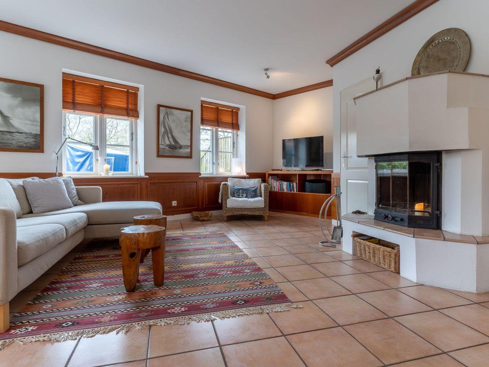Die Wohnfläche von 93m² verteilt sich auf zwei Ebenen: Erdgeschoss: heller, freundlicher Wohnraum (40 m²) mit offener Küche und Wohn-/Essbereich mit Kamin. Duschbad mit WC und Urinal, Abstellraum. Obergeschoss: zwei gemütliche Schlafzimmer (1 x Doppelbett 180 x 200 cm, 2x Einzelbetten 90 x 200 cm), geräumiges Badezimmer mit Eckbadewanne und Handtuchtrockner.