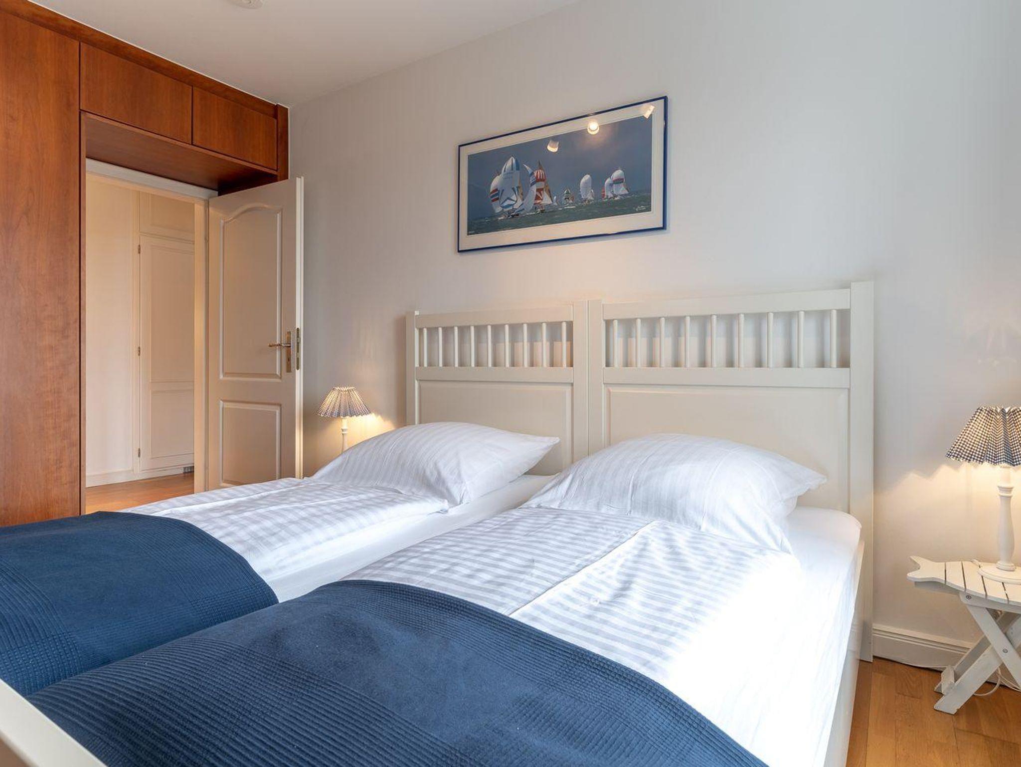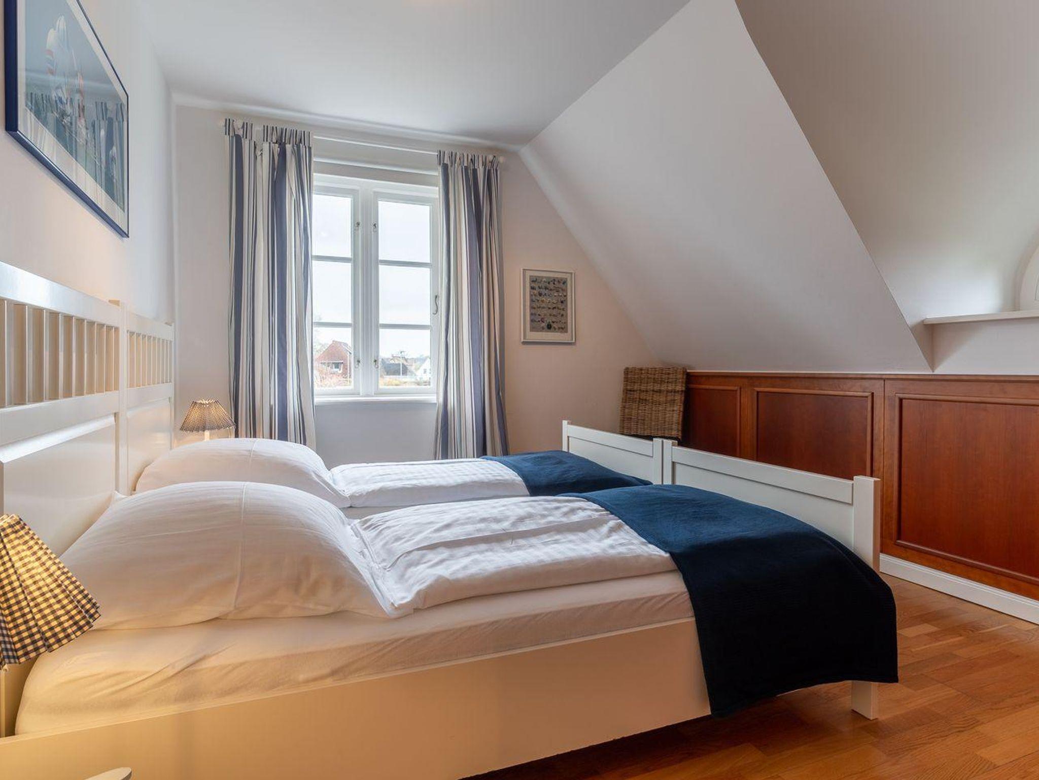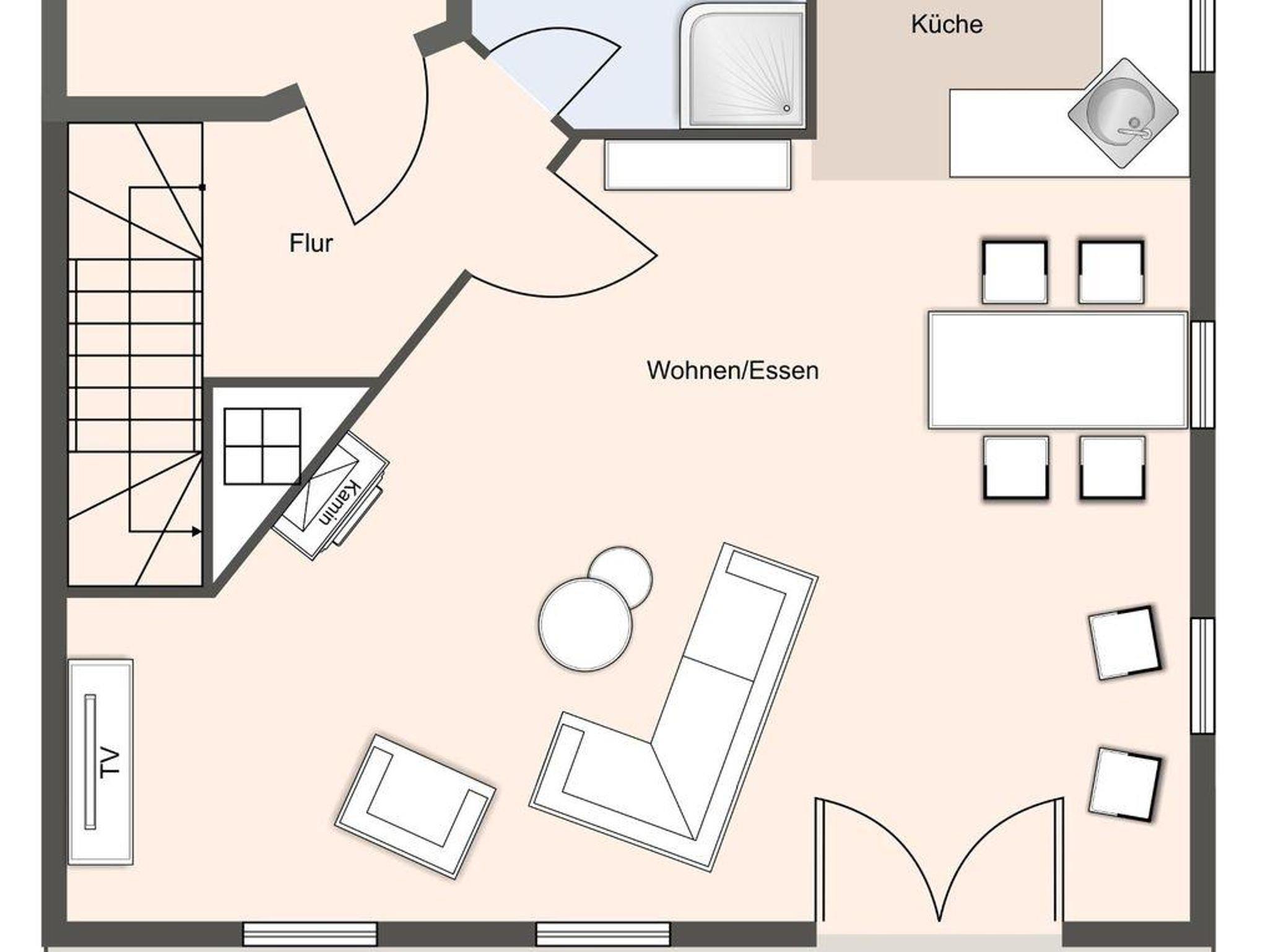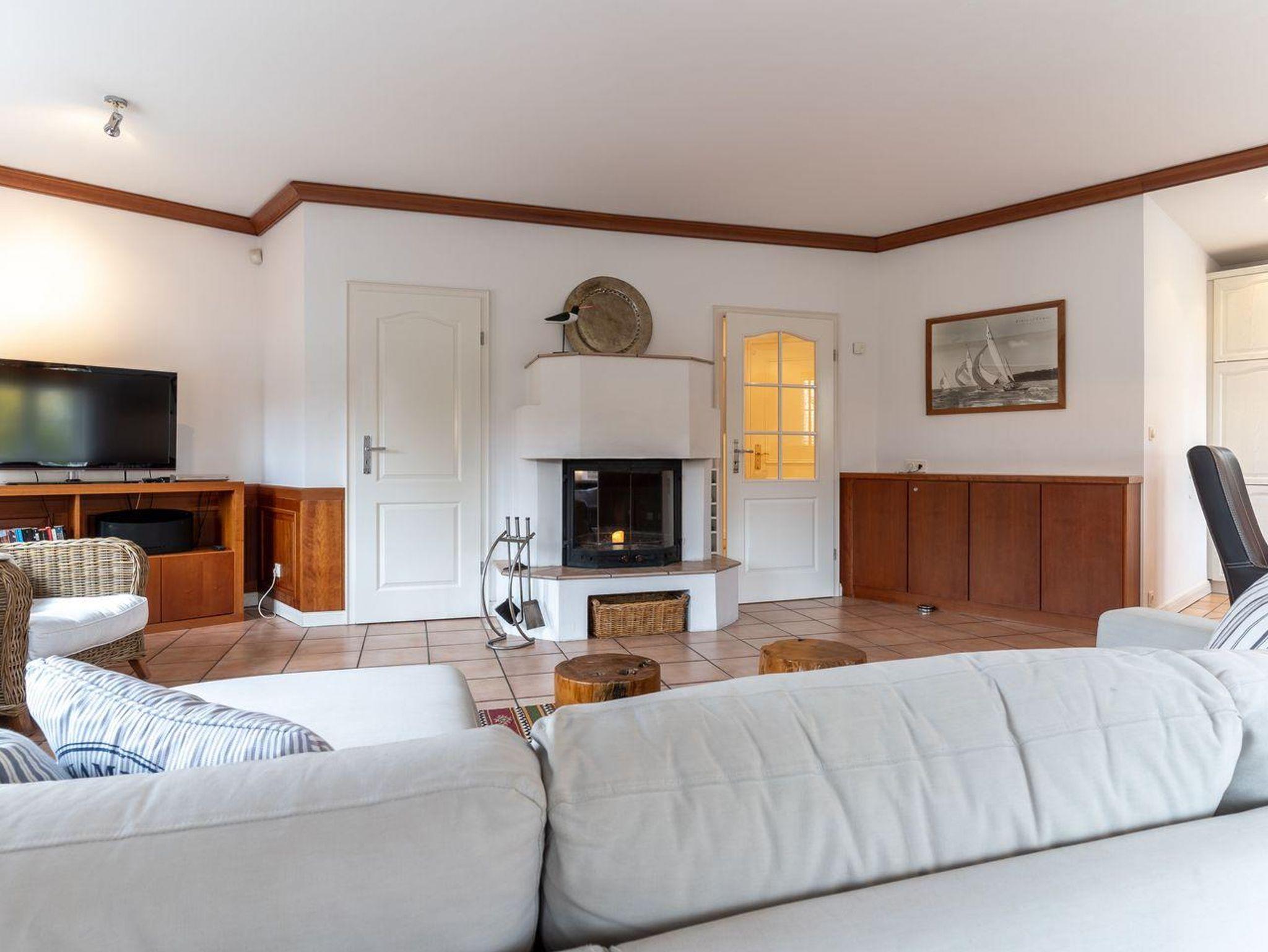 Die Wohnfläche von 93m² verteilt sich auf zwei Ebenen: Erdgeschoss: heller, freundlicher Wohnraum (40 m²) mit offener Küche und Wohn-/Essbereich mit Kamin. Duschbad mit WC und Urinal, Abstellraum. Obergeschoss: zwei gemütliche Schlafzimmer (1 x Doppelbett 180 x 200 cm, 2x Einzelbetten 90 x 200 cm), geräumiges Badezimmer mit Eckbadewanne und Handtuchtrockner.