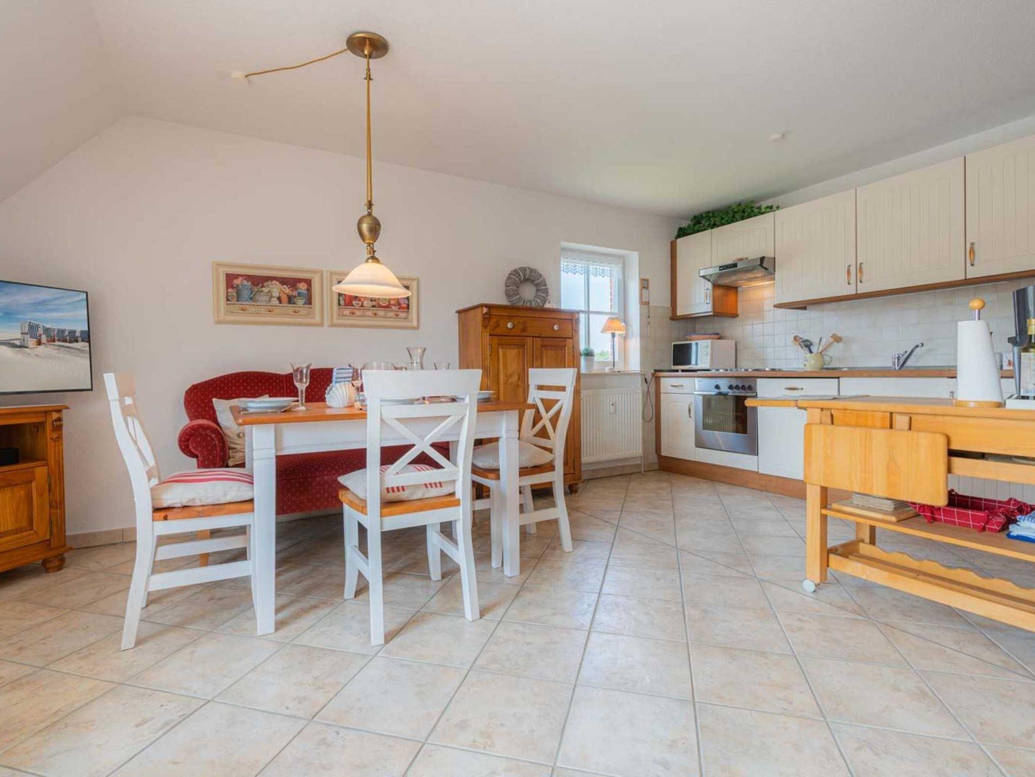 Wohnzimmer mit Wohnlandschaft, Ohrensessel mit Fußhocker, TV (Sat) mit Soundbar und Blueray-Player, Esstisch mit Sofa und 3 Stühlen. Direkter Zugang zum möblierten Balkon nach Süden. Offene Küche mit Induktionsherd, Backofen, Mikrowelle, Geschirrspüler und Kühlschrank mit Gefrierfach.