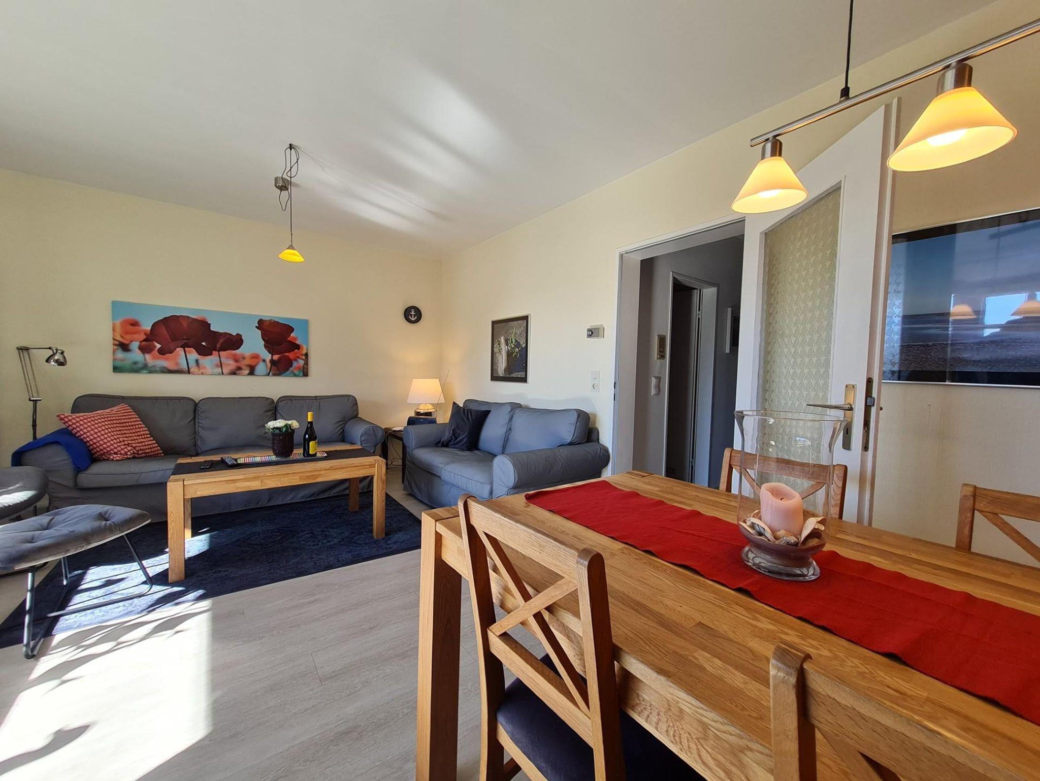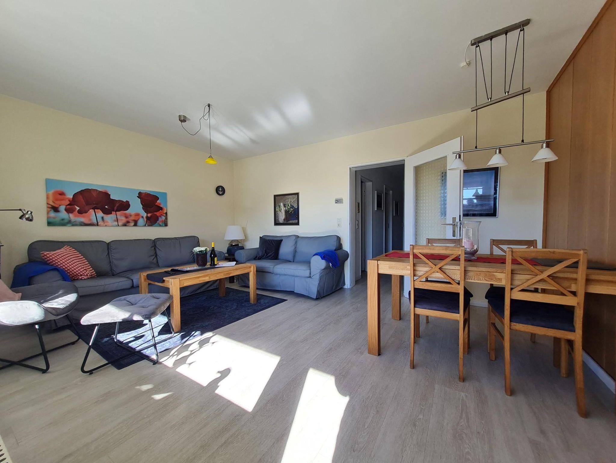Der gemütliche Wohnbereich mit bequemer Sitzgruppe, Essplatz und SAT-TV lädt zum Verweilen ein. Von hier aus gelangen Sie direkt auf den Balkon – perfekt für entspannte Stunden an der frischen Luft.