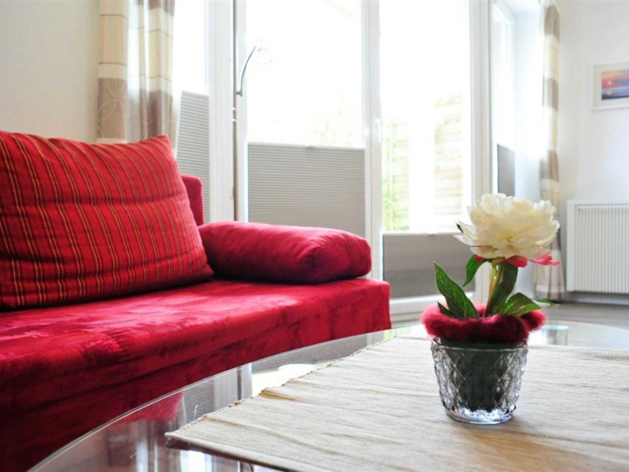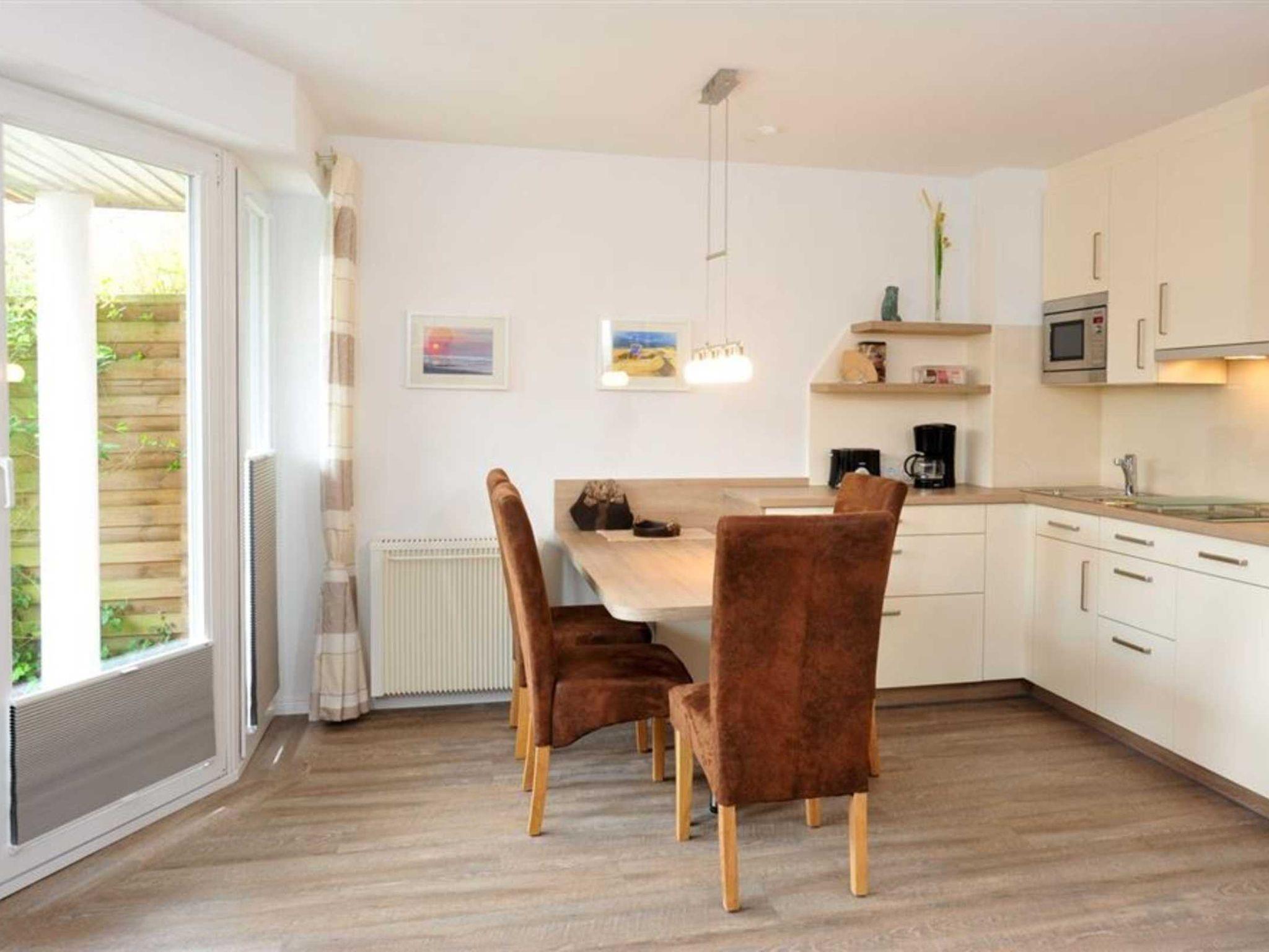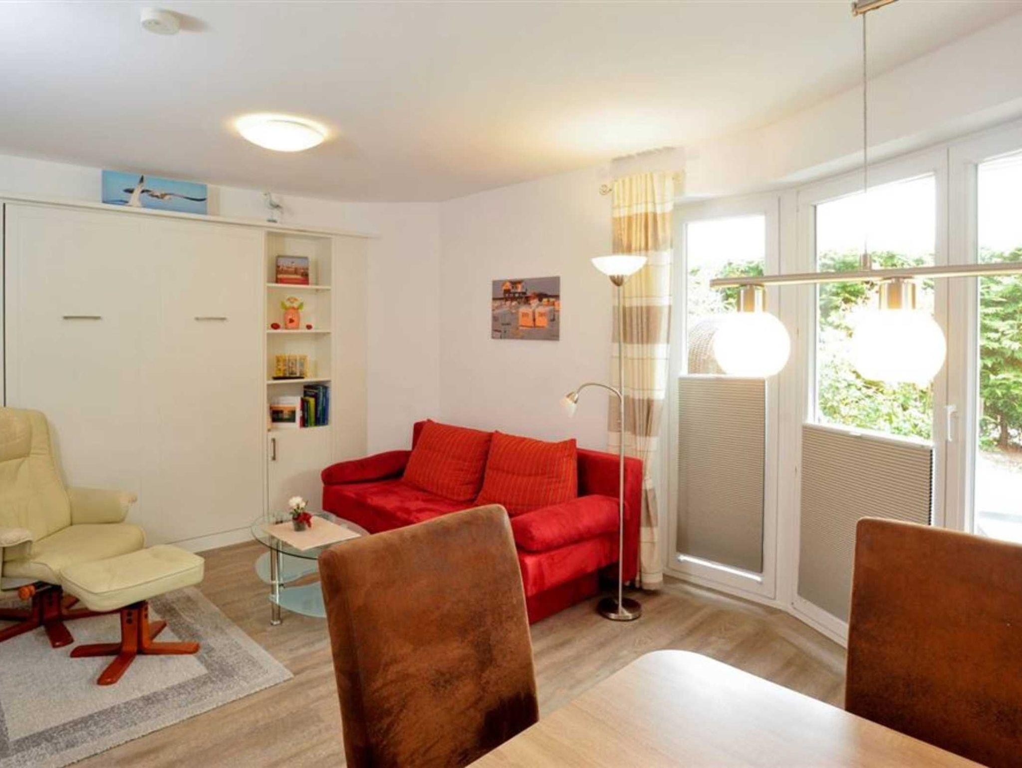 Wohn- und Schlafzimmer mit Sofa, Schrank-Doppelbett (140x200cm), Sessel, TV (Sat) und Esstisch mit 4 Stühlen. Direkter Zugang zur möblierten Terrasse mit Strandkorb nach Südosten. Moderne offene Küche mit Backofen, Mikrowelle, Geschirrspüler und Kühlschrank mit Gefrierfach.